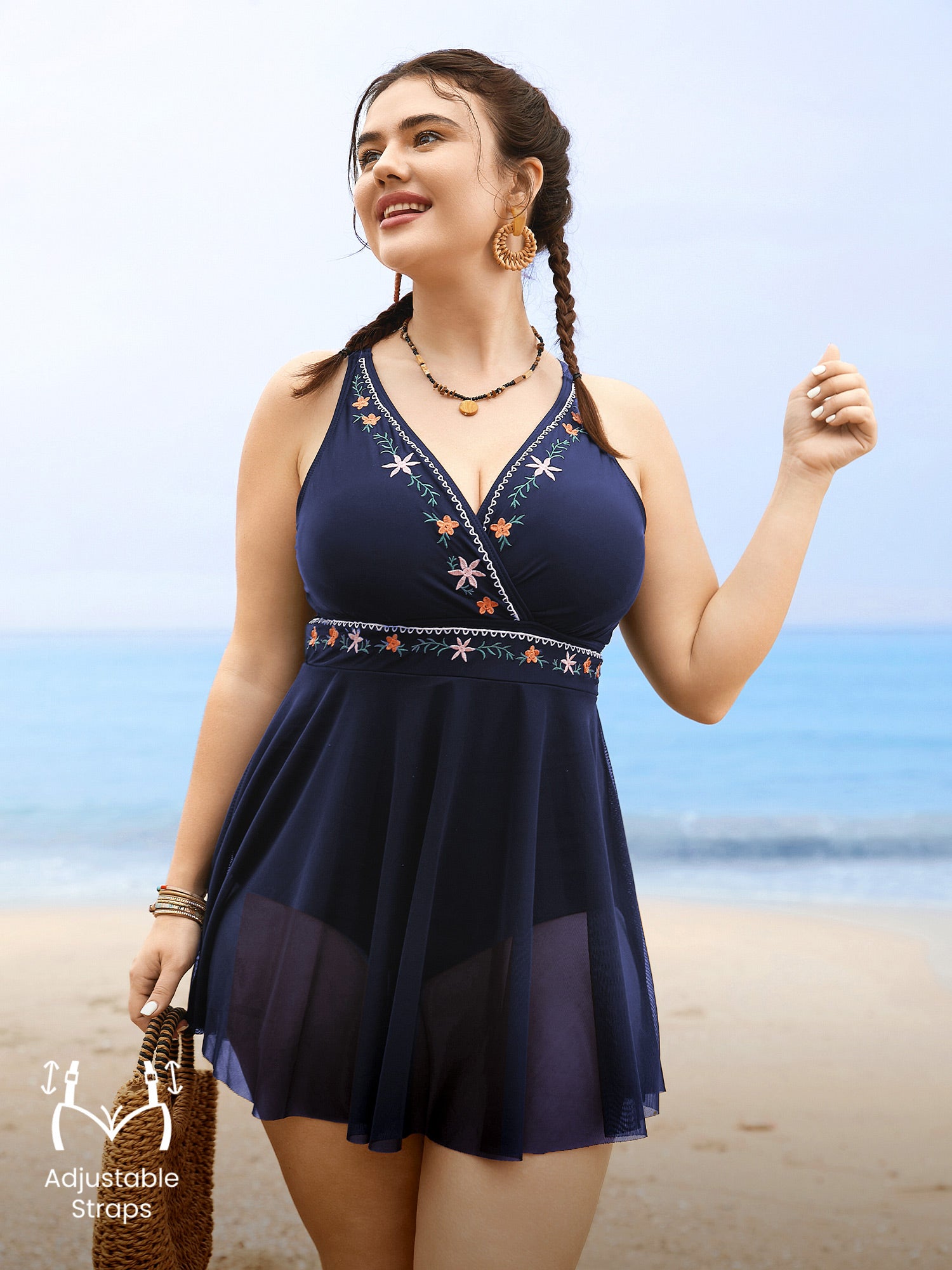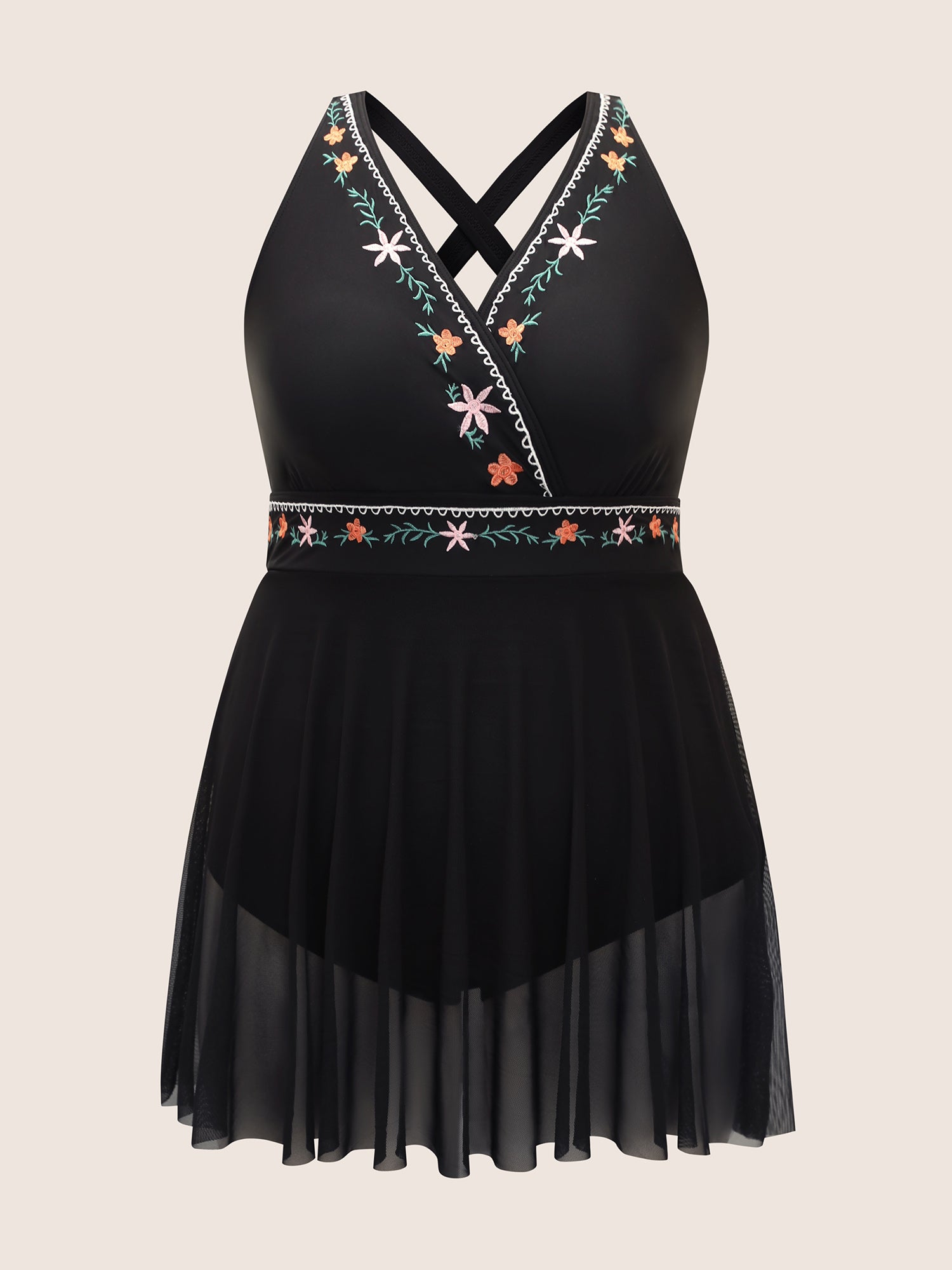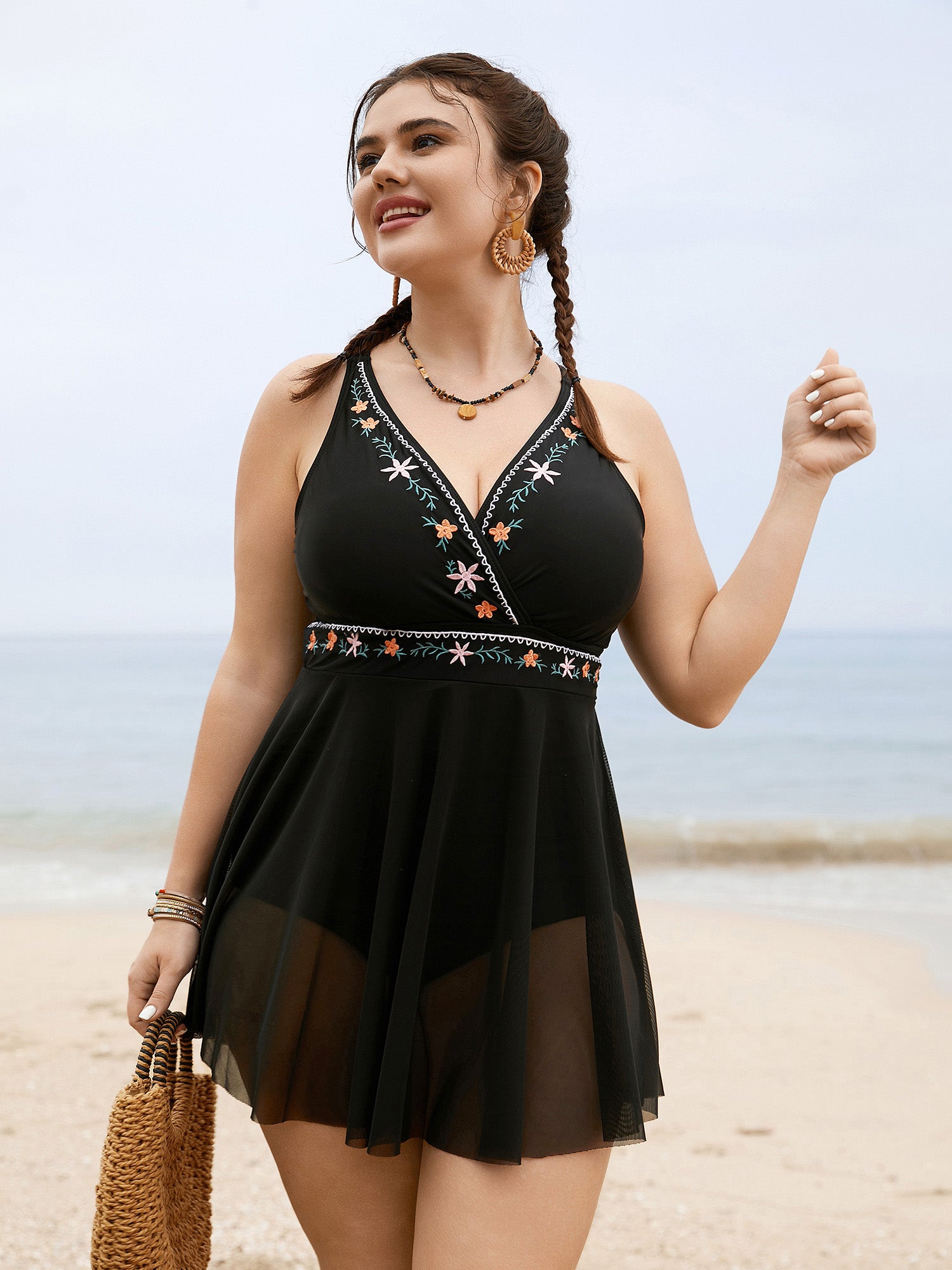 Shop Floral Embroidered Overlap Collar Swim Dress now and redefine your style with confidence at BloomChic. Tailored for mid and plus-size women. This trendy Swimwear Women, sizes 10-30. Color:Black,Indigo,ArmyGreen,RedViolet,Cyan;Style:Beach Vacation;Cup Type:Removable cups;Neckline:Overlap Collar;Sleeve Type:Sleeveless;Prints:Non;Details:Embroidered, See through;Pocket:No-pocket;Belt:No-belt;Chest pad:Removable Padding;Lining:Lining;Closure Type:Non