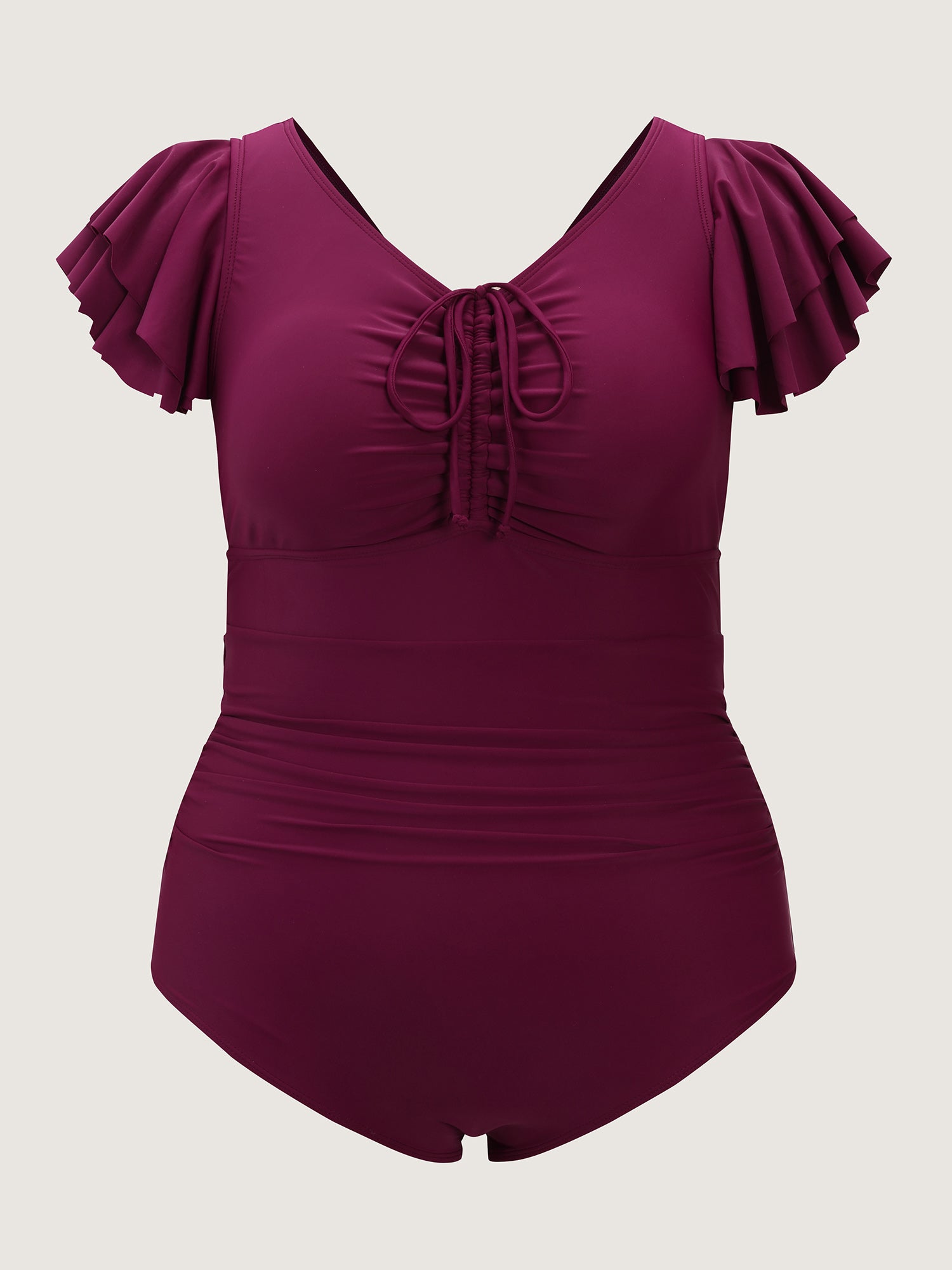 Shop Flutter Sleeve Adjustable Drawstring One Piece Swimsuit now and redefine your style with confidence at BloomChic. Tailored for mid and plus-size women. This trendy Swimwear Women, sizes 10-30. Color:Burgundy;Style:Resort;Cup Type:Removable cups;Neckline:Heart neckline;Sleeve Type:Ruffle Sleeve;Prints:Non;Details:Ruffles, Tie knot, Drawstring;Pocket:No-pocket;Belt:No-belt;Chest pad:Removable Padding;Lining:Lining;Closure Type:Non;Structural function:Adaptive-Fit,Tummy-Sculpt;Swimsuit types:One-Piece Triangle Swimsuit