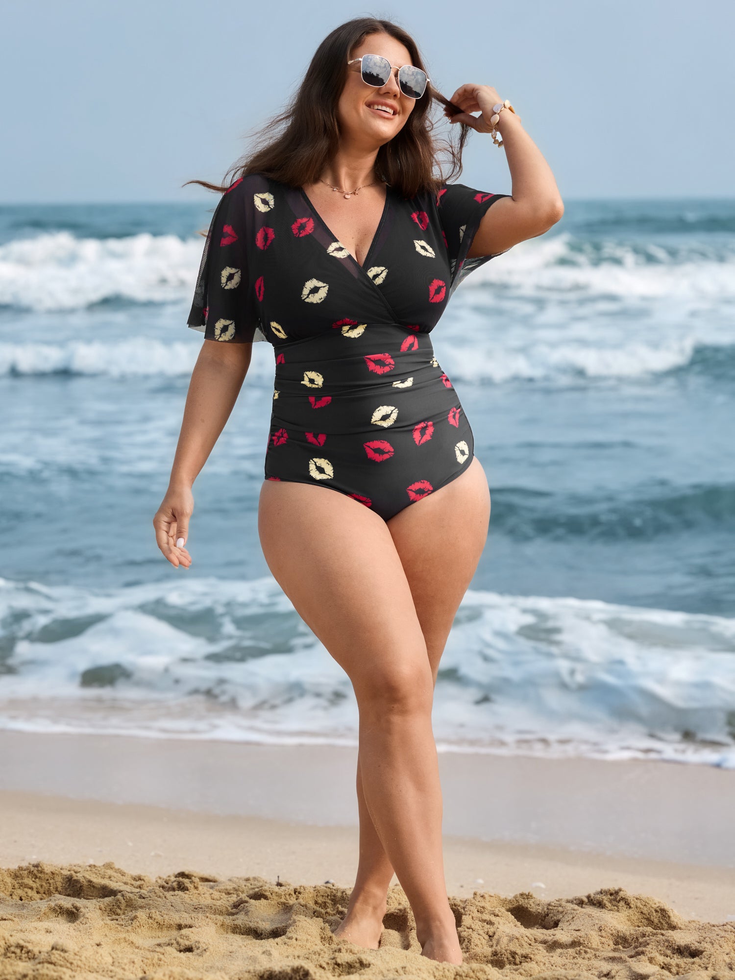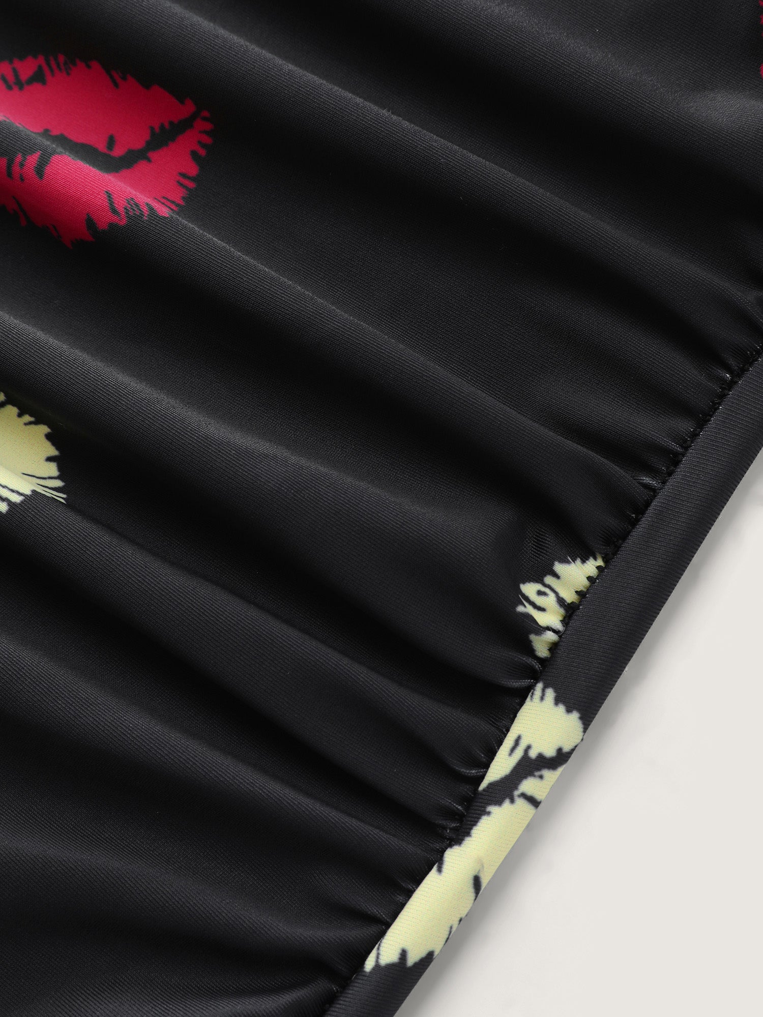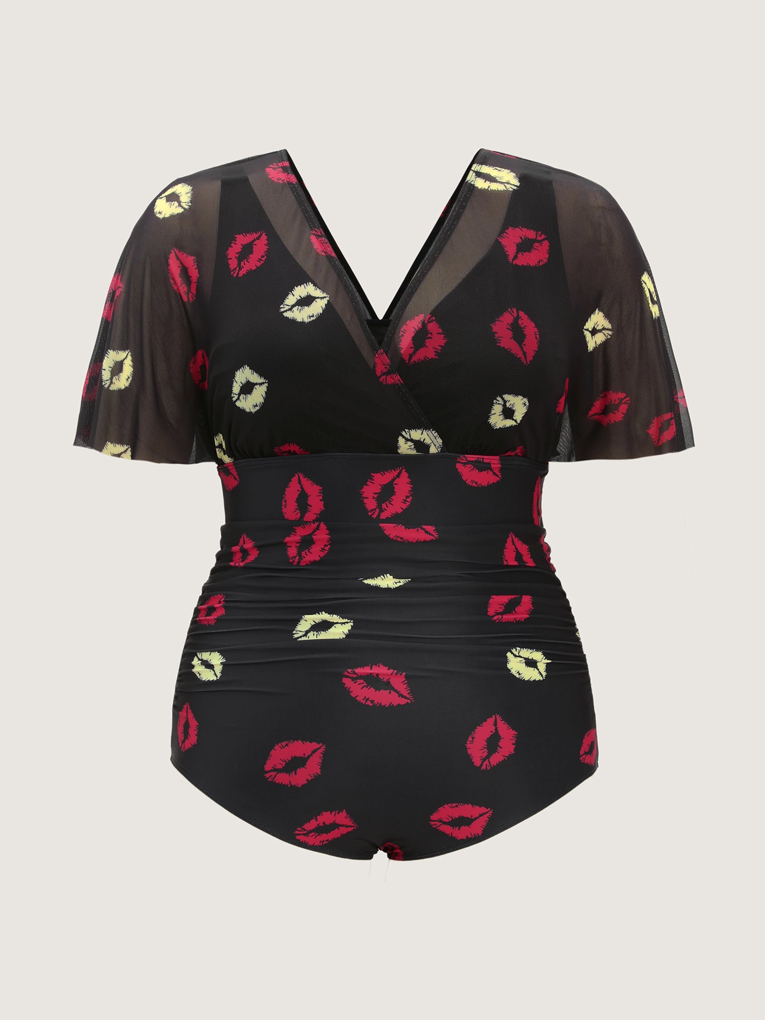 Shop Mesh Lip Pattern Ruched One-Piece Swimsuit now and redefine your style with confidence at BloomChic. Tailored for mid and plus-size women. This trendy Swimwear Women, sizes 10-30. Color:Black;Style:Resort;Coverage:Full;Neckline:Overlap Collar;Sleeve Type:Raglan sleeve;Prints:Non;Details:Ruffles, Gathered, See through;Pocket:No-pocket;Belt:No-belt;Chest pad:Removable Padding;Lining:Lining;Closure Type:Non;Structural function:Tummy-Sculpt,Adaptive-Fit