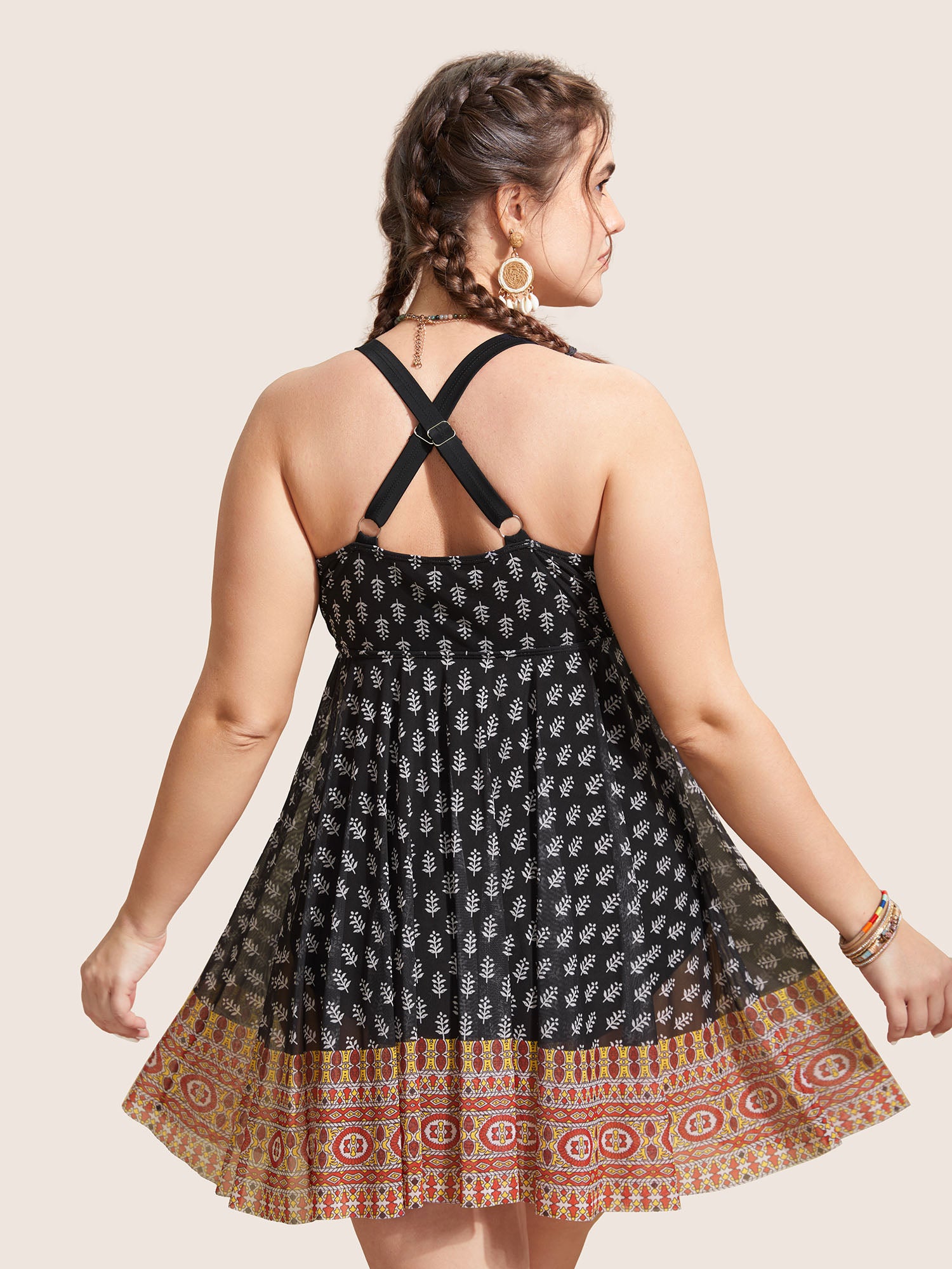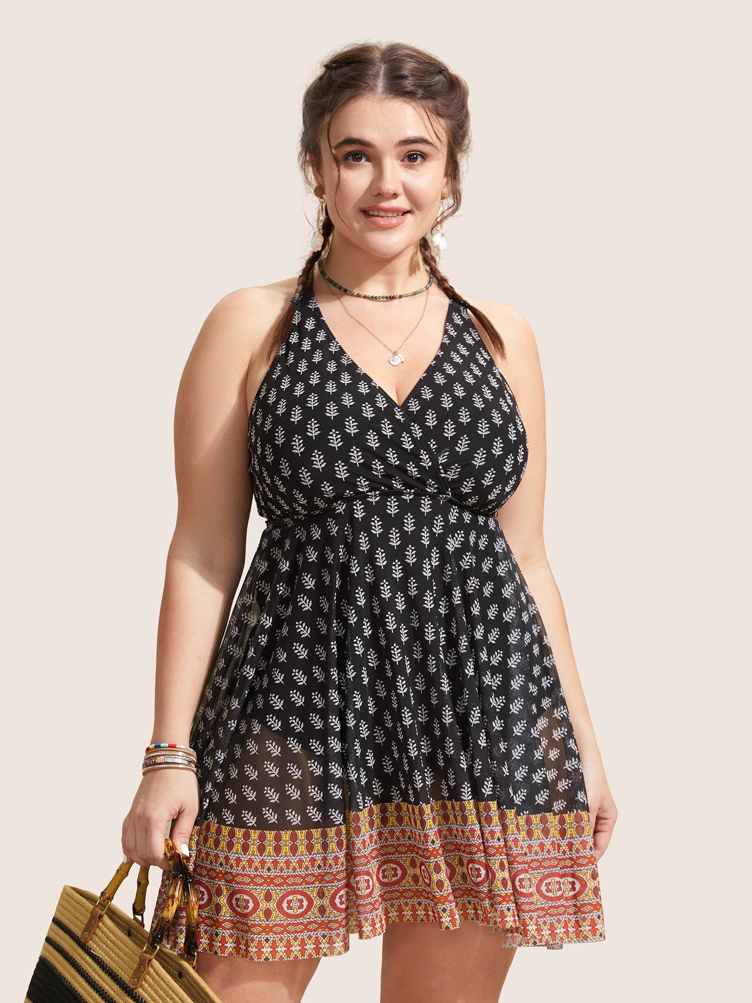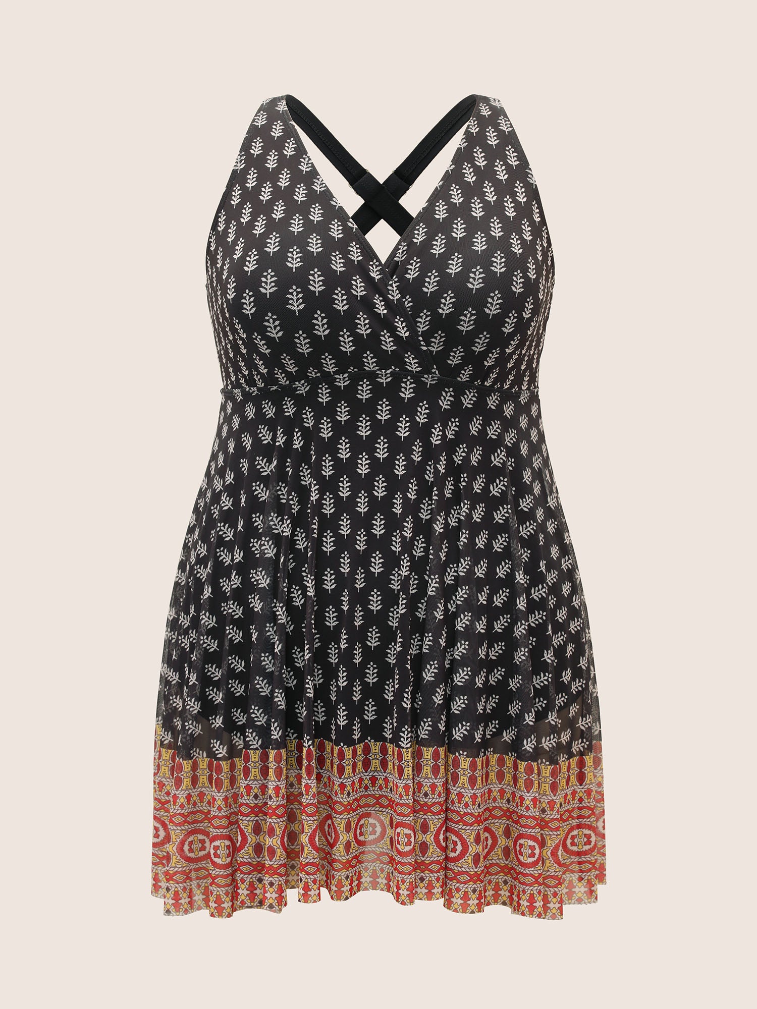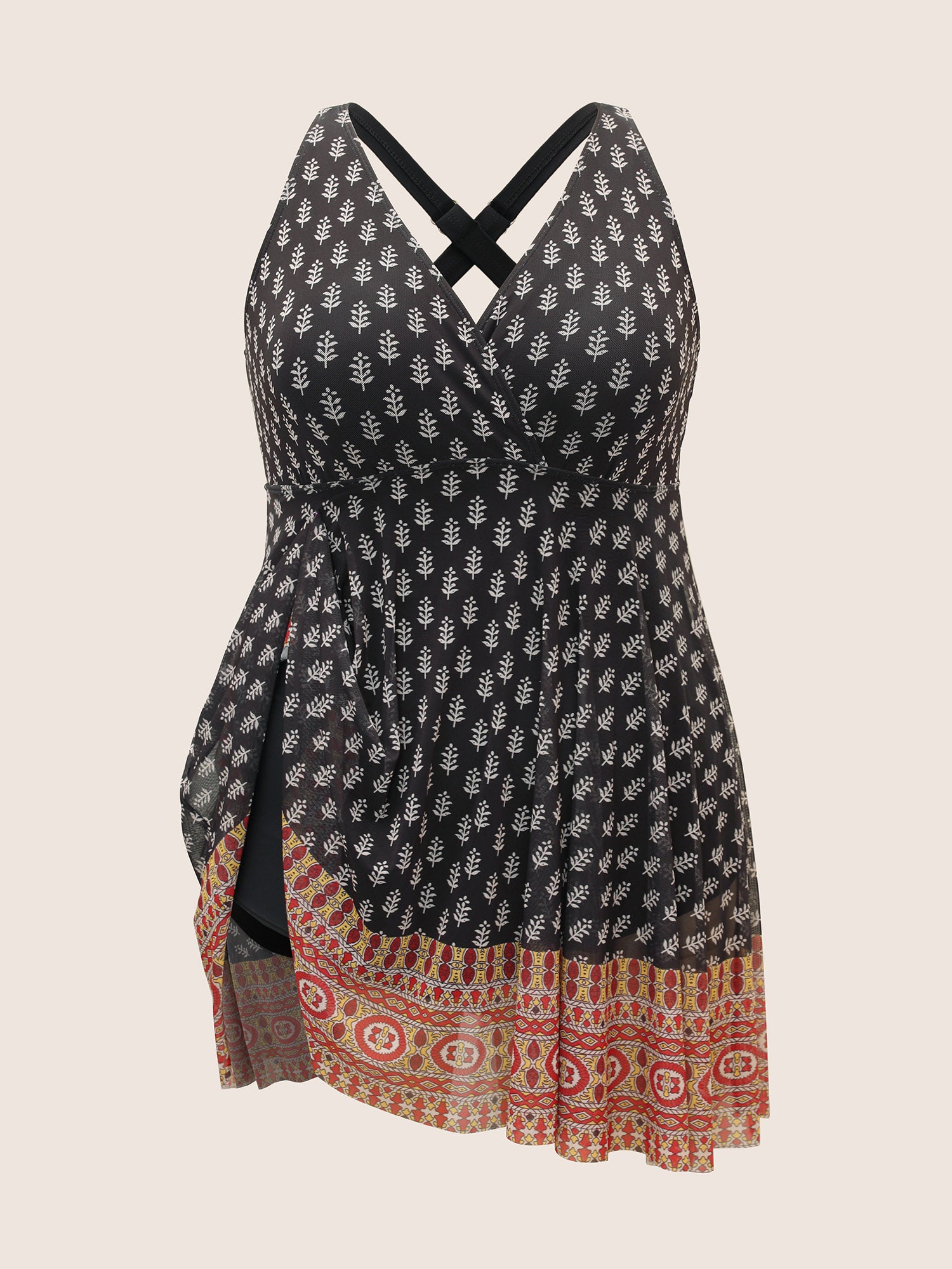 Shop Overlap Collar Boho Print Patchwork Swim Dress now and redefine your style with confidence at BloomChic. Tailored for mid and plus-size women. This trendy Swimwear Women, sizes 10-30. Color:Black,Deepred,ArmyGreen;Style:Beach Vacation;Cup Type:Removable cups;Neckline:Overlap Collar;Sleeve Type:Sleeveless;Prints:Bohemian print;Details:Overlapping, Tiered;Pocket:No-pocket;Belt:No-belt;Chest pad:Removable Padding;Lining:Lining;Closure Type:Non