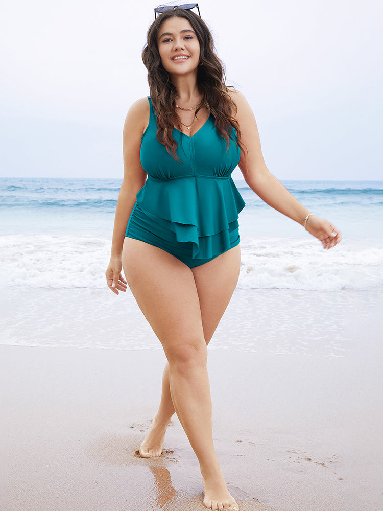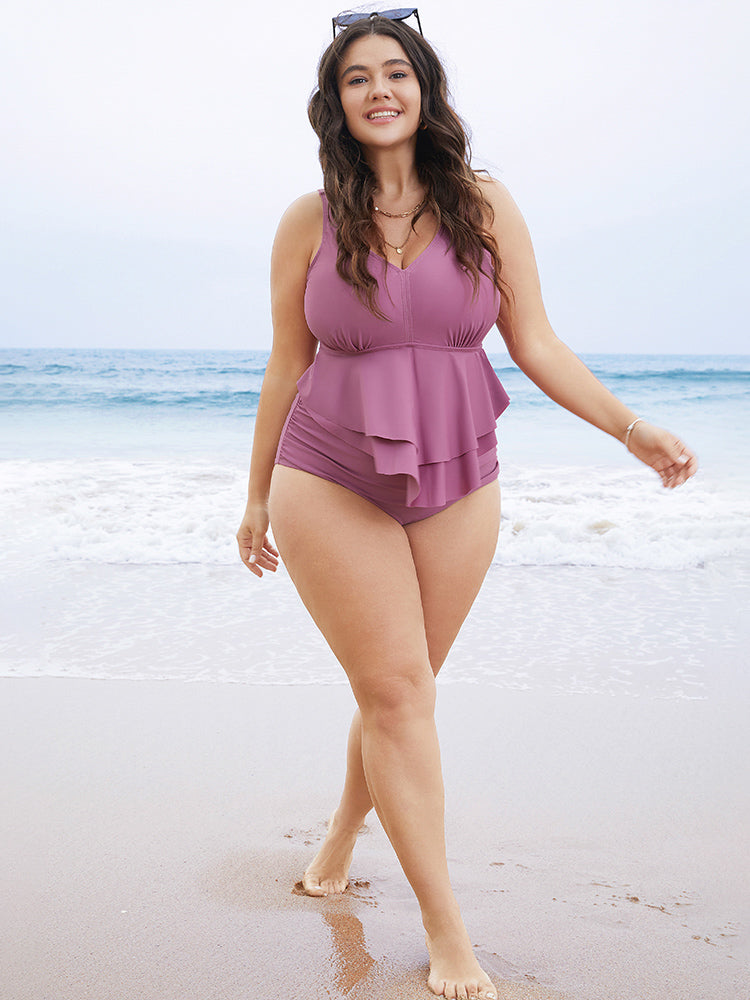 Shop Solid Sculpt Waist Patchwork Ruffle Tiered One Piece Swimsuit now and redefine your style with confidence at BloomChic. Tailored for mid and plus-size women. This trendy Swimwear Women, sizes 10-30. Color:Lilac,Black,Teal;Style:Vacation;Bra Type:Wireless;Coverage:Full;Neckline:V-neck;Sleeve Type:Sleeveless;Pattern Type:Plain;Details:Ruffles, Tiered, Plain, Adjustable Straps, Tummy control;Pocket:No-pocket;Belt:No-belt;Chest pad:Removable Padding;Lining:Lining
