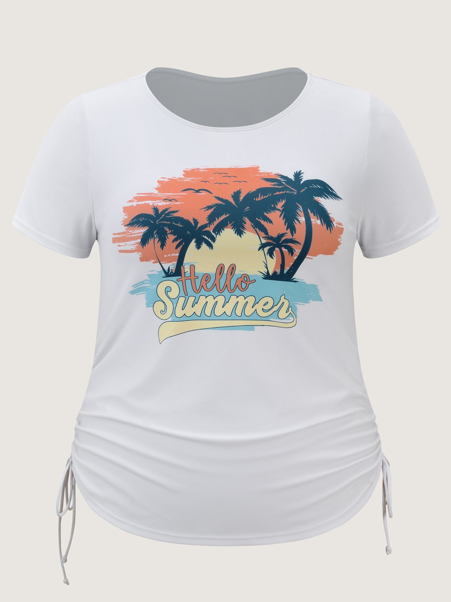 Shop Sunkissed Pattern Side Drawstring Swim Top now and redefine your style with confidence at BloomChic. Tailored for mid and plus-size women. This trendy Swimwear Women, sizes 10-30. Color:Optic White;Style:Resort;Cup Type:Fixed cups;Coverage:Full;Pattern Type:Tropical;Prints:Landscape pattern;Details:Drawstring;Pocket:No-pocket;Belt:No-belt;Chest pad:Non-removable padding;Structural function:Bust-Lift;Swimsuit types:Tankini;Functional Fabric:Chlorine Resistant,UPF 50 Sun Protection