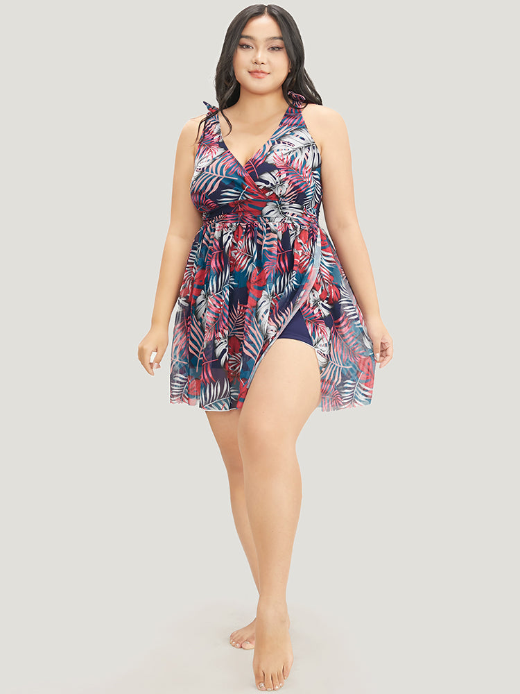 Tropical Print Bow Sculpt Waist Split Swim Dress