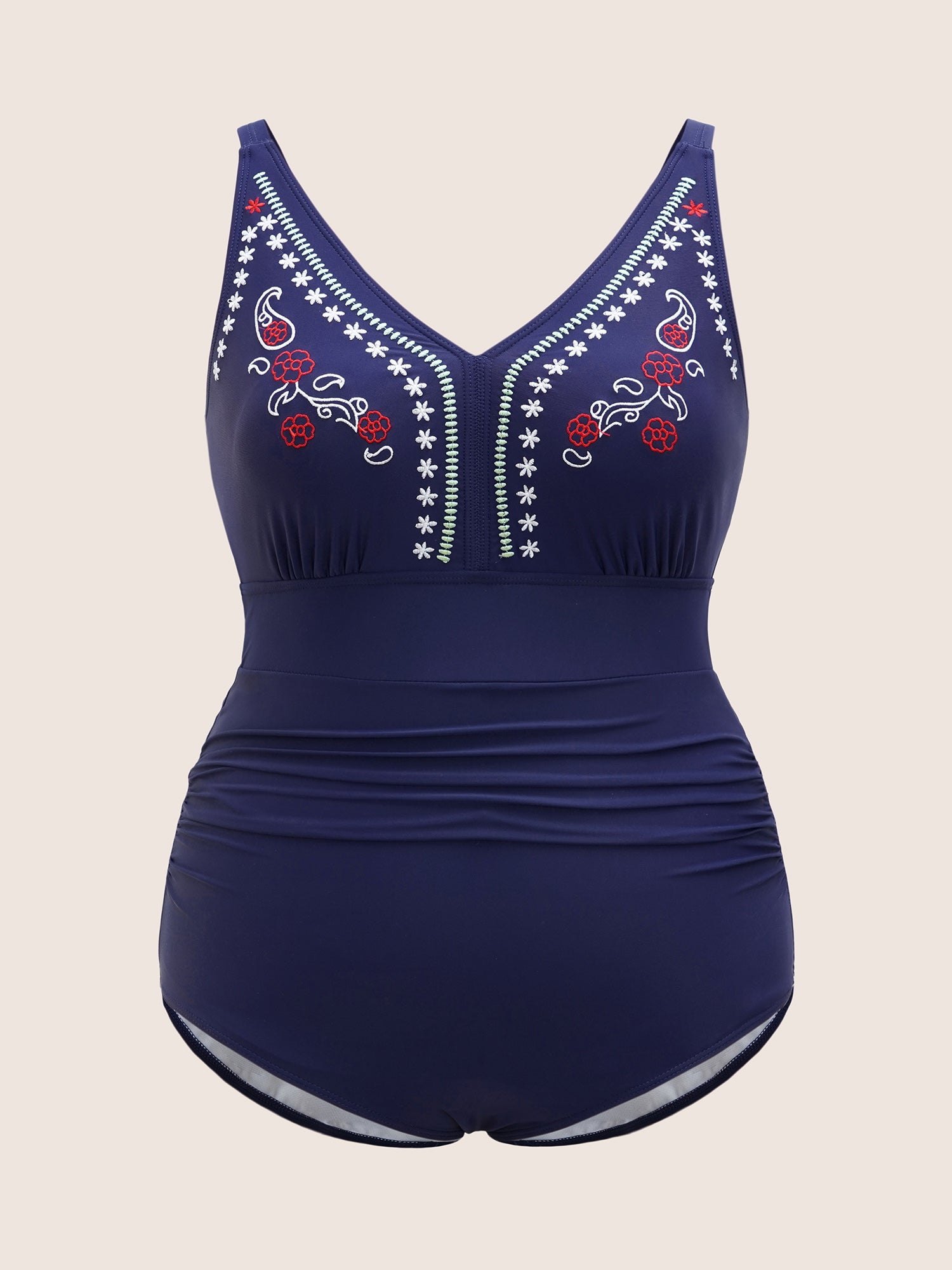 Shop V Neck Floral Embroidered Ruched One Piece Swimsuit now and redefine your style with confidence at BloomChic. Tailored for mid and plus-size women. This trendy Swimwear Women, sizes 10-30. Season:Summer;Color:Indigo;Style:Beach;Cup Type:Removable cups;Waist Design:High Rise;Neckline:V-neck;Sleeve Type:Sleeveless;Pattern Type:Natural Flowers;Prints:Floral;Details:Embroidered, Gathered;Pocket:No-pocket;Belt:No-belt;Chest pad:Removable Padding;Lining:Lining;Closure Type:Non