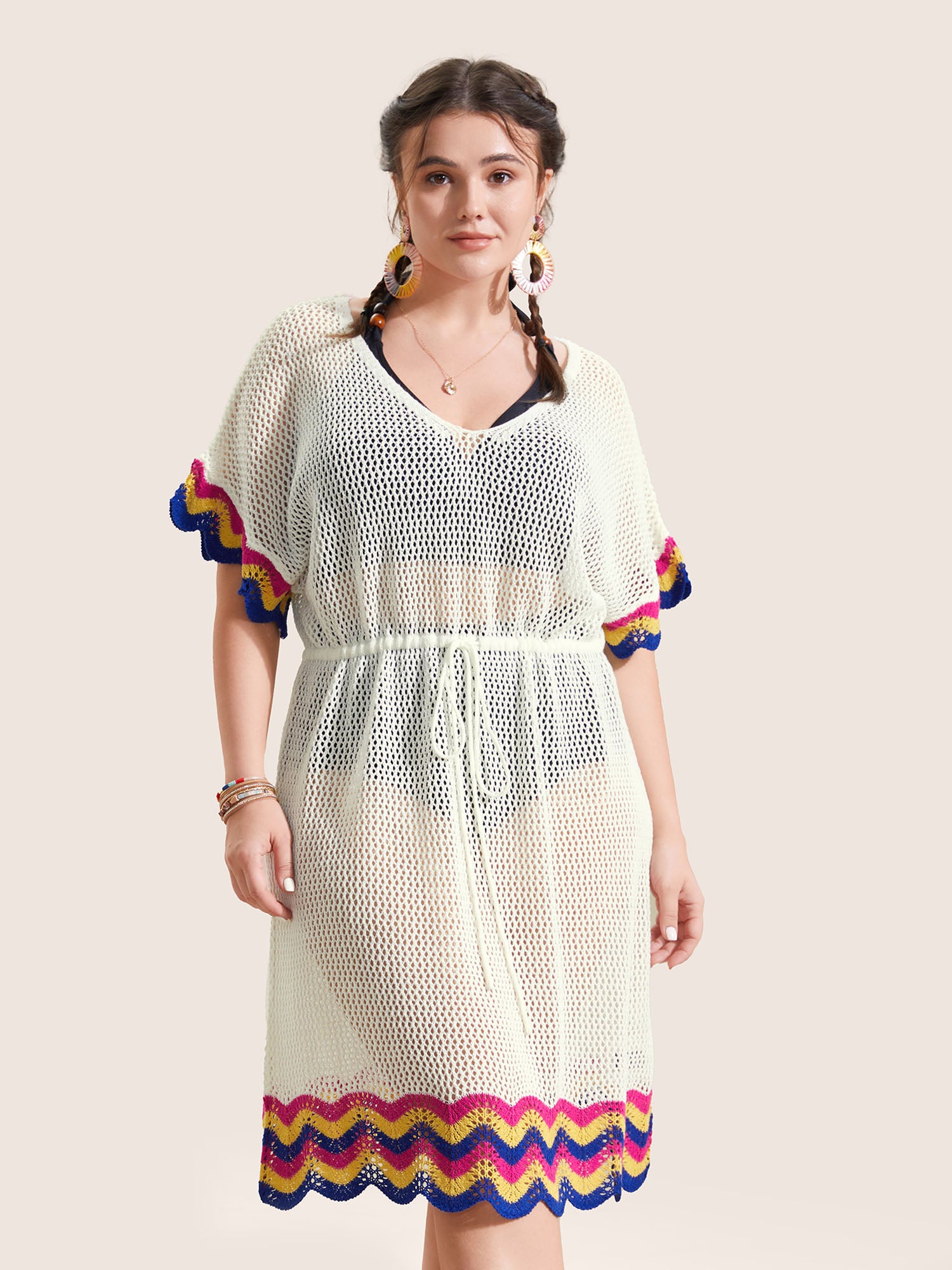 Deep V Neck Contrast Striped Drawstring Swim Cover Up