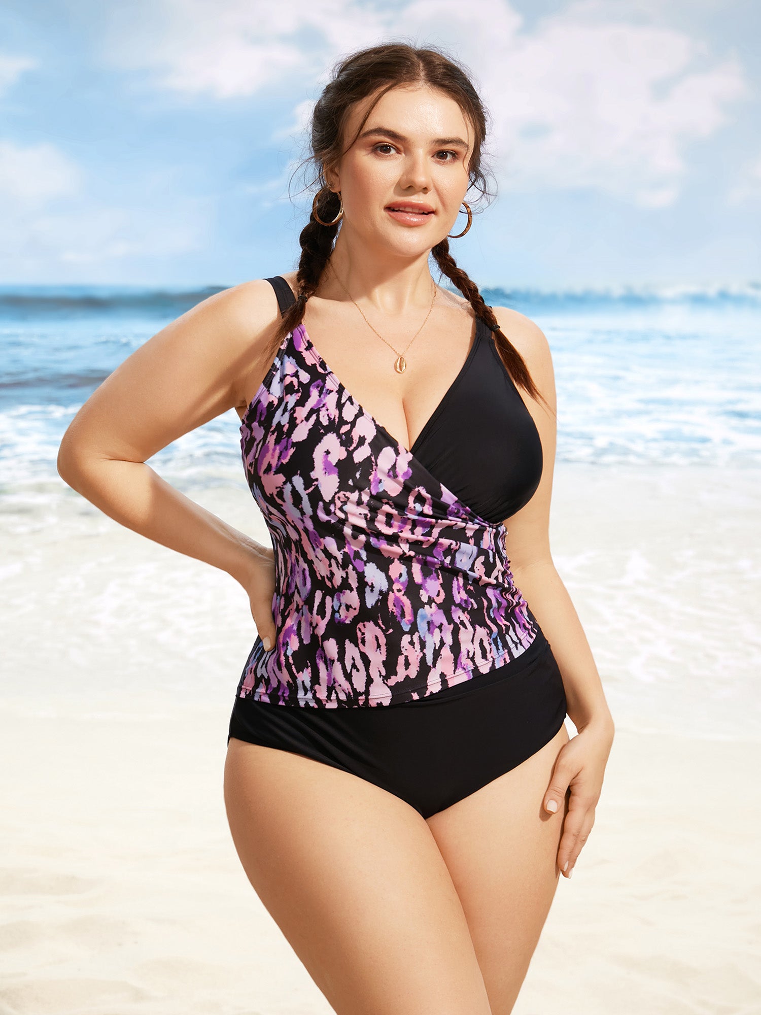 Bust-Friendly Ties Shell Print Swim Top