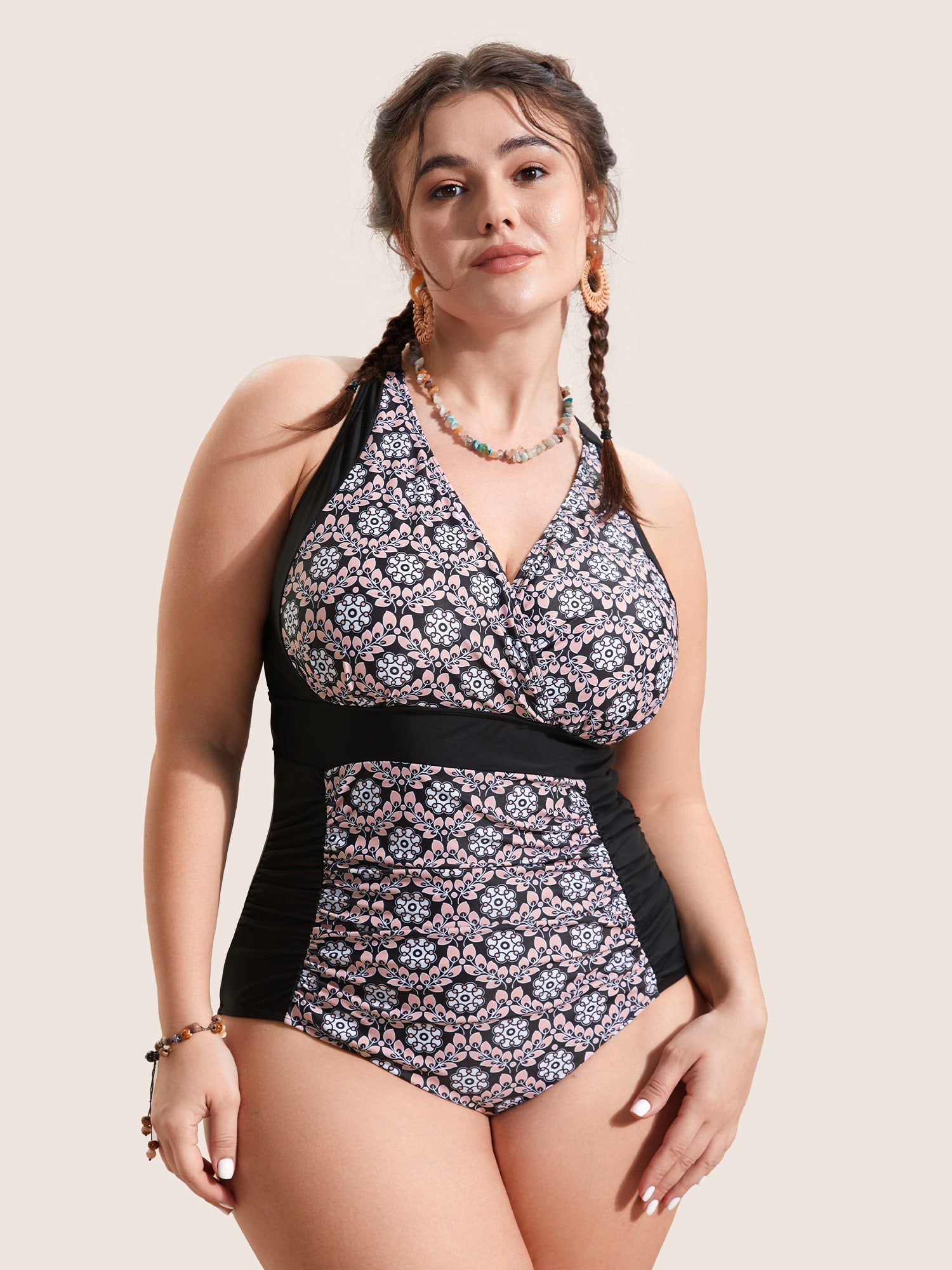 Overlap Collar Boho Print Patchwork One Piece Swimsuit