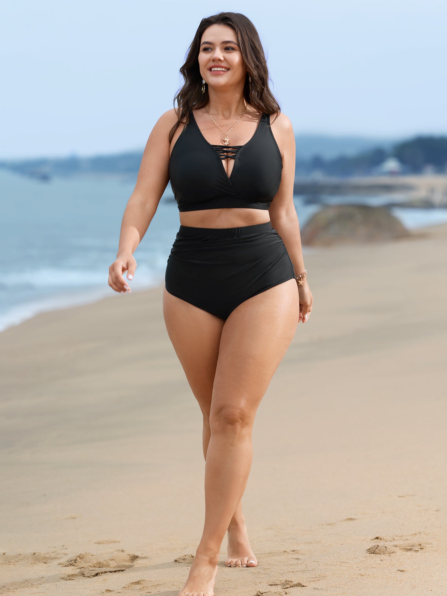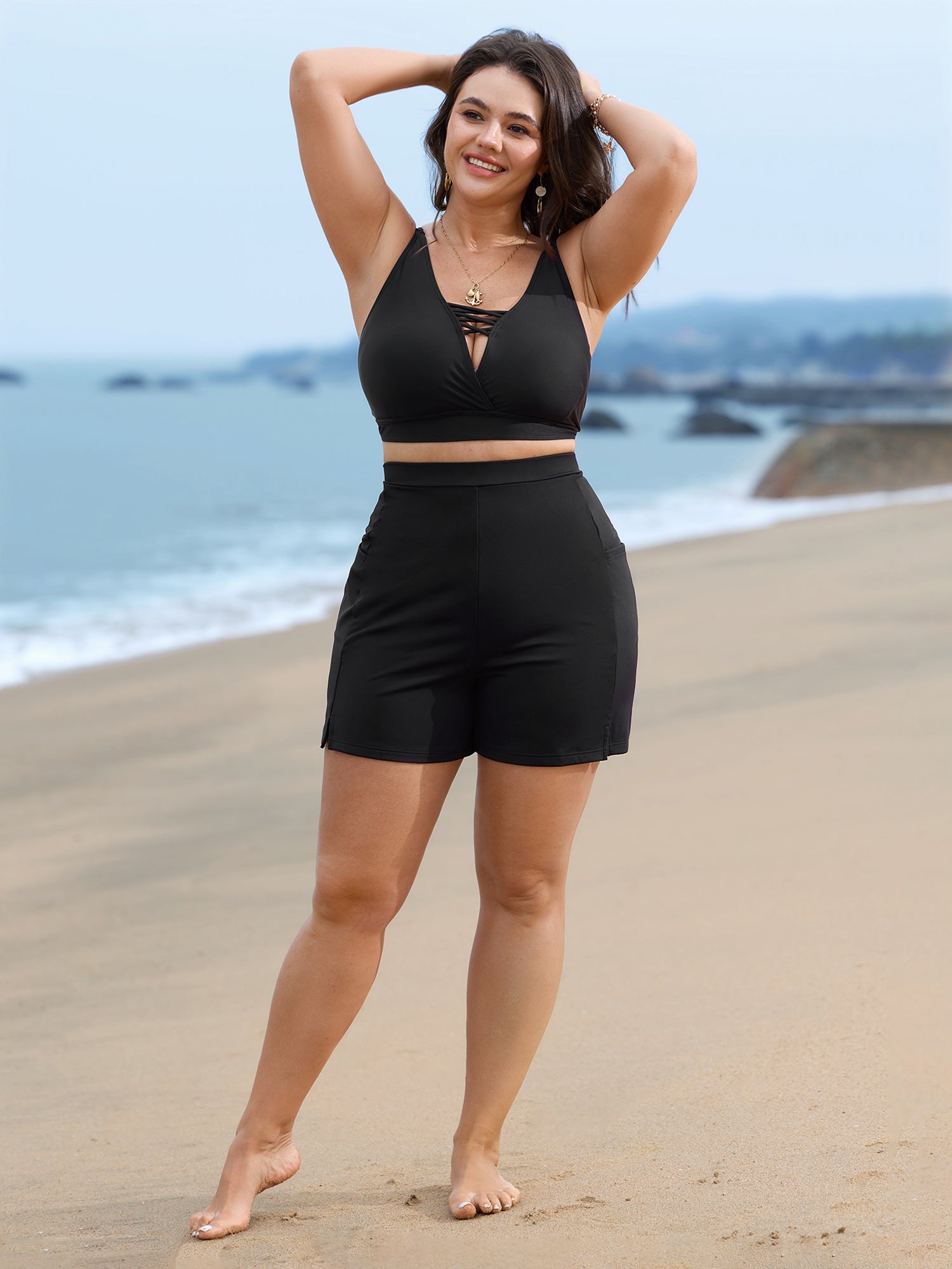Laser Cut Surplice Neck Waist-Cinched Swim Dress