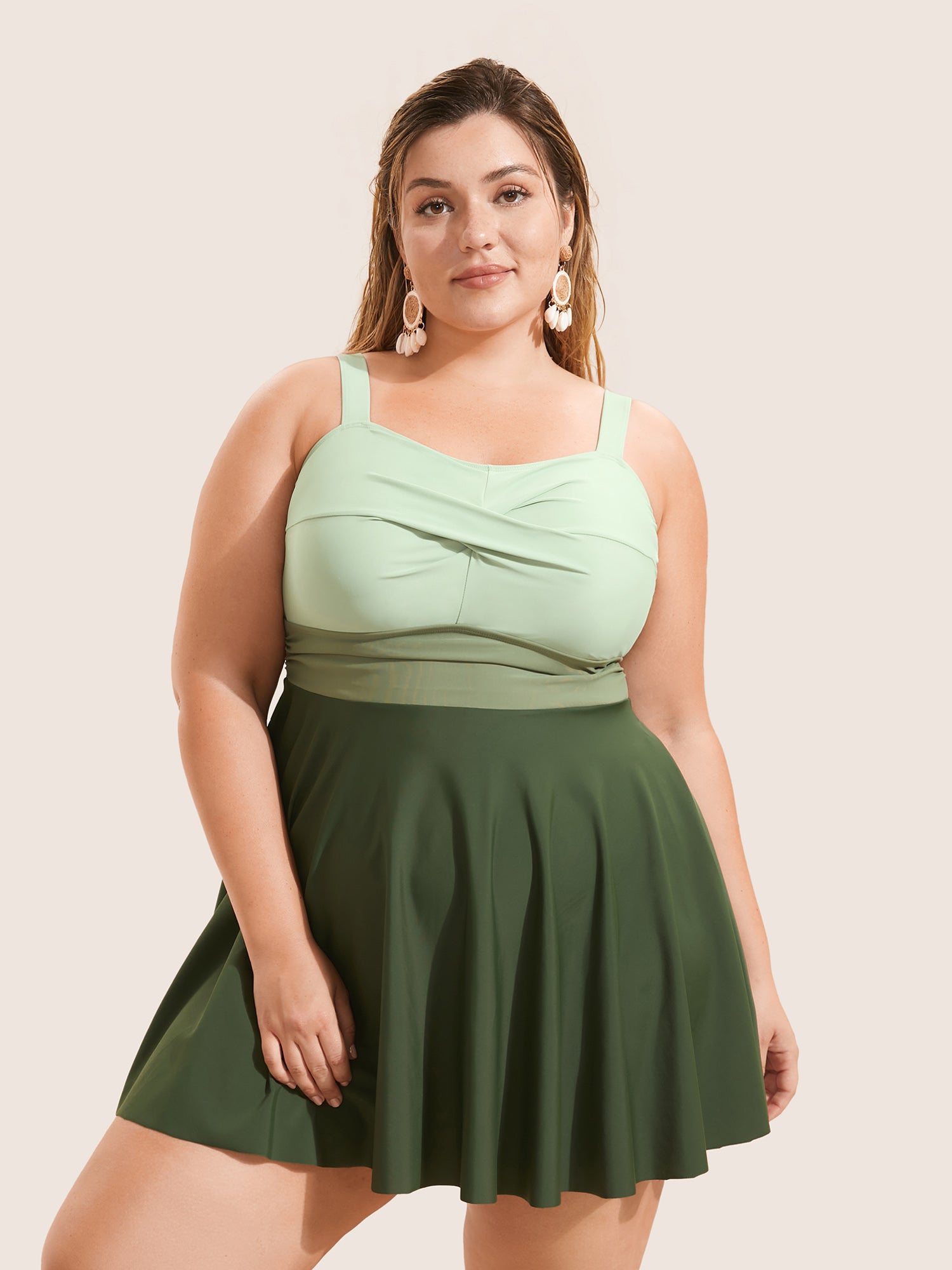 Twist Front Patchwork Adjustable Straps Swim Dress