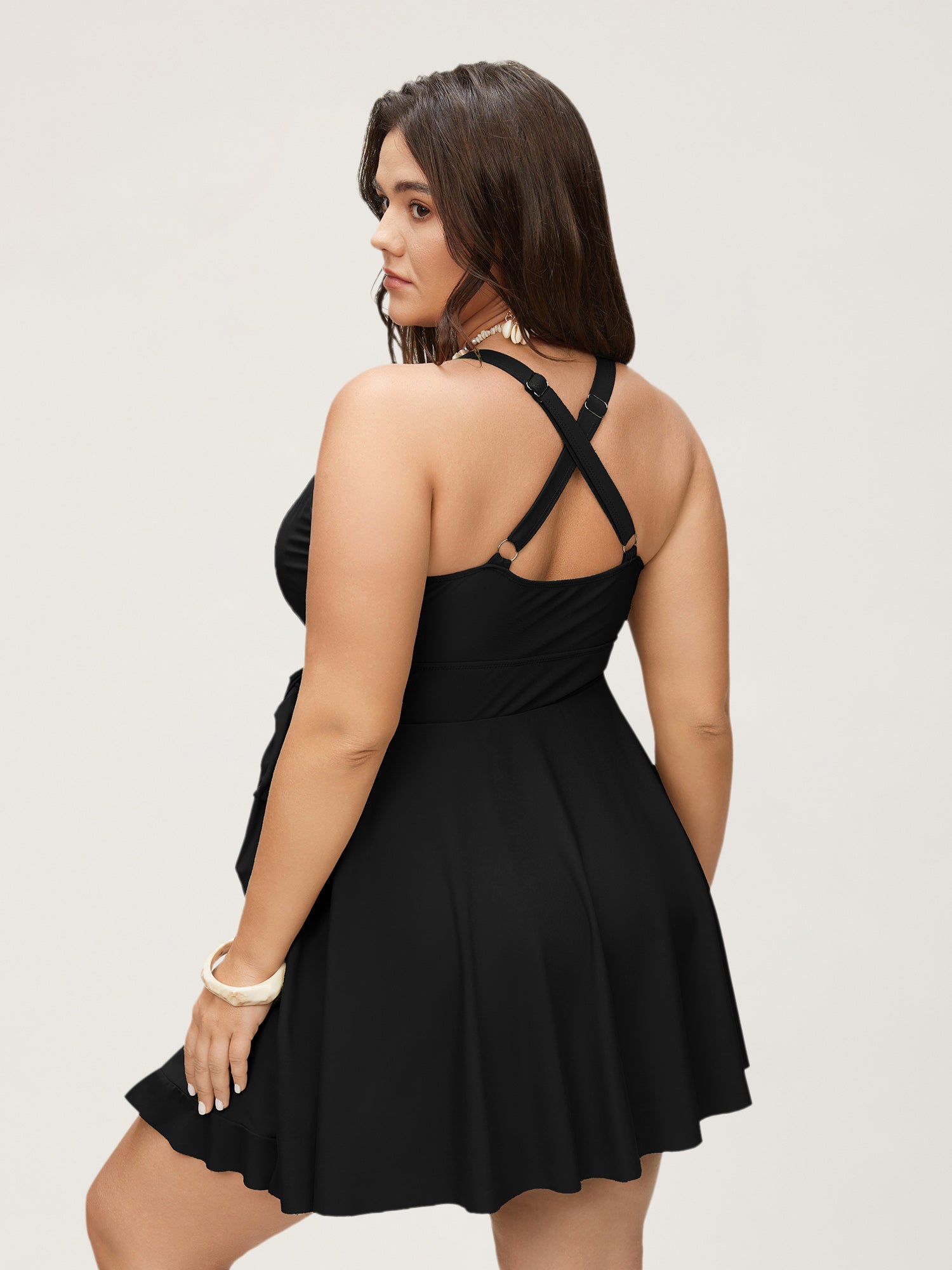 Solid Ruffle Hem Empire Waist Halter Neck Swim Dress