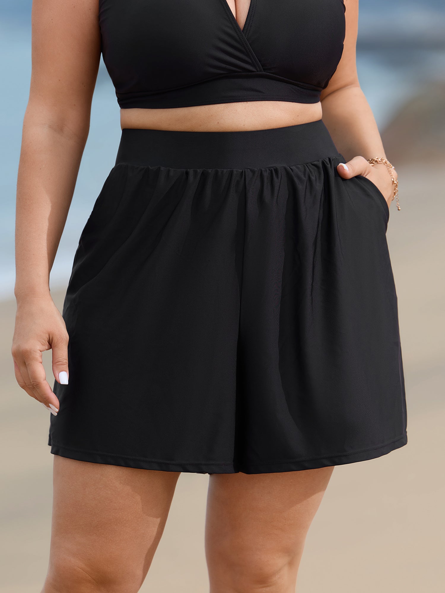 High Waisted Pockets Solid Pleated Swim Bottom