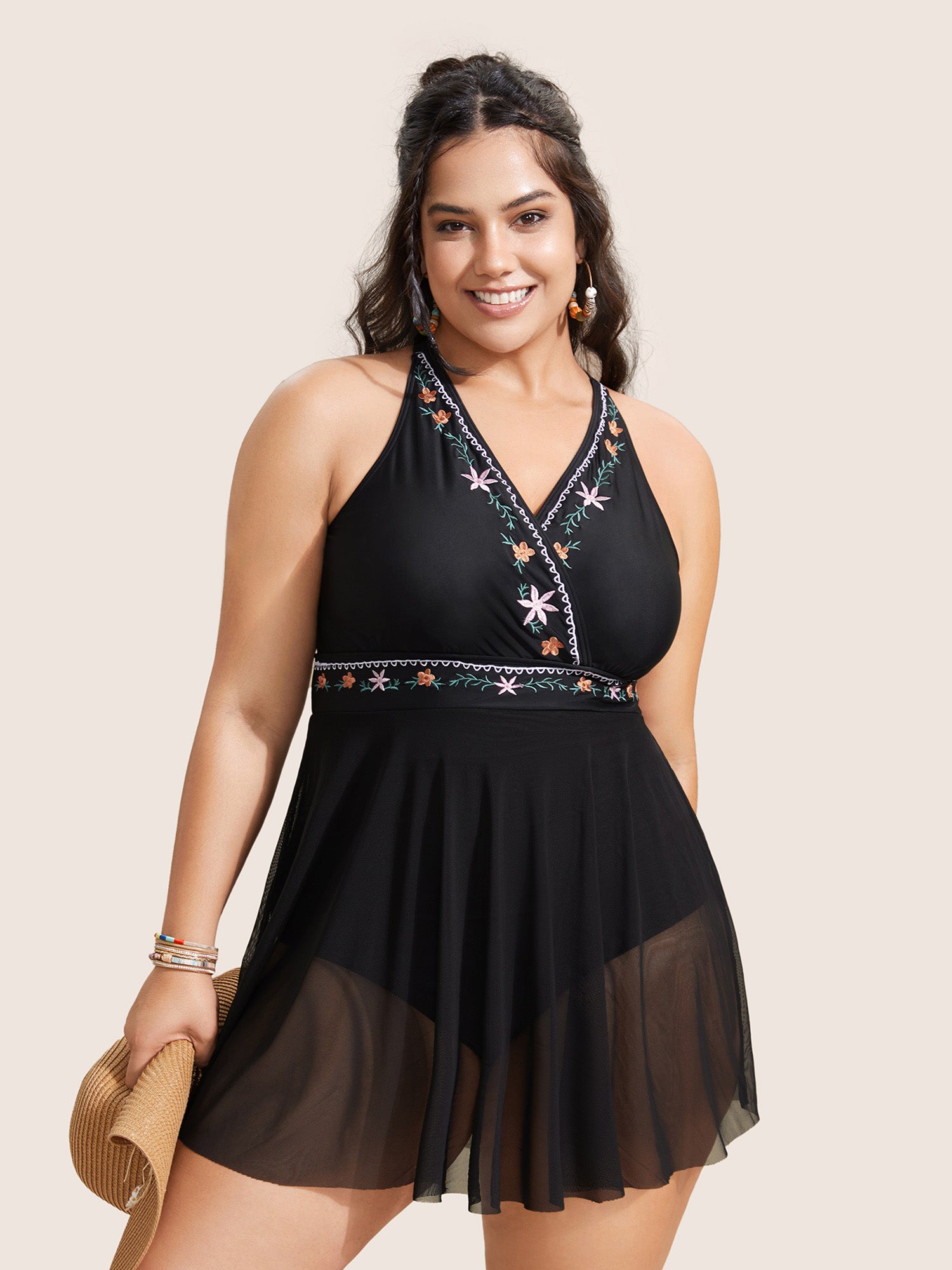 Floral Embroidered Overlap Collar Swim Dress