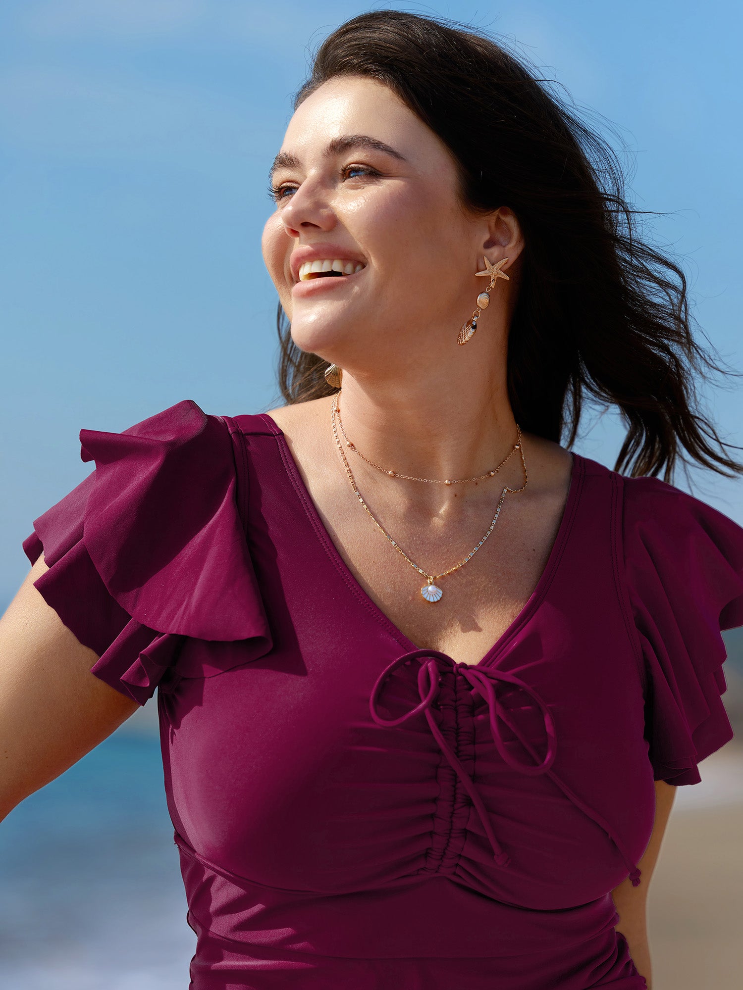 Flutter Sleeve Adjustable Drawstring One Piece Swimsuit