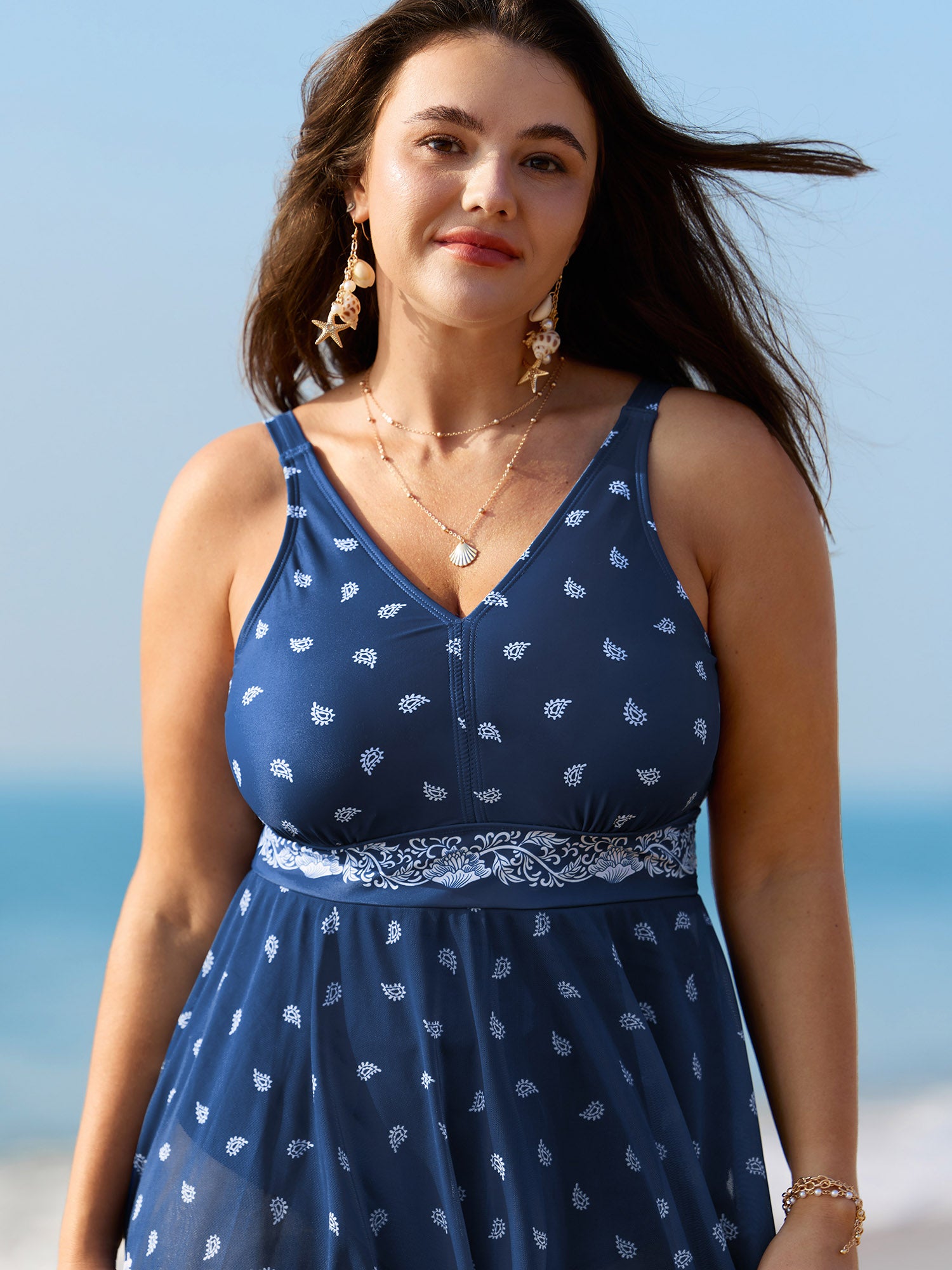 Boho Print Mesh Cinched-Flared Swim Dress