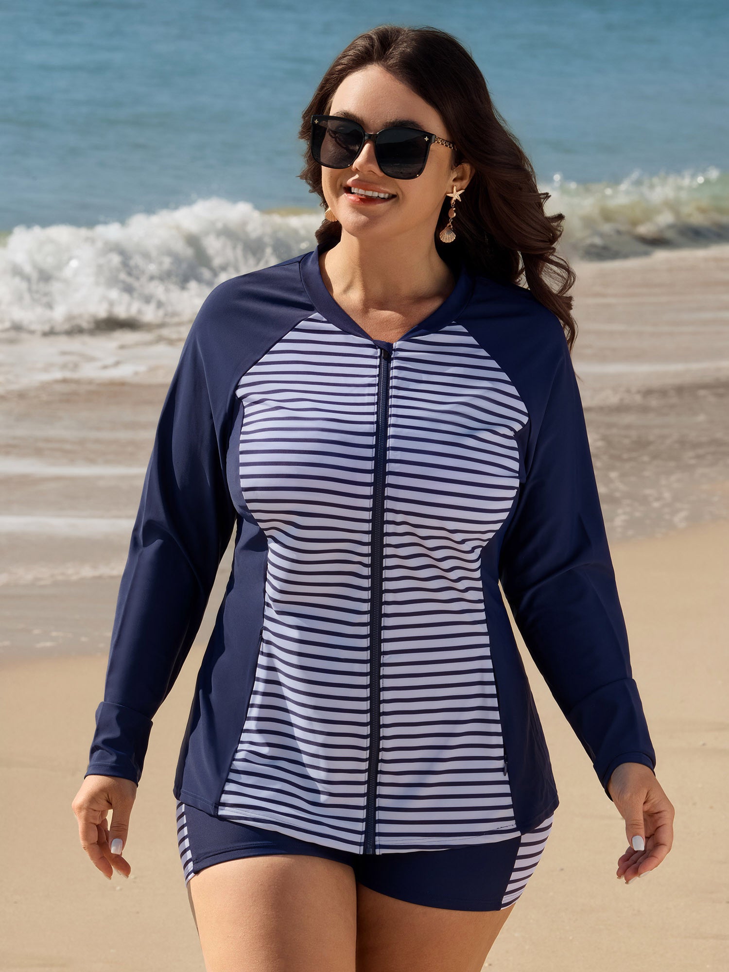 Striped Pockets Zipper Swim Top