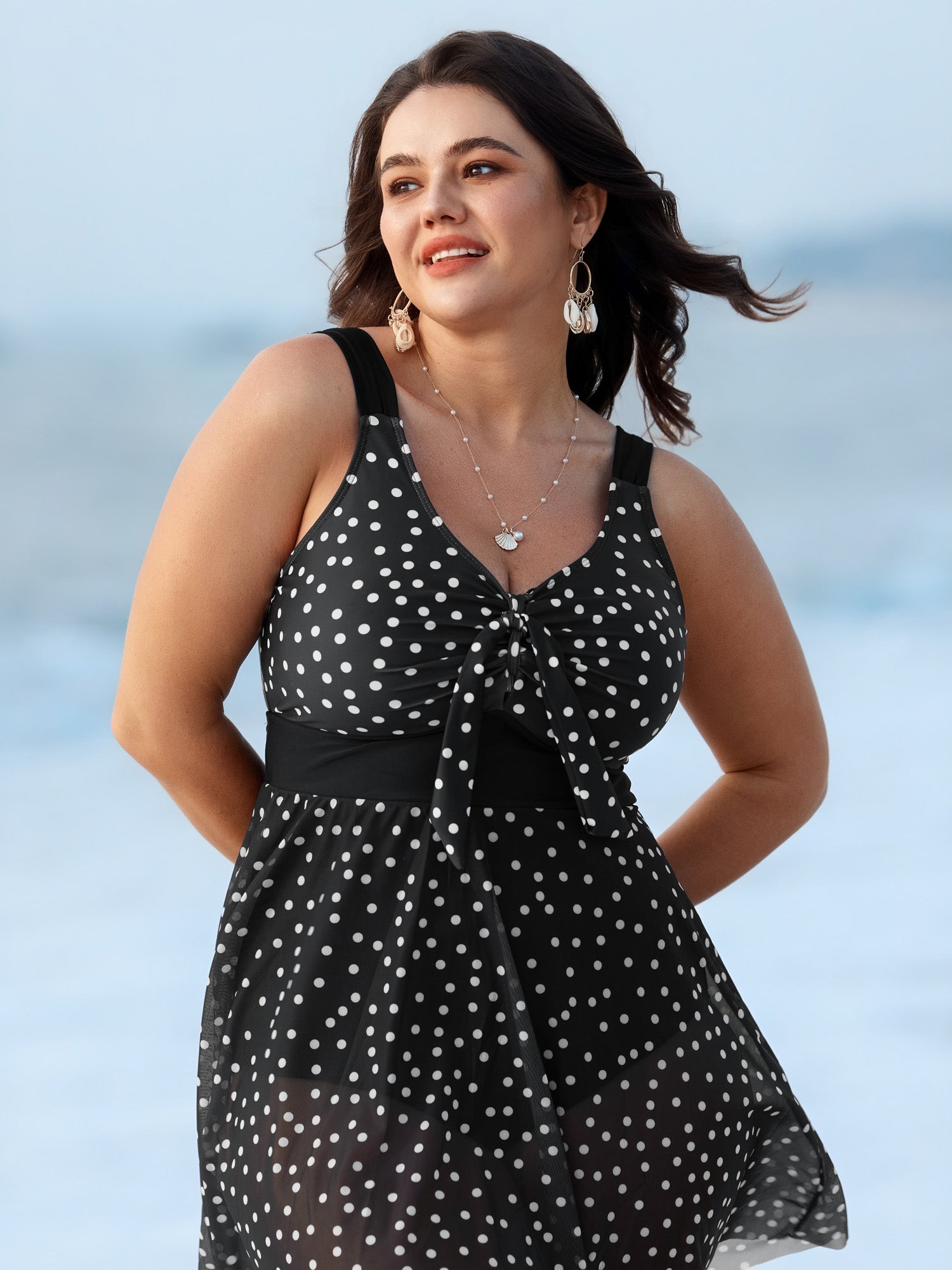 Polka Dots Mesh Neckline Tie Swim Dress
