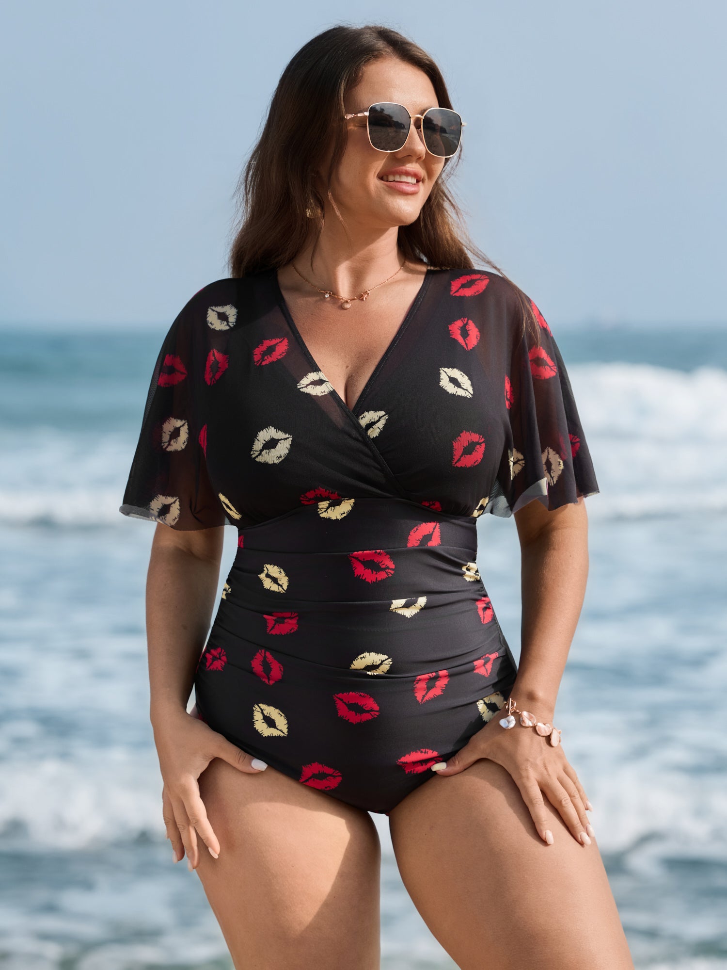 Mesh Lip Pattern Ruched One-Piece Swimsuit