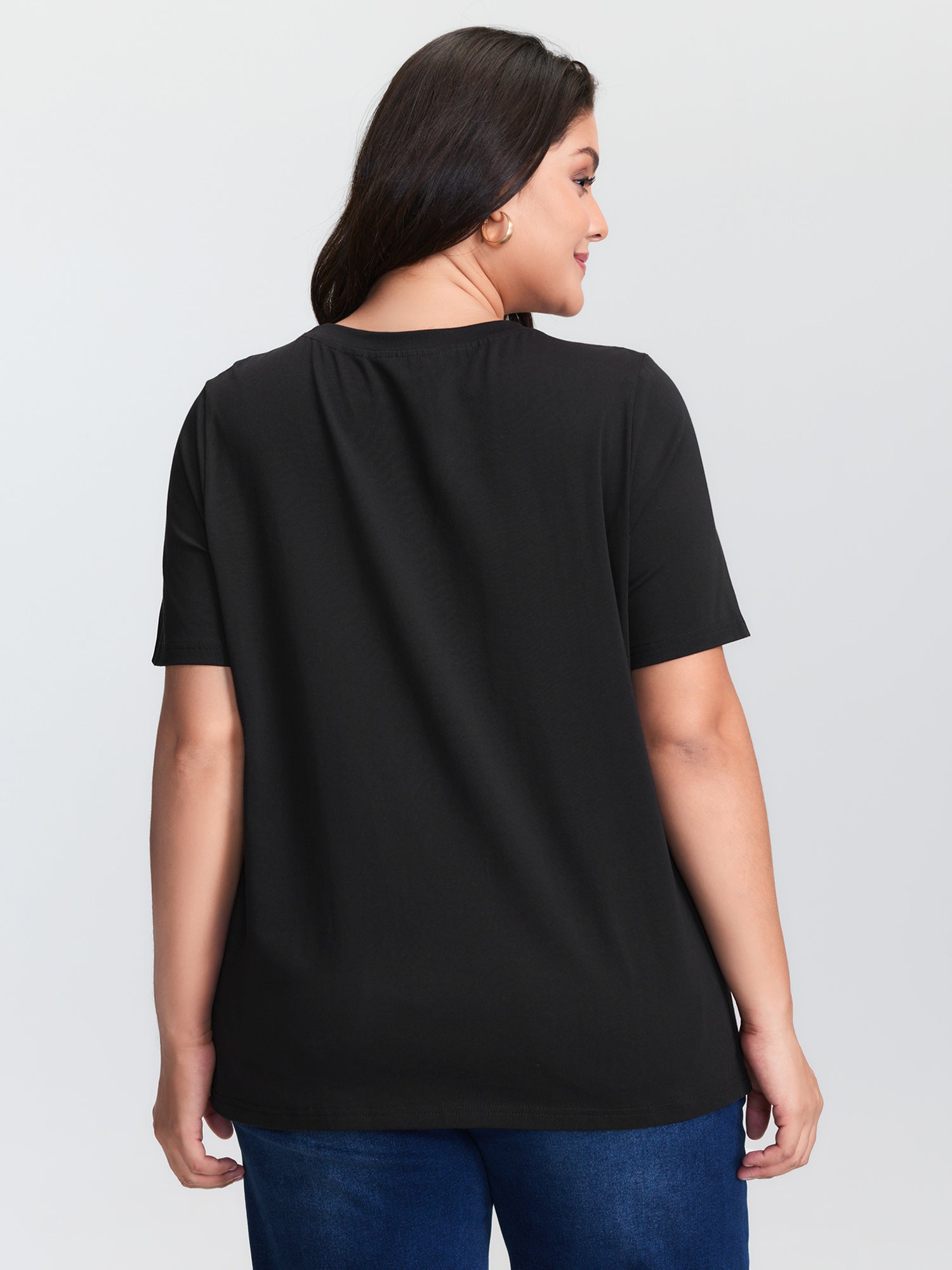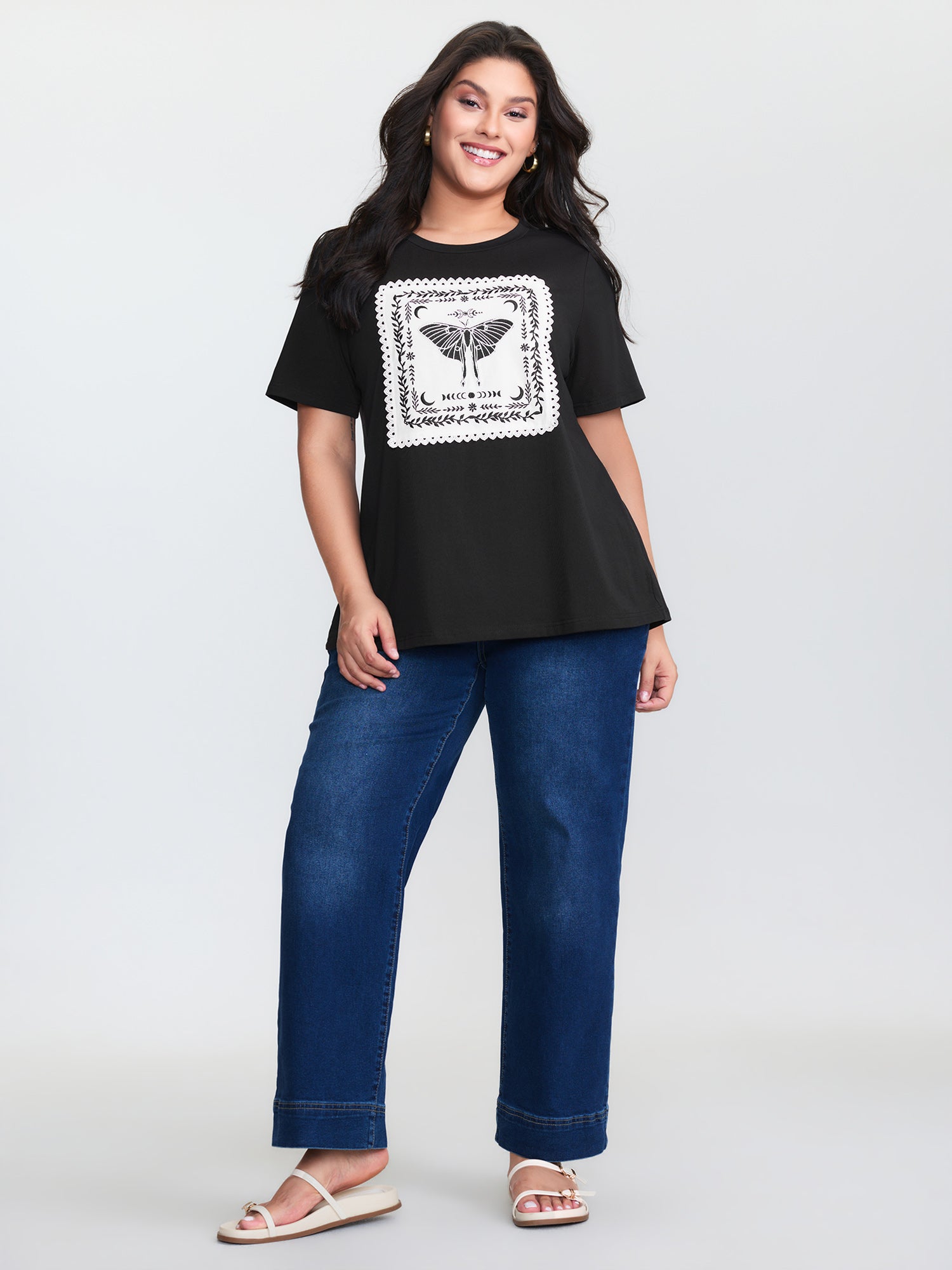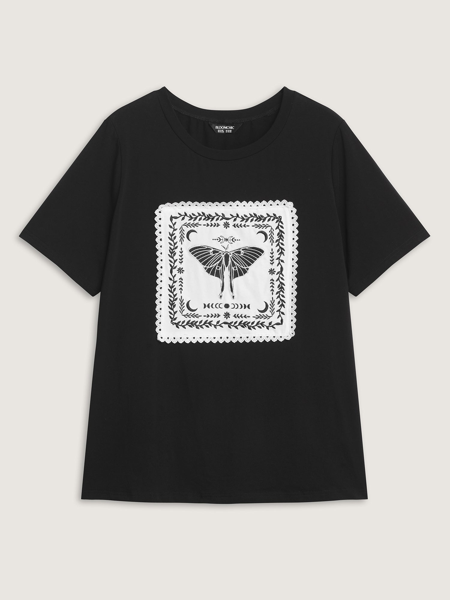 Shop Appliqué Embroidery Lace Trim T-Shirt now and redefine your style with confidence at BloomChic. Tailored for mid and plus-size women. This trendy Tops Women, sizes 10-30. Color:Black;Style:Playful;Prints:Non;Neckline:Round Neck;Sleeve Type:Regular Sleeve;Details:Woven ribbon&lace trim, Embroidered, Contrast;Pocket:No-pocket