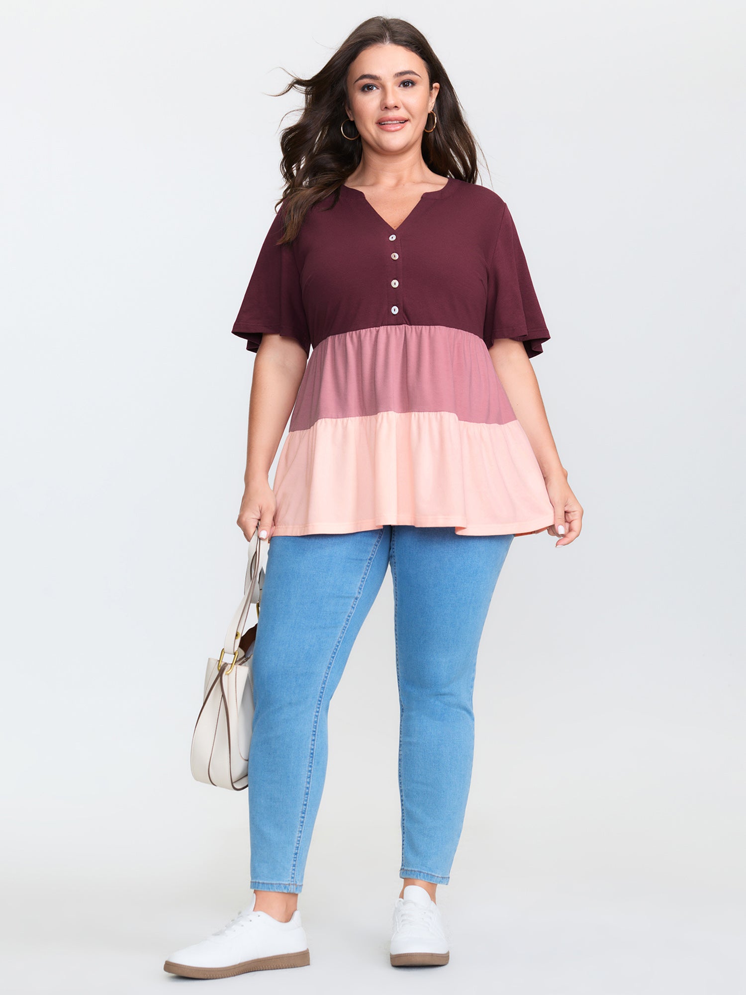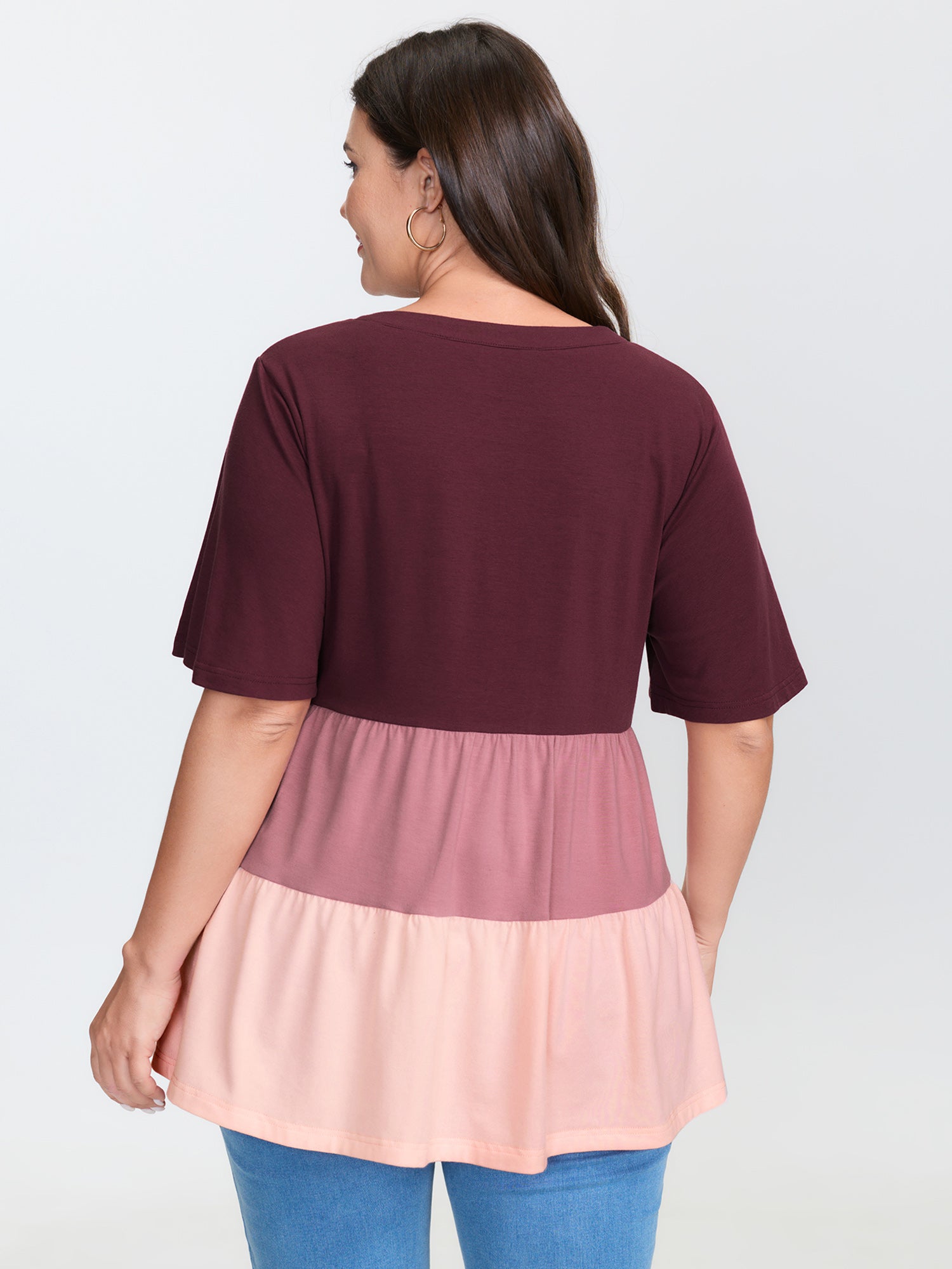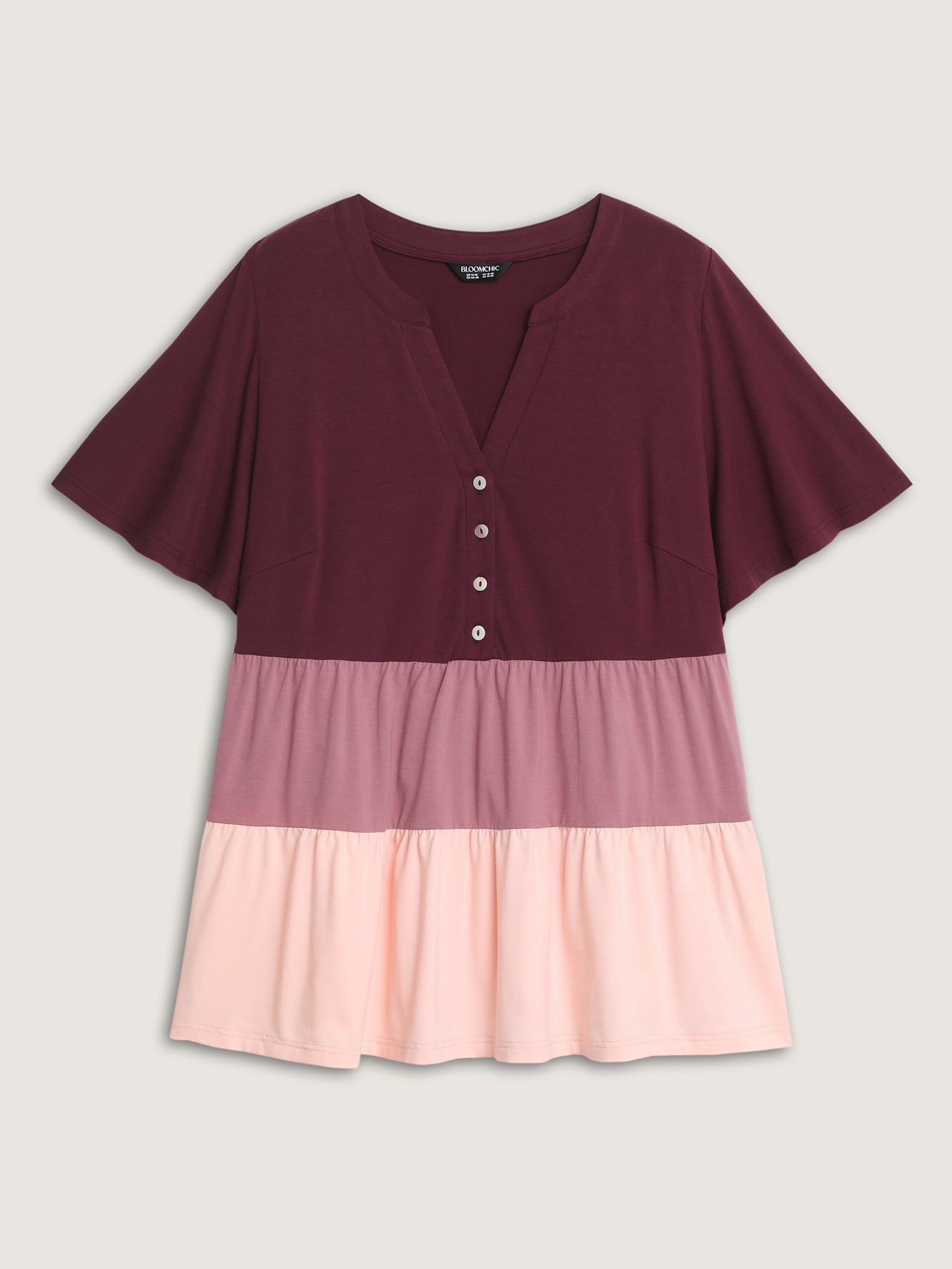 Shop Colorblock Notched Collar Tiered T-Shirt now and redefine your style with confidence at BloomChic. Tailored for mid and plus-size women. This trendy Tops Women, sizes 10-30. Color:Multicolor;Style:Playful;Prints:Geometric & color block;Neckline:Flat collar with V-notch;Sleeve Type:Ruffle Sleeve;Details:Button, Contrast, Gathered;Pocket:No-pocket