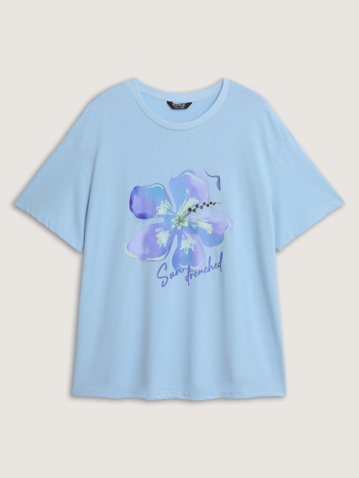 Shop Cotton Floral Motif Drop Shoulder T-Shirt now and redefine your style with confidence at BloomChic. Tailored for mid and plus-size women. This trendy Tops Women, sizes 10-30. Color:Light Blue;Style:Leisure;Pattern Type:Natural Flowers;Prints:Floral;Neckline:Round Neck;Sleeve Type:Regular Sleeve;Pocket:No-pocket
