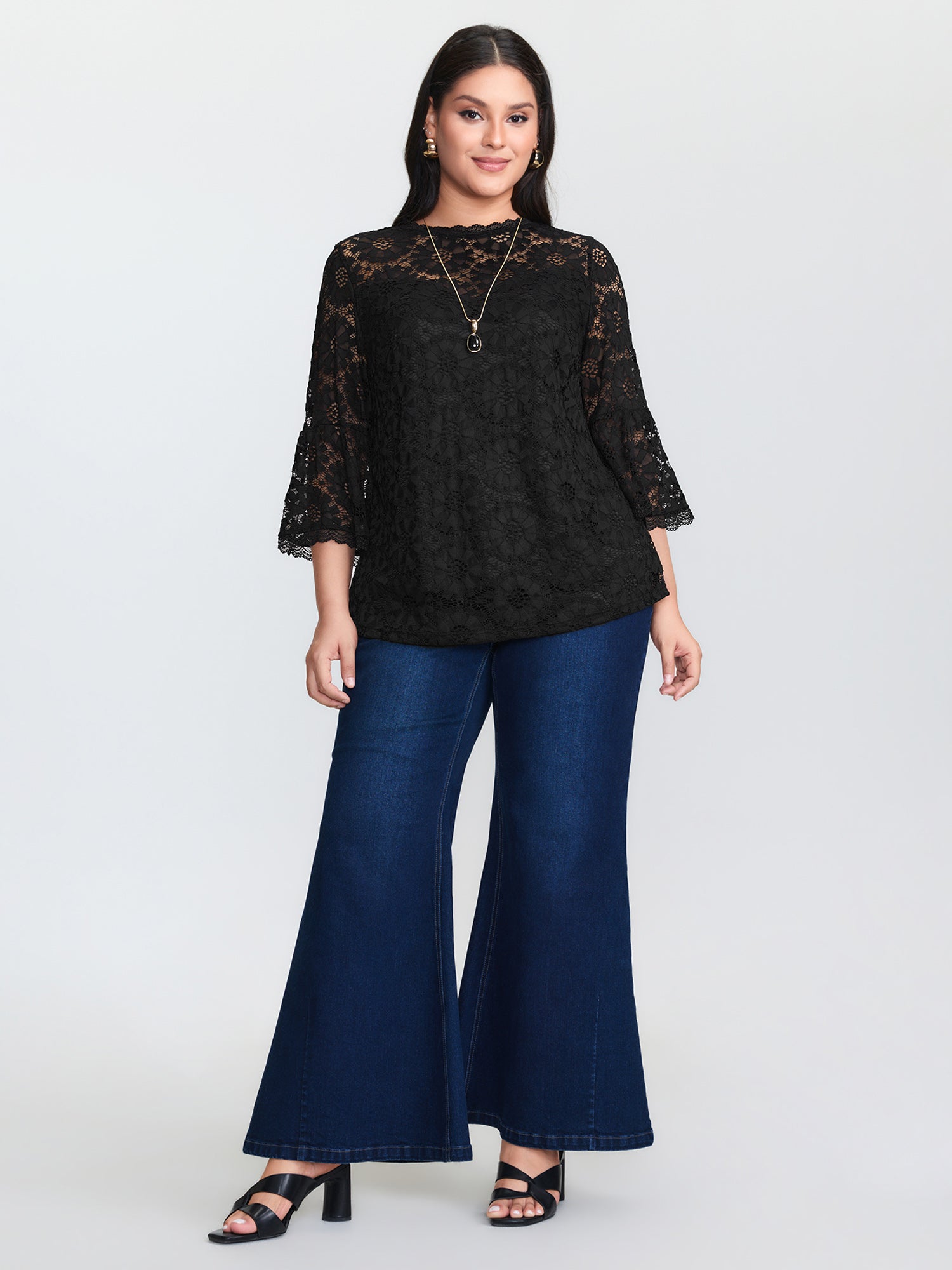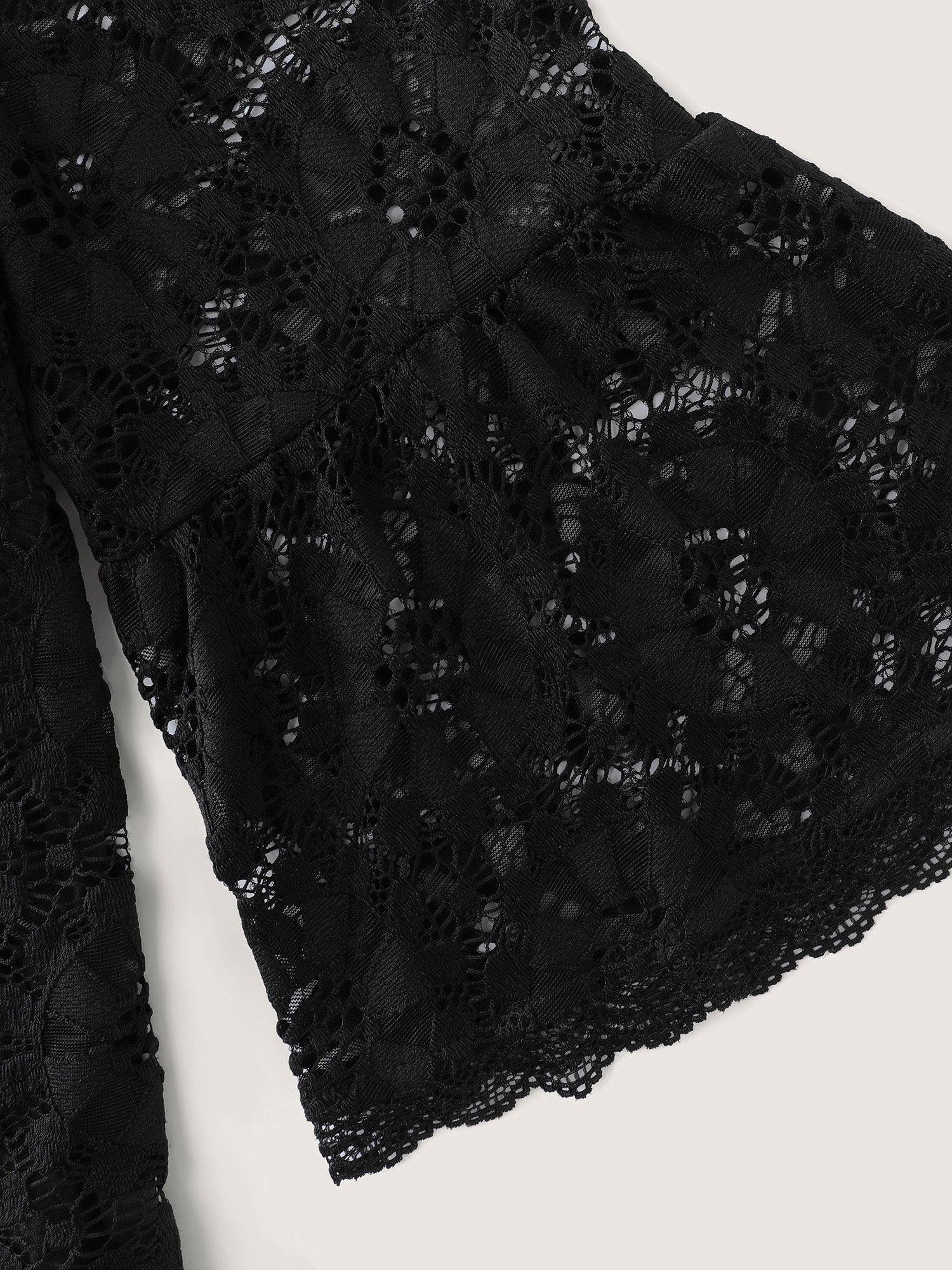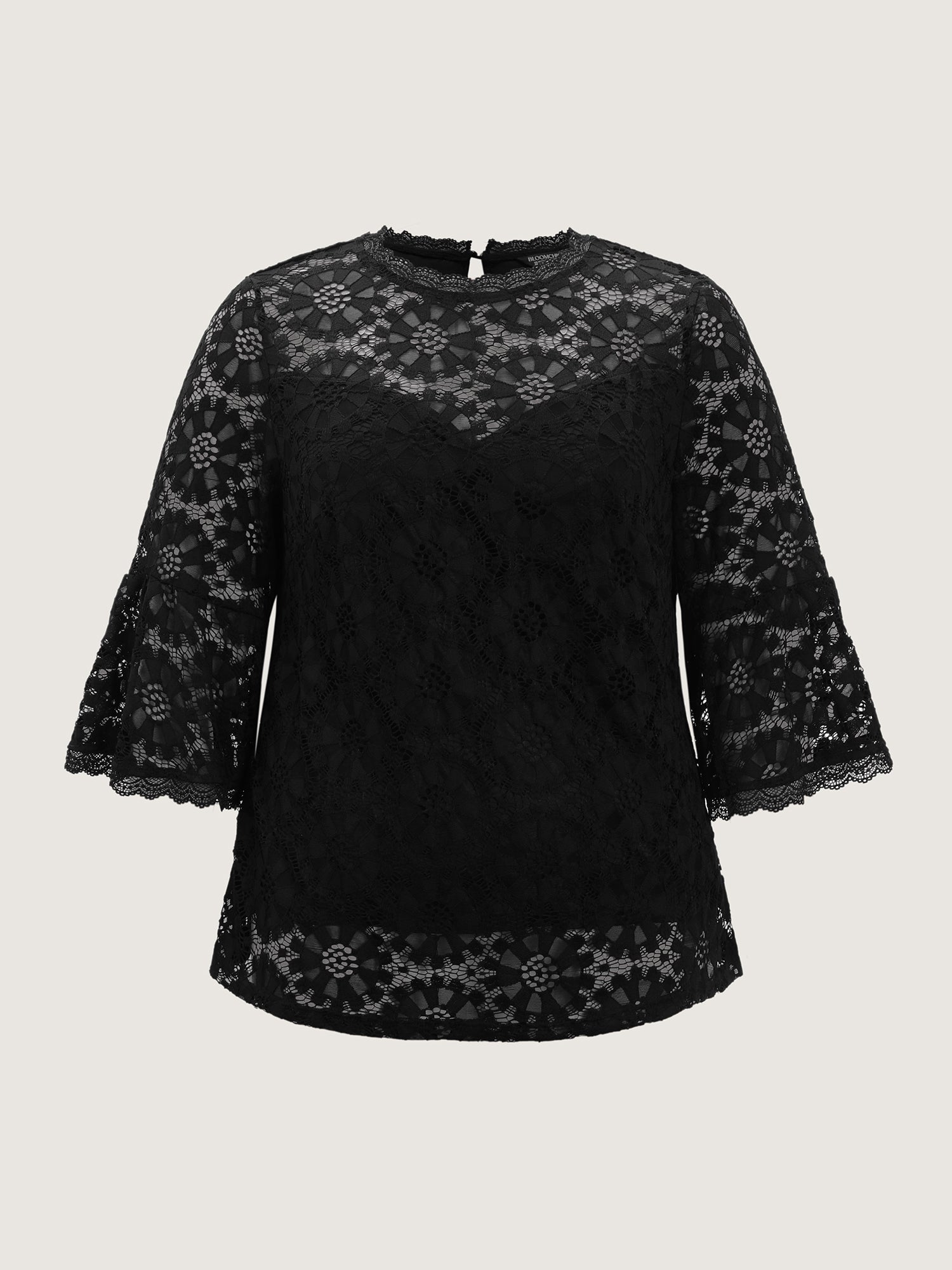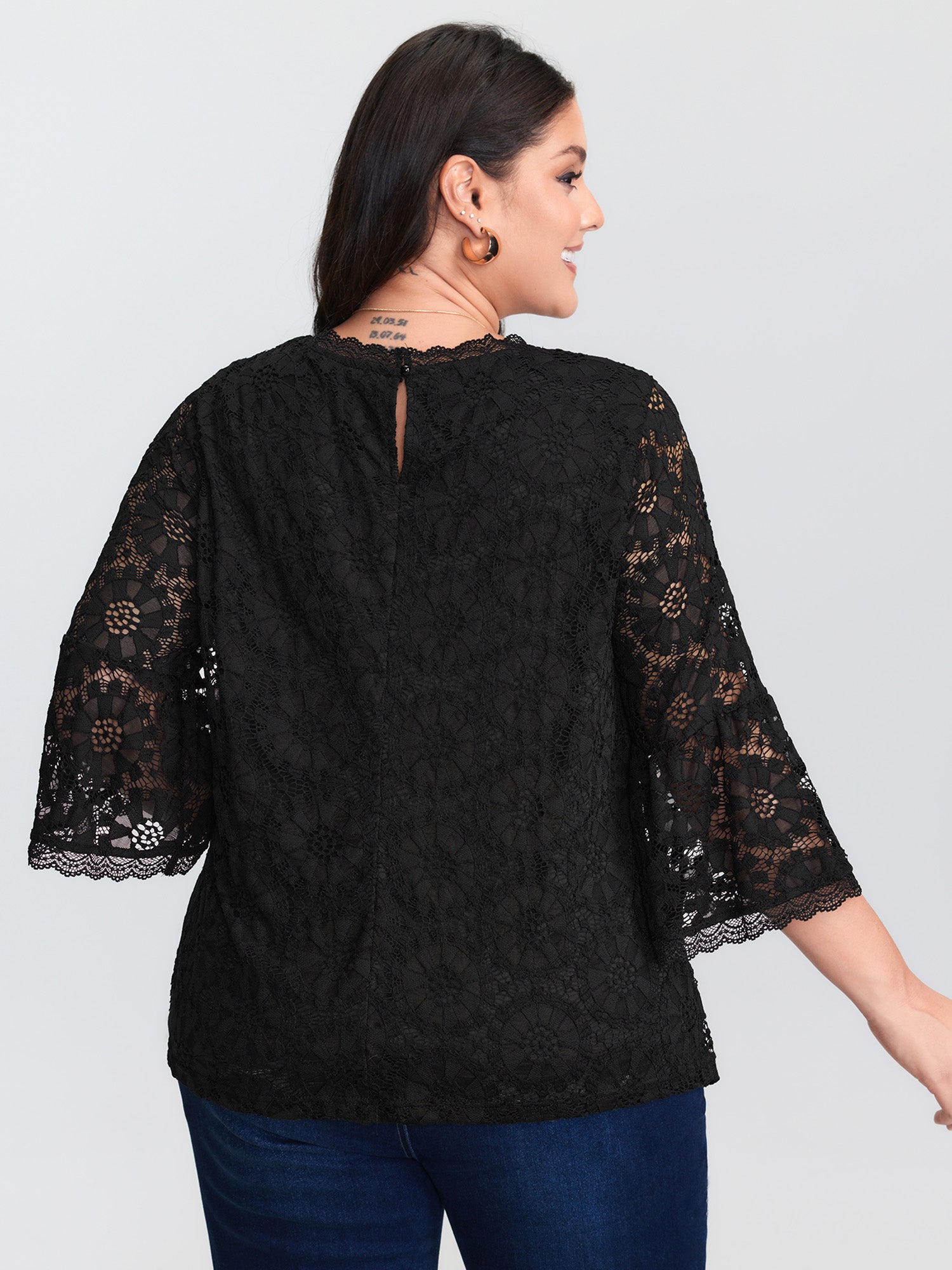 Shop Floral Lace Sheer Fringe Knit Top now and redefine your style with confidence at BloomChic. Tailored for mid and plus-size women. This trendy Tops Women, sizes 10-30. Color:Black;Style:Romantic;Prints:Synthetic texture;Neckline:Round Neck;Sleeve Type:Regular Sleeve;Details:Patchwork, See through, Texture;Pocket:No-pocket