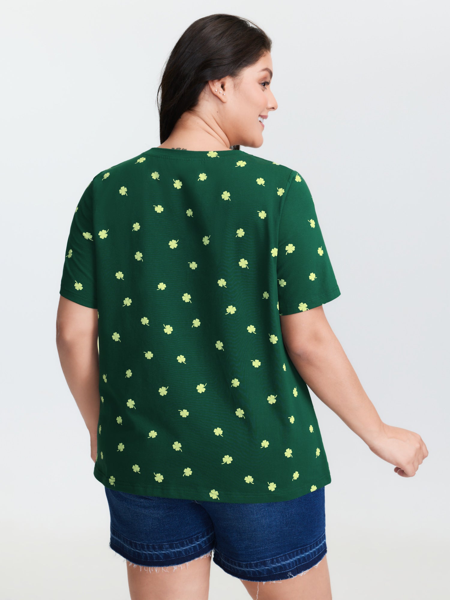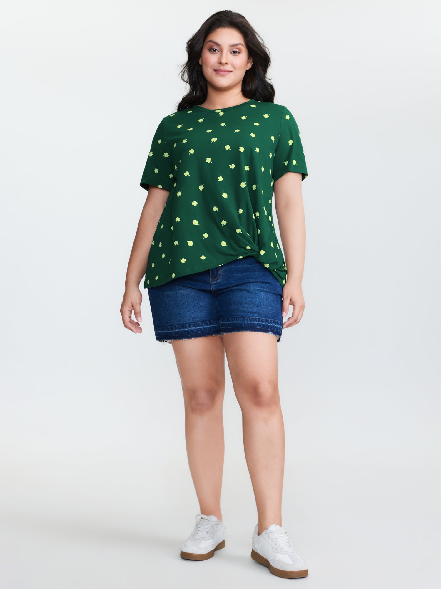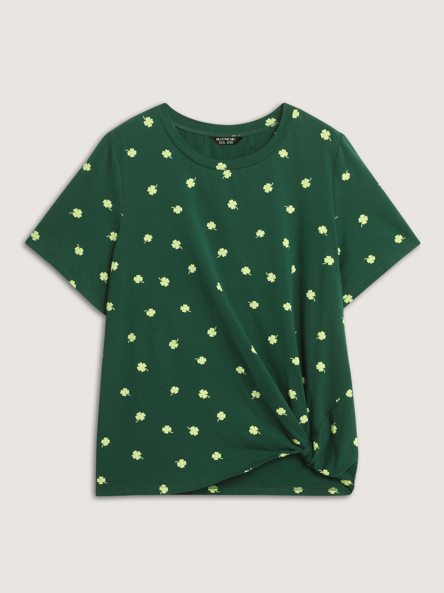 Shop Four Leaf Clover Print Knotted Side T-Shirt now and redefine your style with confidence at BloomChic. Tailored for mid and plus-size women. This trendy Tops Women, sizes 10-30. Color:Dark Green;Style:Playful;Prints:Ditsy floral;Neckline:Round Neck;Sleeve Type:Regular Sleeve;Details:Twist;Pocket:No-pocket