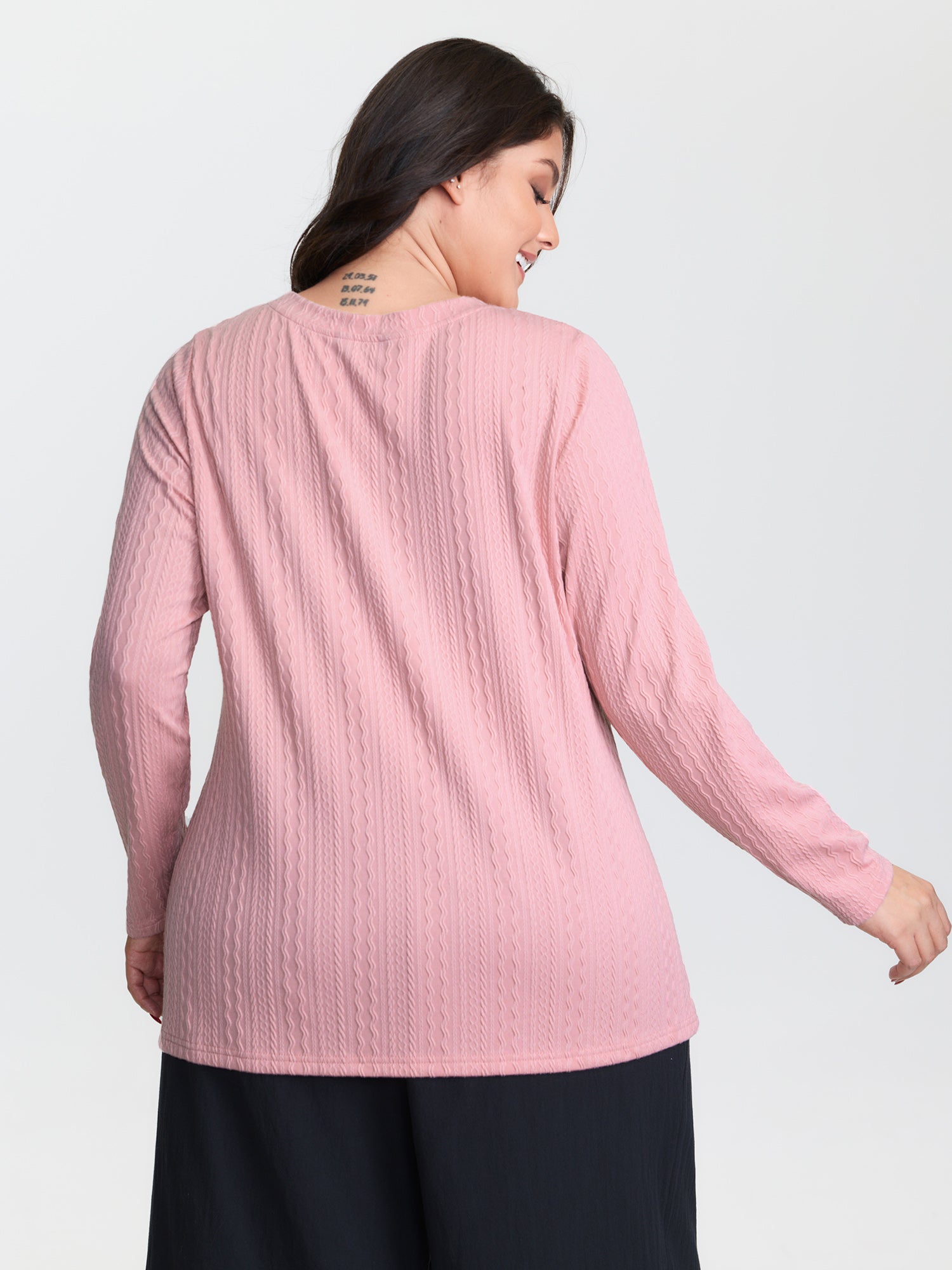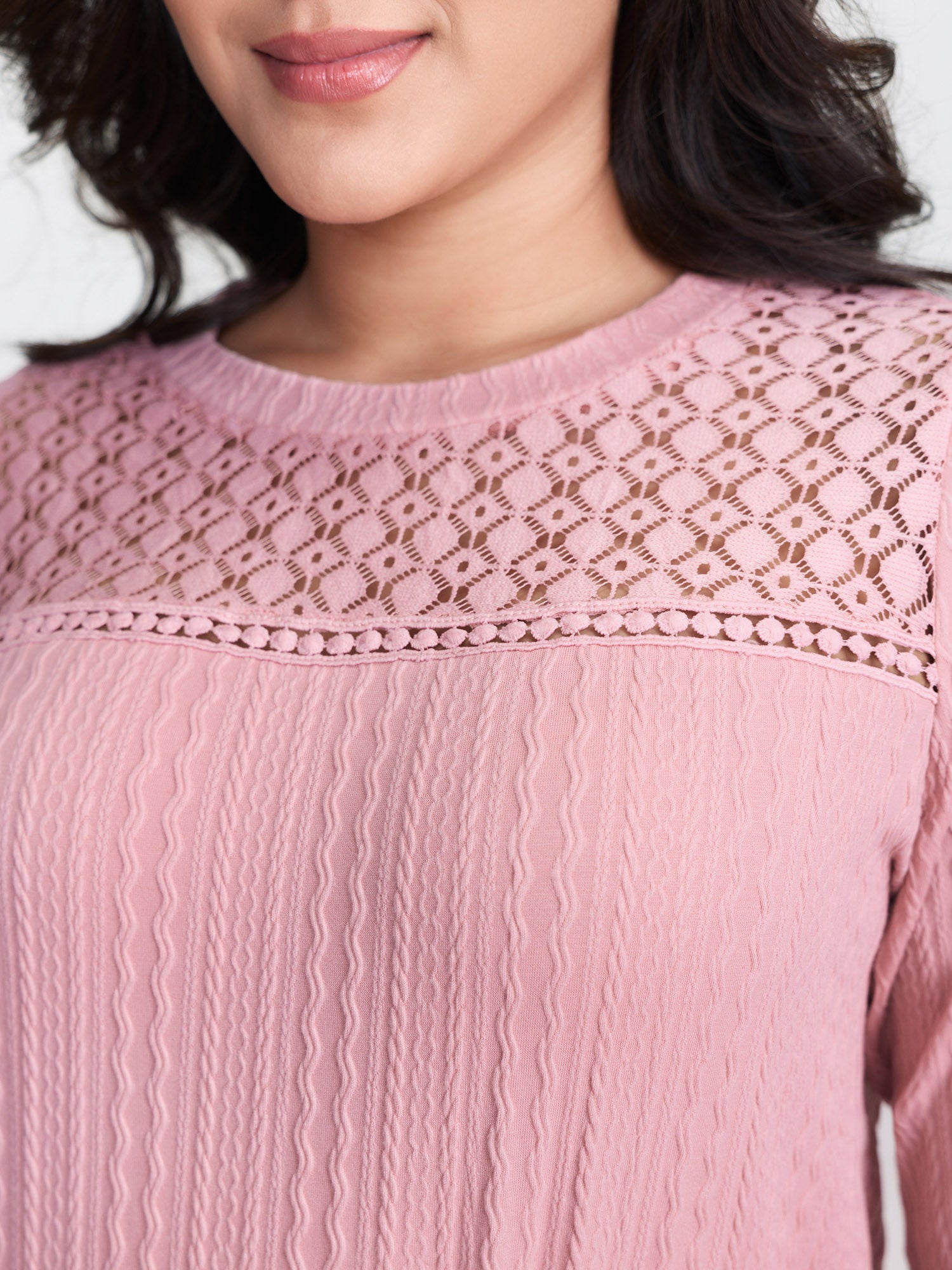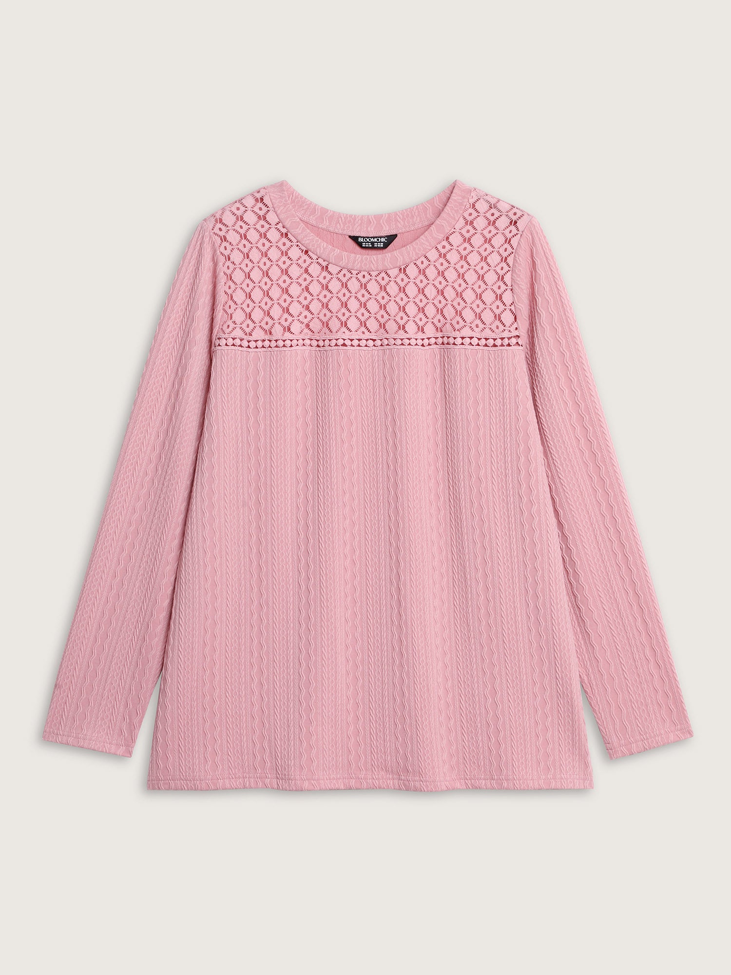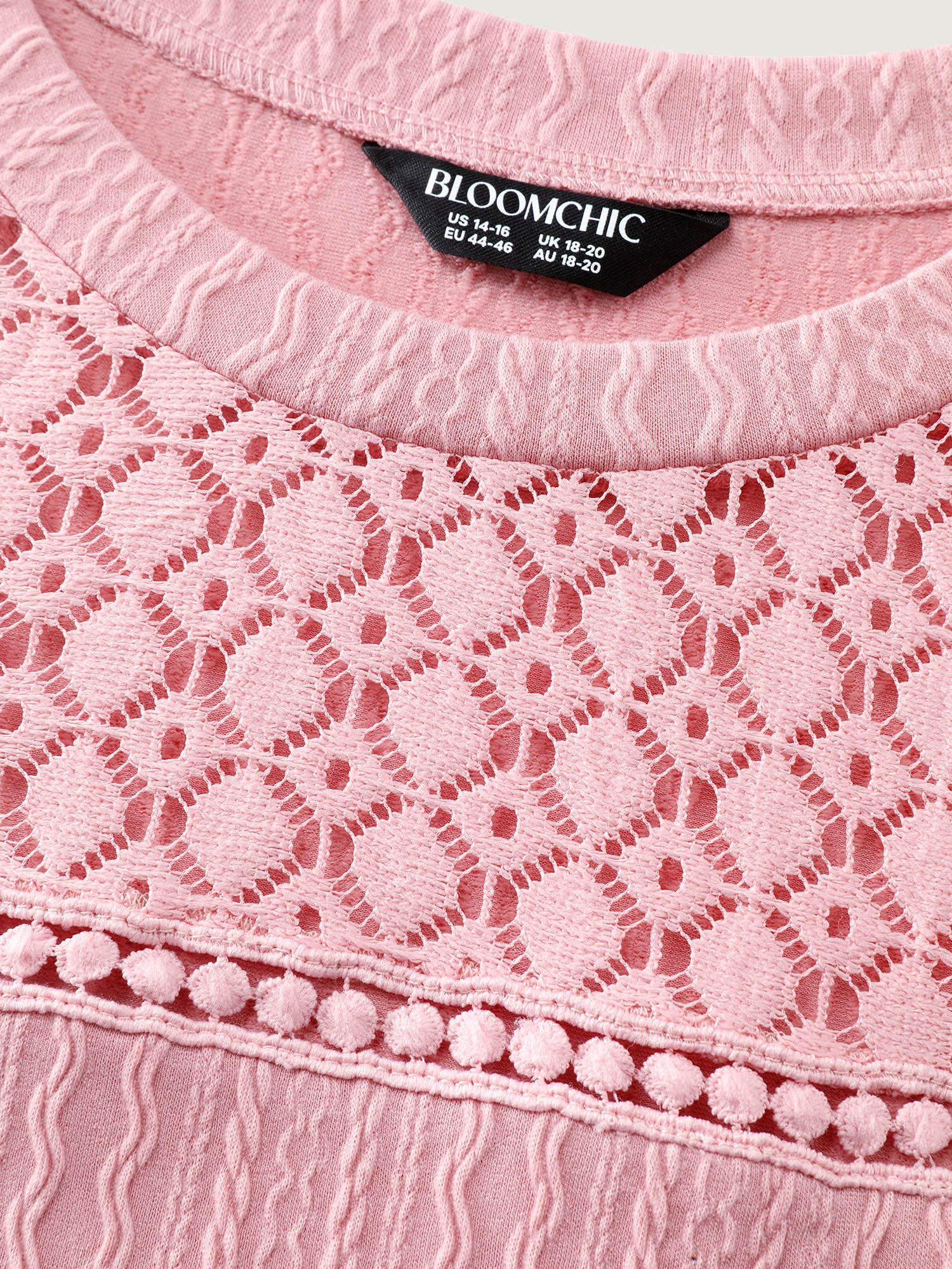 Shop Lace Trim Textured Cut-Out T-Shirt now and redefine your style with confidence at BloomChic. Tailored for mid and plus-size women. This trendy Tops Women, sizes 10-30. Color:Light Pink;Style:Leisure;Prints:Non;Neckline:Round Neck;Sleeve Type:Regular Sleeve;Details:Texture, Woven ribbon&lace trim, Cut-Out;Pocket:No-pocket
