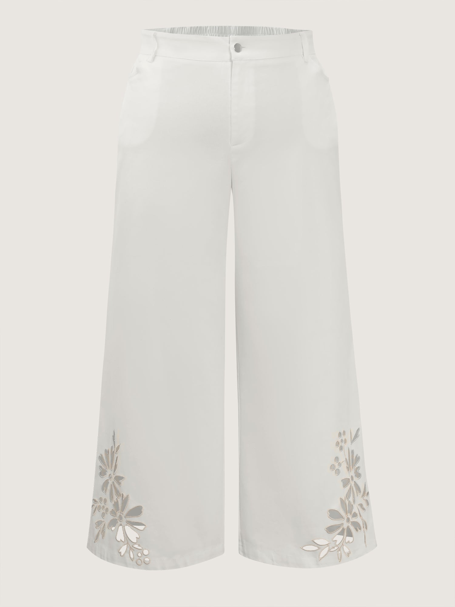 Shop Floral Cutwork Embroidered Hem Pants now and redefine your style with confidence at BloomChic. Tailored for mid and plus-size women. This trendy Bottoms Women, sizes 10-30. Color:White Smoke;Style:Romantic;Waist Design:High Rise;Prints:Synthetic texture;Details:Broderie anglaise, Texture, Cut-Out;Pocket:Slanted pocket;Belt:No-belt;Closure Type:Buttoned zipper