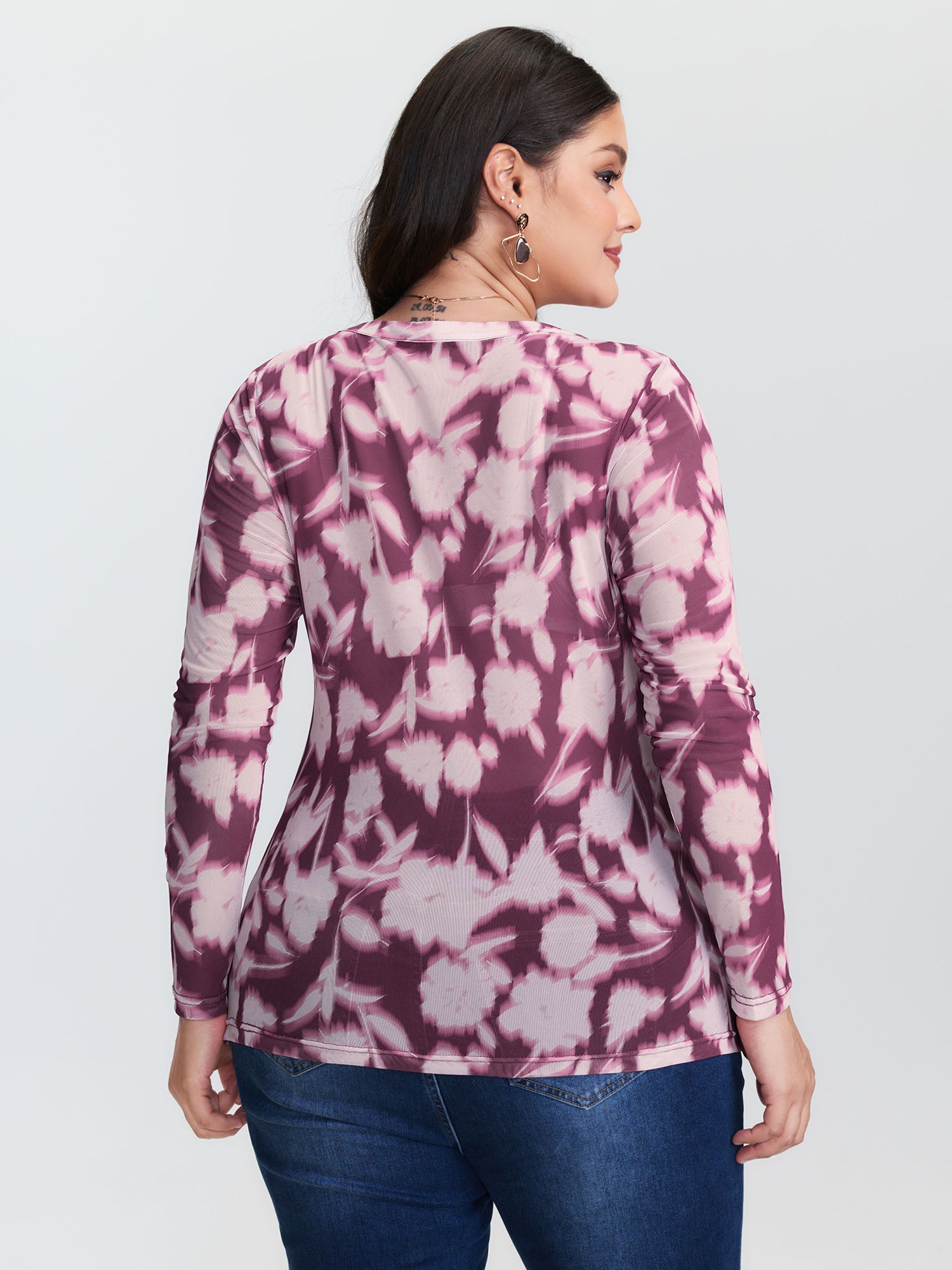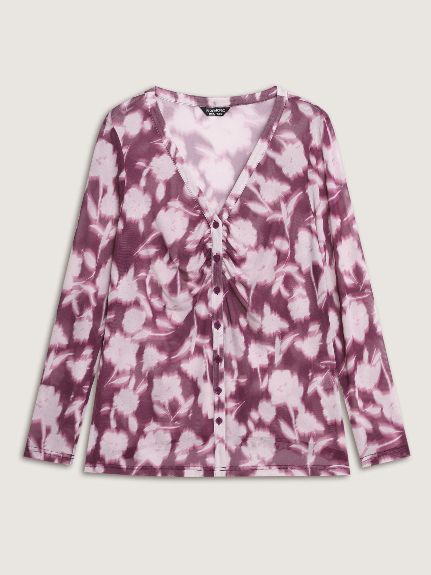 Shop Floral Print Stretchy Shirred Bodice T-Shirt now and redefine your style with confidence at BloomChic. Tailored for mid and plus-size women. This trendy Tops Women, sizes 10-30. Color:Plum;Style:Romantic;Prints:Watercolor floral;Neckline:V-neck;Sleeve Type:Regular Sleeve;Details:Gathered, Contrast, Button;Pocket:No-pocket