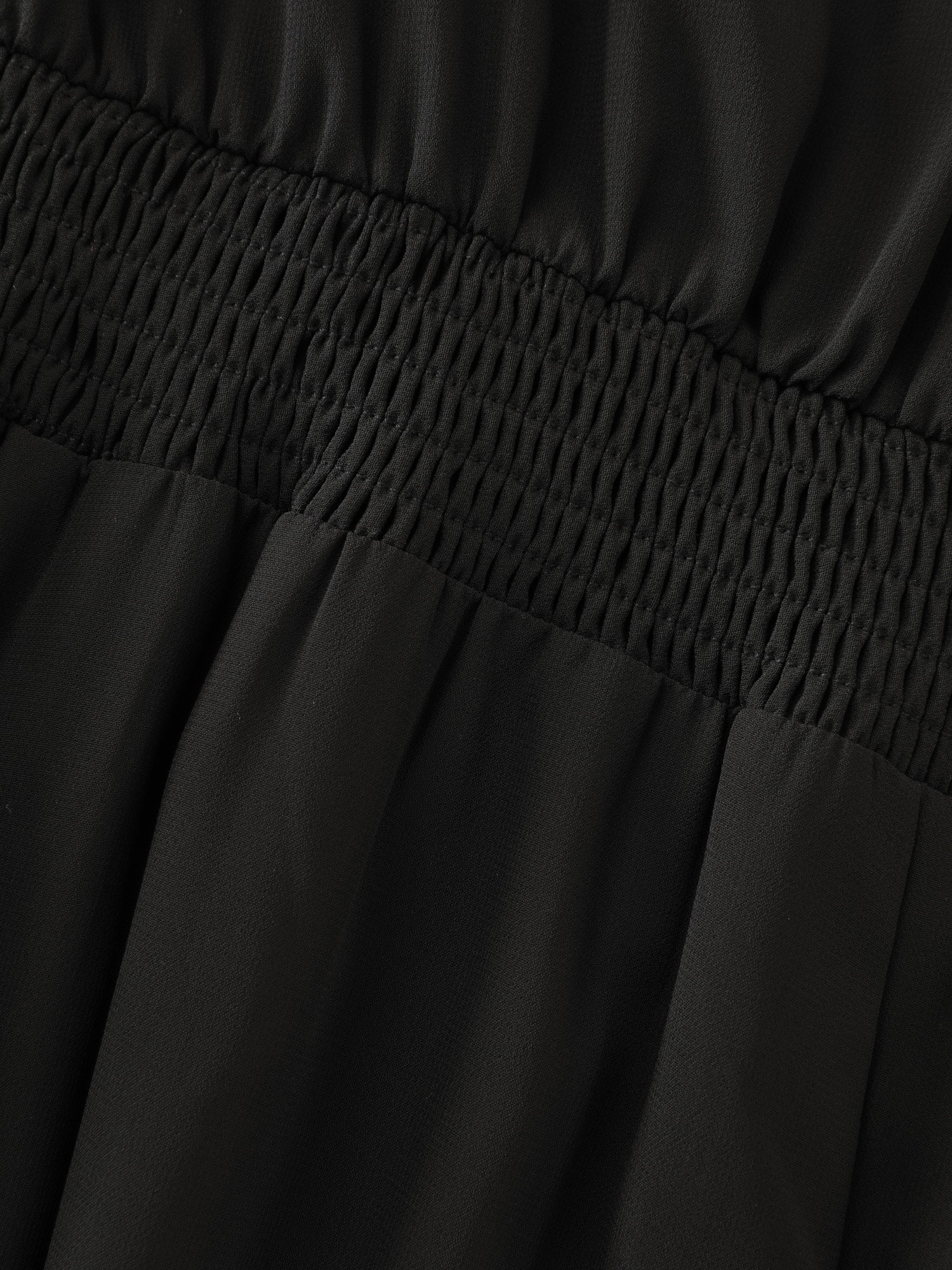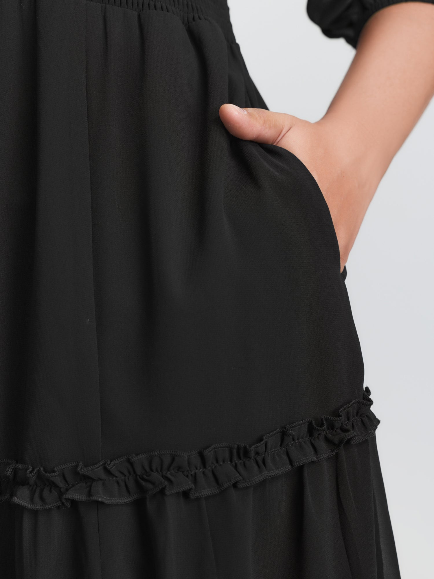 Shop Sheer Chiffon Cinched Waist Tiered Midi Dress now and redefine your style with confidence at BloomChic. Tailored for mid and plus-size women. This trendy Dress, sizes 10-30. You can never go wrong with BloomChic Dresses. Color:Black;Style:Romantic;Neckline:Deep V-neck;Sleeve Type:Lantern Sleeve;Prints:Non;Details:Frill Trim, Tiered, See through;Pocket:Side seam pocket;Belt:No-belt;Closure Type:Non