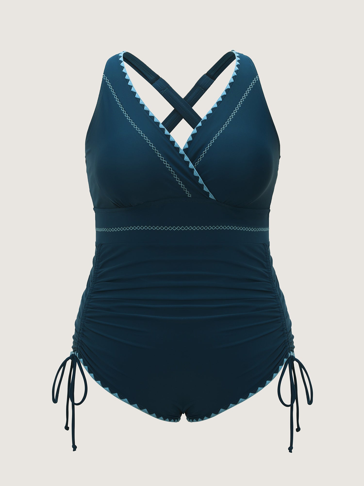 Shop Embroidered Tummy-Control Pleated One-Piece Swimsuit now and redefine your style with confidence at BloomChic. Tailored for mid and plus-size women. This trendy Swimwear Women, sizes 10-30. Color:Aegean;Style:Resort;Cup Type:Removable cups;Coverage:Full;Neckline:Overlap Collar;Sleeve Type:Sleeveless;Prints:Non;Details:Drawstring, Gathered, Embroidered;Pocket:No-pocket;Belt:No-belt;Chest pad:Removable Padding;Lining:Lining;Closure Type:Non;Structural function:Tummy-Sculpt,Adaptive-Fit;Swimsuit types:One-Piece Triangle Swimsuit;Functional Fabric:Chlorine Resistant,UPF 50 Sun Protection