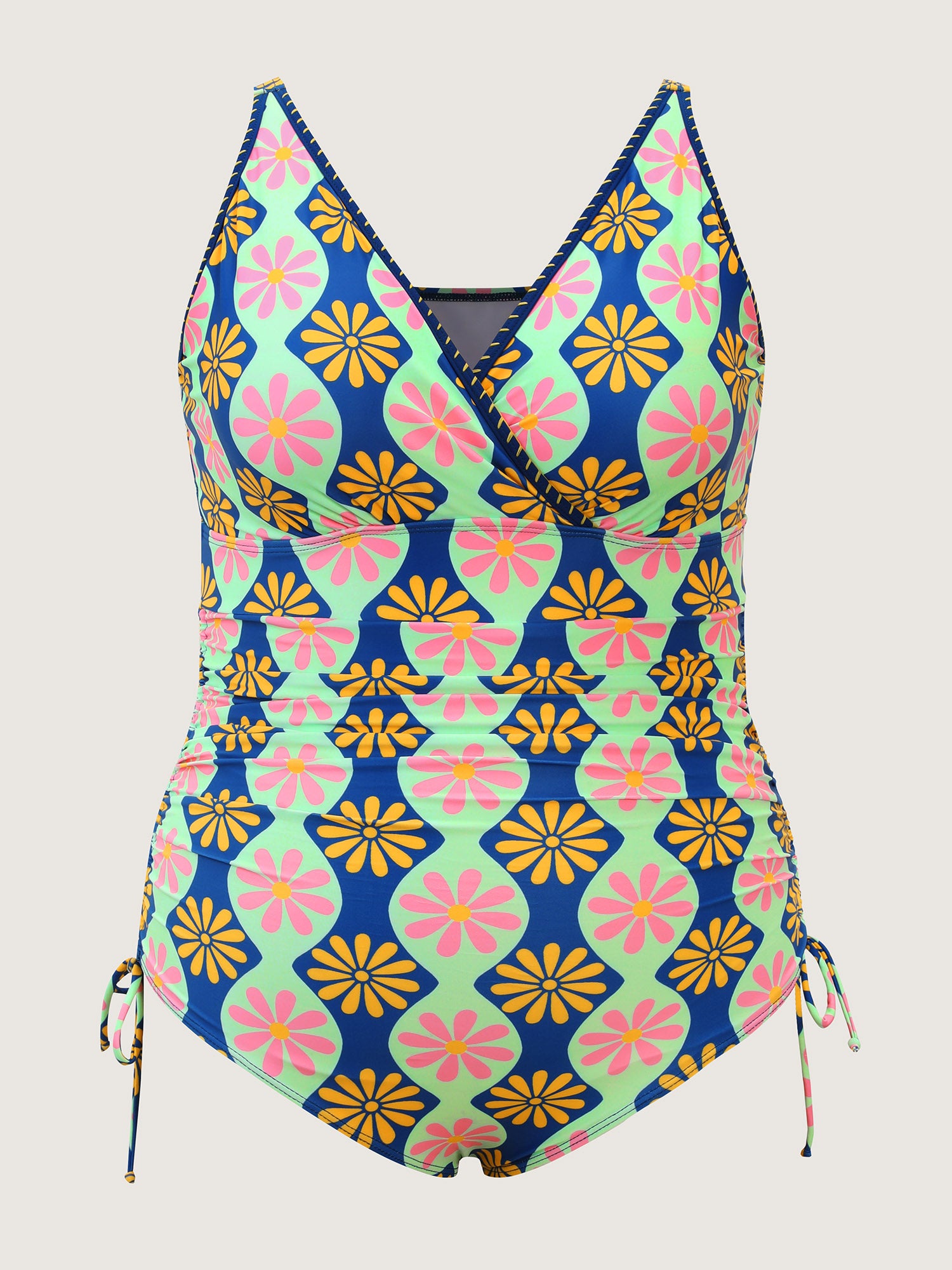 Shop Geometric Print Embroidered One-Piece Swimsuit now and redefine your style with confidence at BloomChic. Tailored for mid and plus-size women. This trendy Swimwear Women, sizes 10-30. Color:Dark Blue;Style:Resort;Cup Type:Removable cups;Coverage:Full;Neckline:Overlap Collar;Sleeve Type:Sleeveless;Prints:Floral;Details:Drawstring, Contrast;Pocket:No-pocket;Belt:No-belt;Chest pad:Removable Padding;Lining:Lining;Closure Type:Non;Structural function:Tummy-Sculpt,Adaptive-Fit;Swimsuit types:One-Piece Triangle Swimsuit;Functional Fabric:Chlorine Resistant