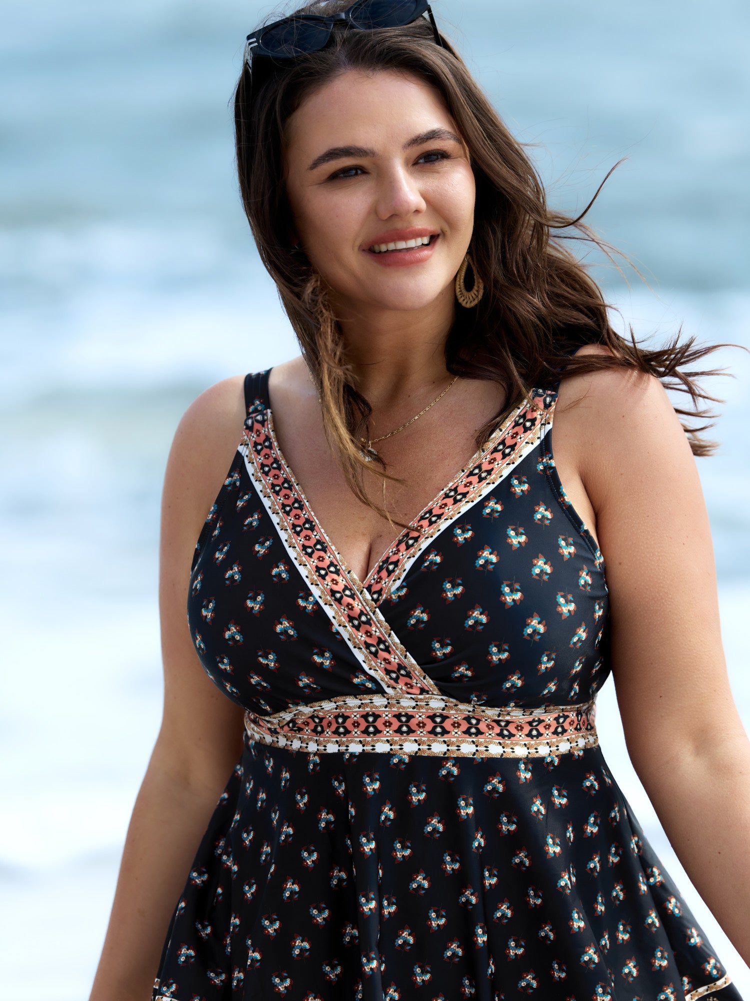 Boho Print Waist-Tie Surplice Neck Swim Dress