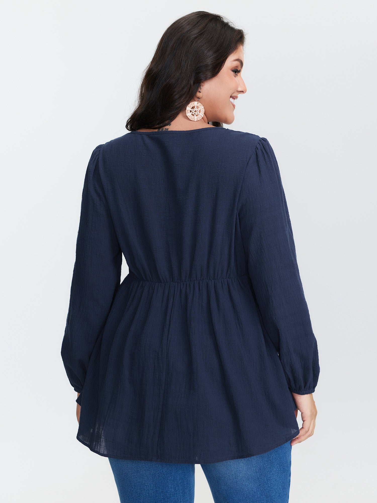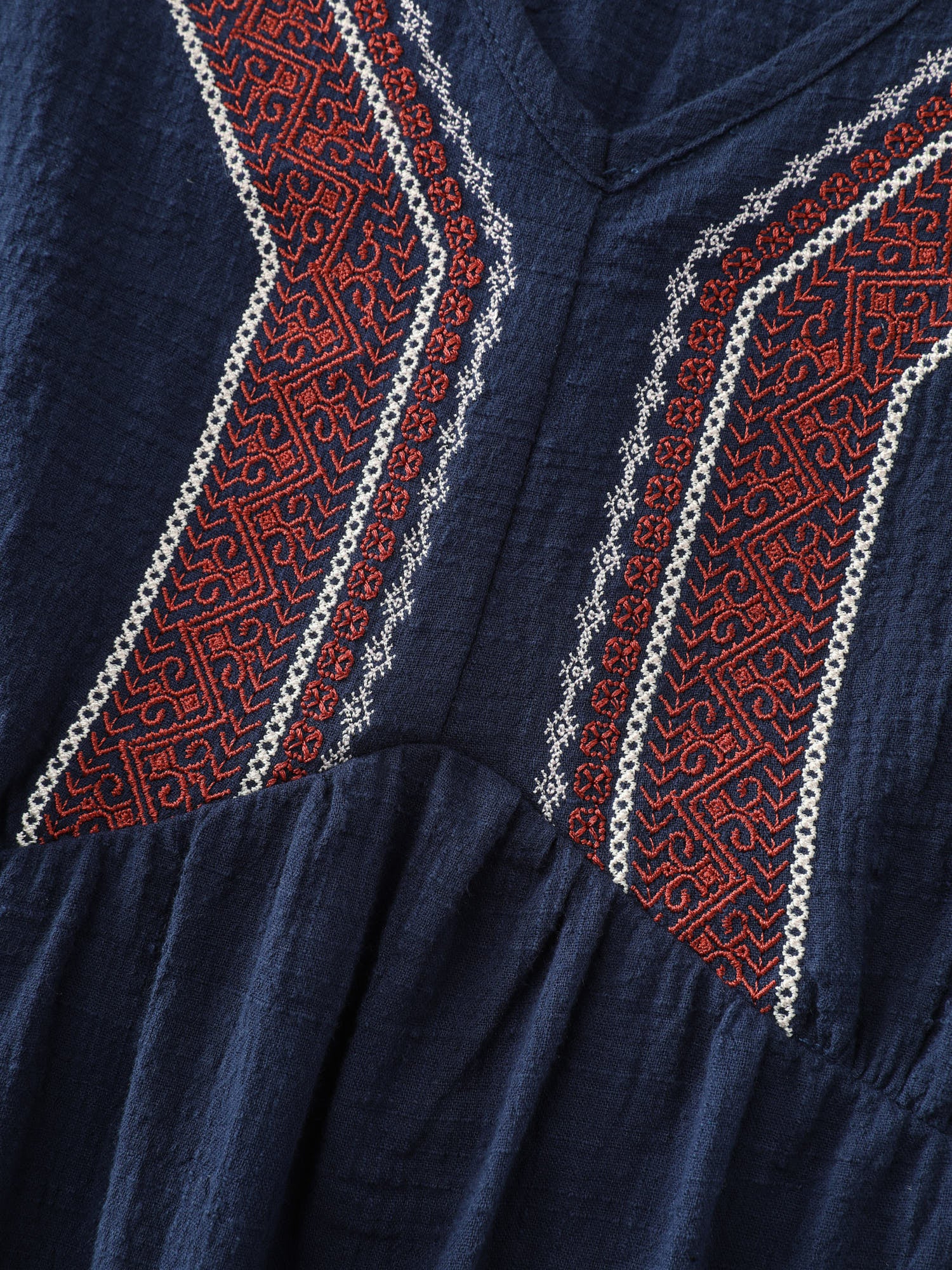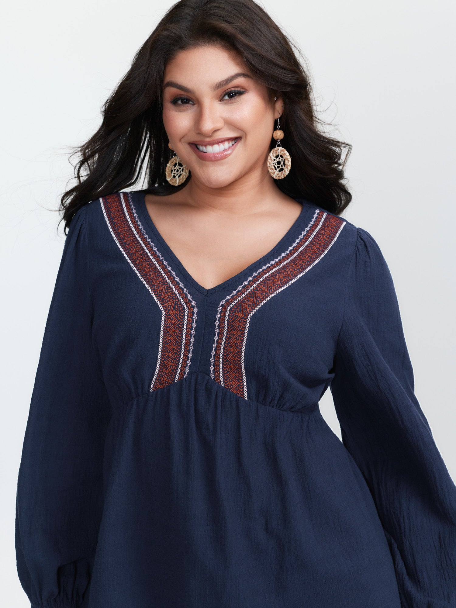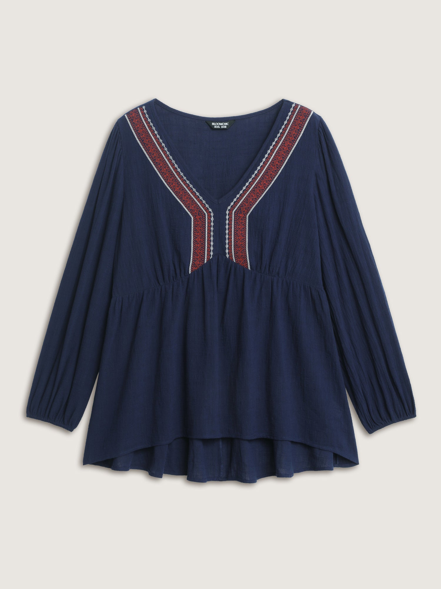 Shop Cotton Embroidered Neckline Babydoll Blouse now and redefine your style with confidence at BloomChic. Tailored for mid and plus-size women. This trendy Tops Women, sizes 10-30. Color:Indigo;Style:Boho;Prints:Bohemian print;Neckline:Deep V-neck;Sleeve Type:Drop shoulder sleeve;Pocket:No-pocket