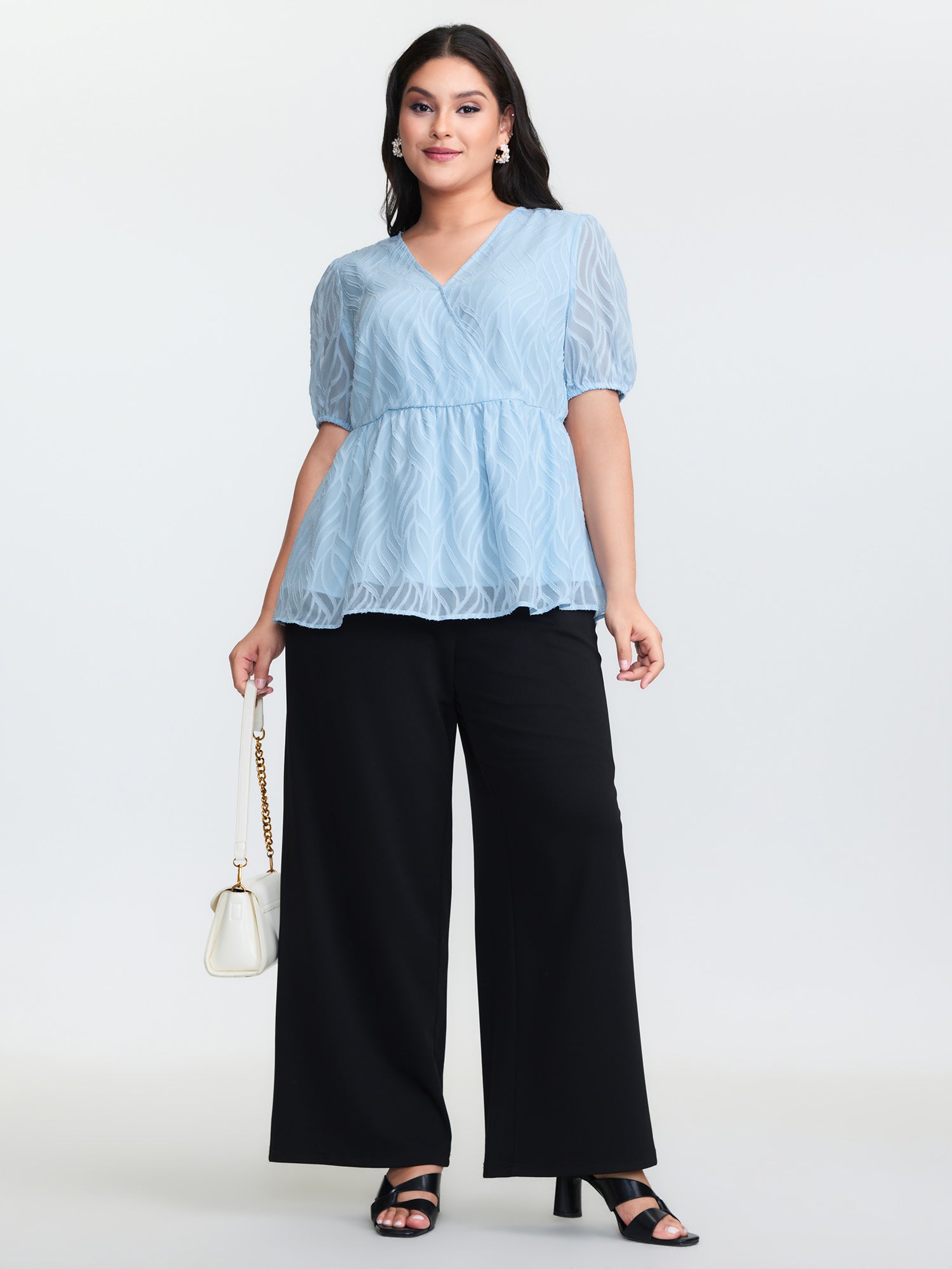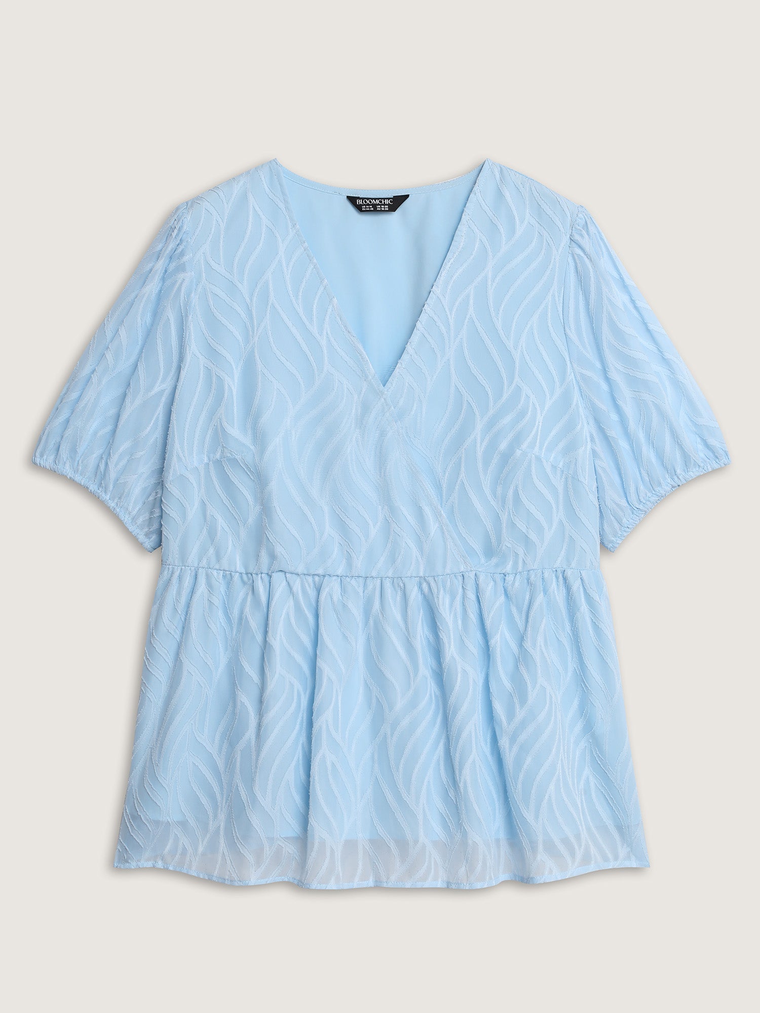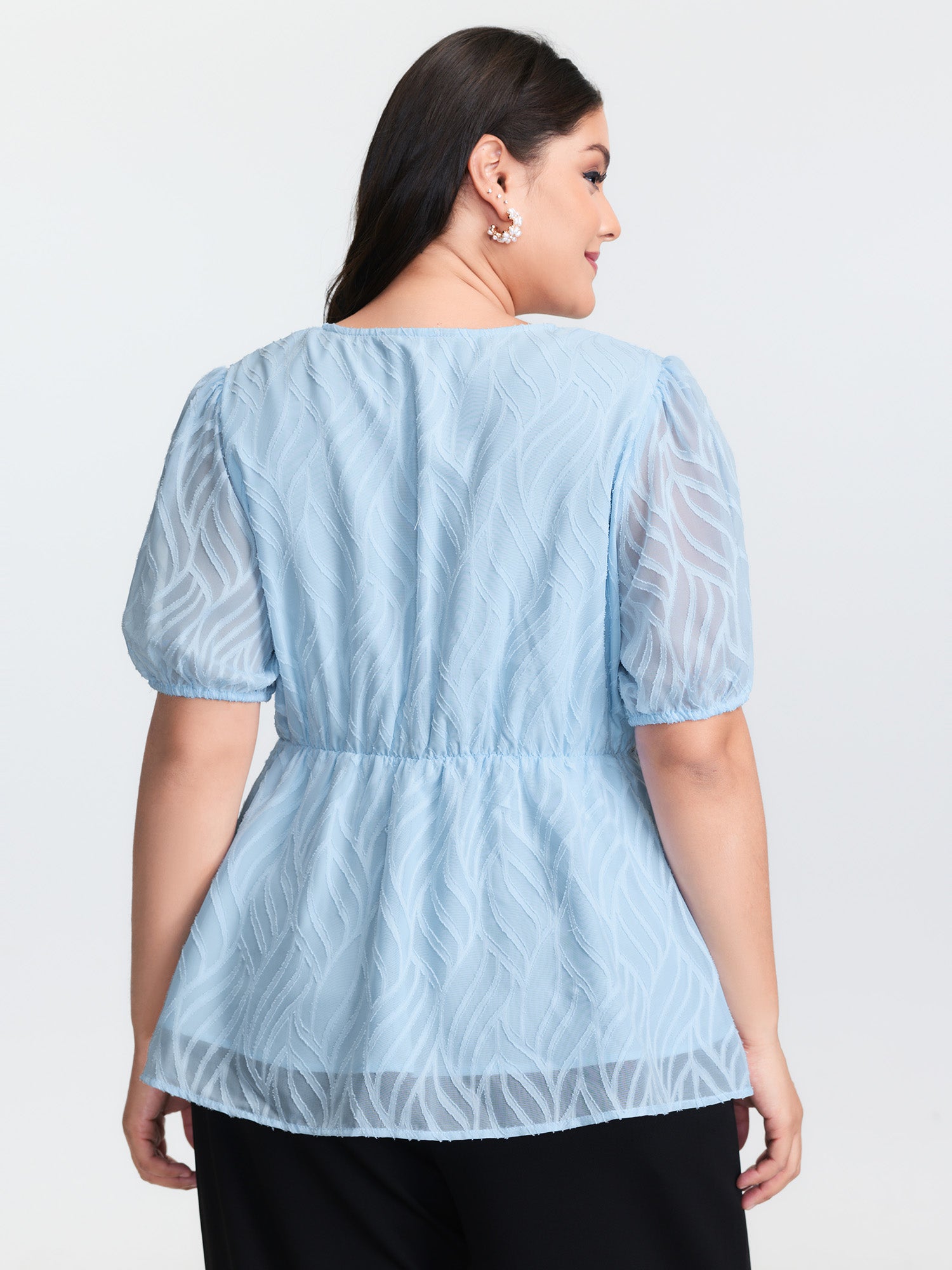 Shop Floral Cut Fabric Stretchy Waist Flared Blouse now and redefine your style with confidence at BloomChic. Tailored for mid and plus-size women. This trendy Tops Women, sizes 10-30. Color:Light Blue;Style_2:Timeless;Prints:Synthetic texture;Neckline:Overlap Collar;Sleeve Type:Lantern Sleeve;Details:See through, Texture, Gathered, Overlapping;Pocket:No-pocket