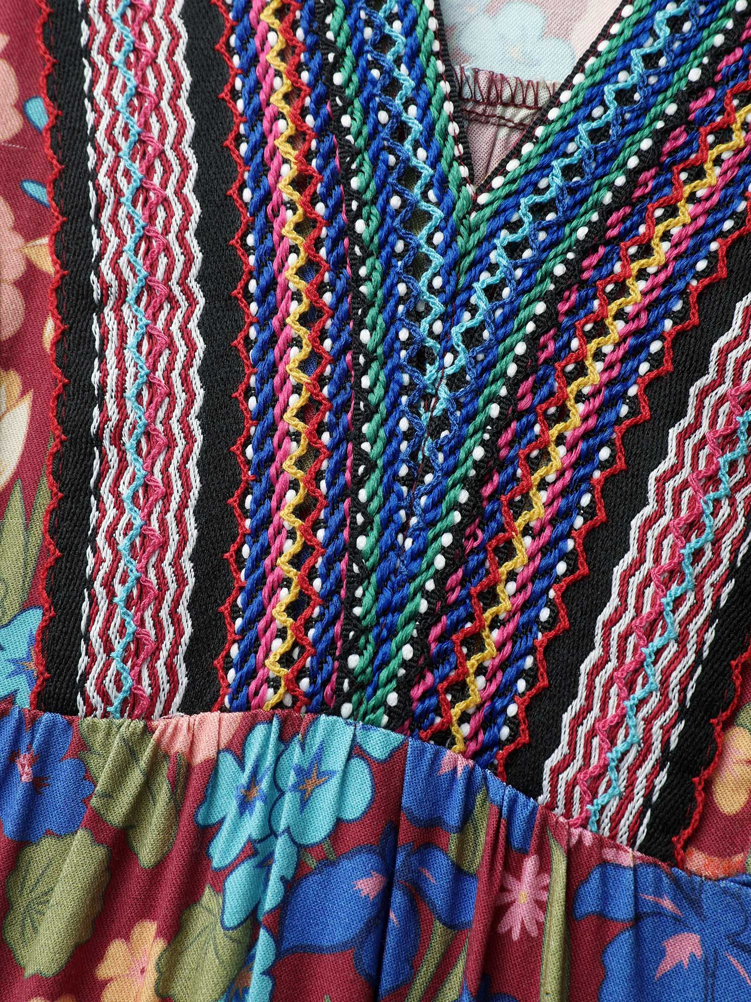 • Floral Print Contrast Webbing Notched Neckline Blouse
