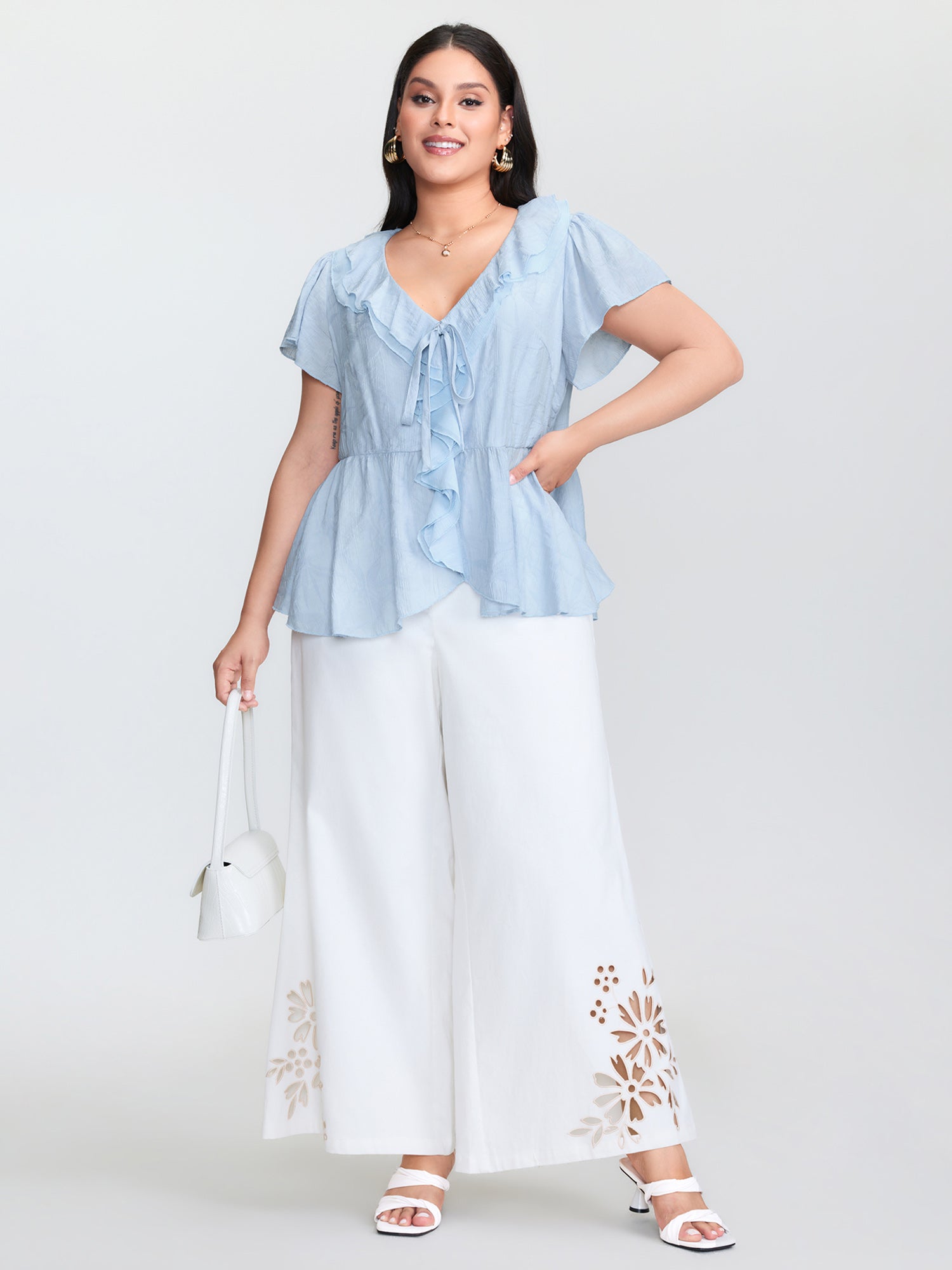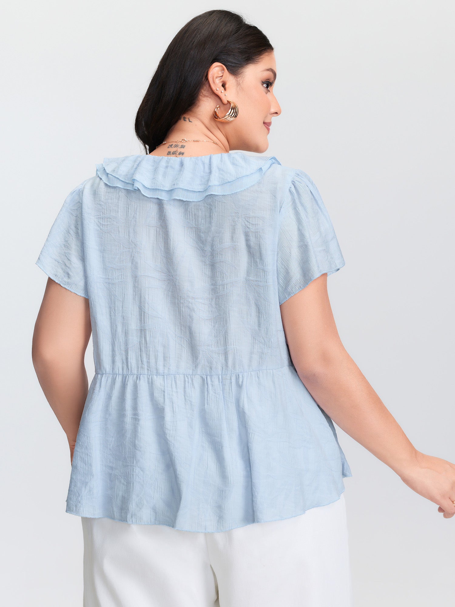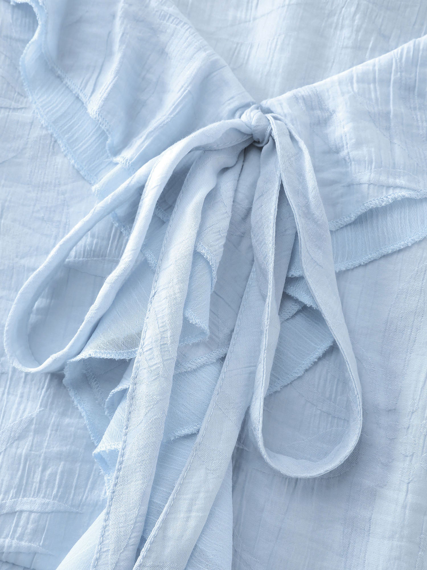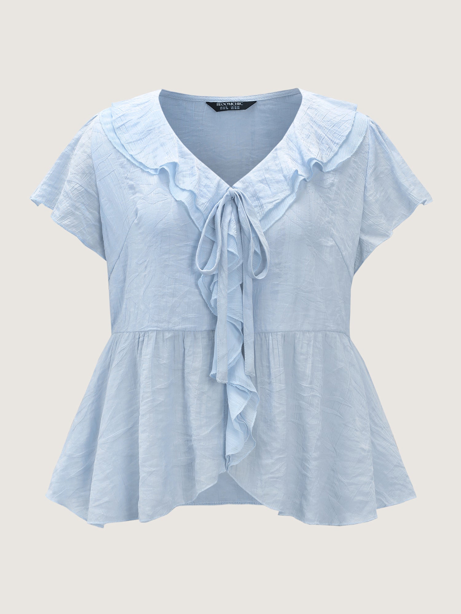 Shop Ruffled Bow-Tie Neckline Textured Blouse now and redefine your style with confidence at BloomChic. Tailored for mid and plus-size women. This trendy Tops Women, sizes 10-30. Color:Light Blue;Style:Romantic;Prints:Synthetic texture;Neckline:Lace collar;Sleeve Type:Ruffle Sleeve;Details:Ruffles, Knotted, Tiered;Pocket:No-pocket