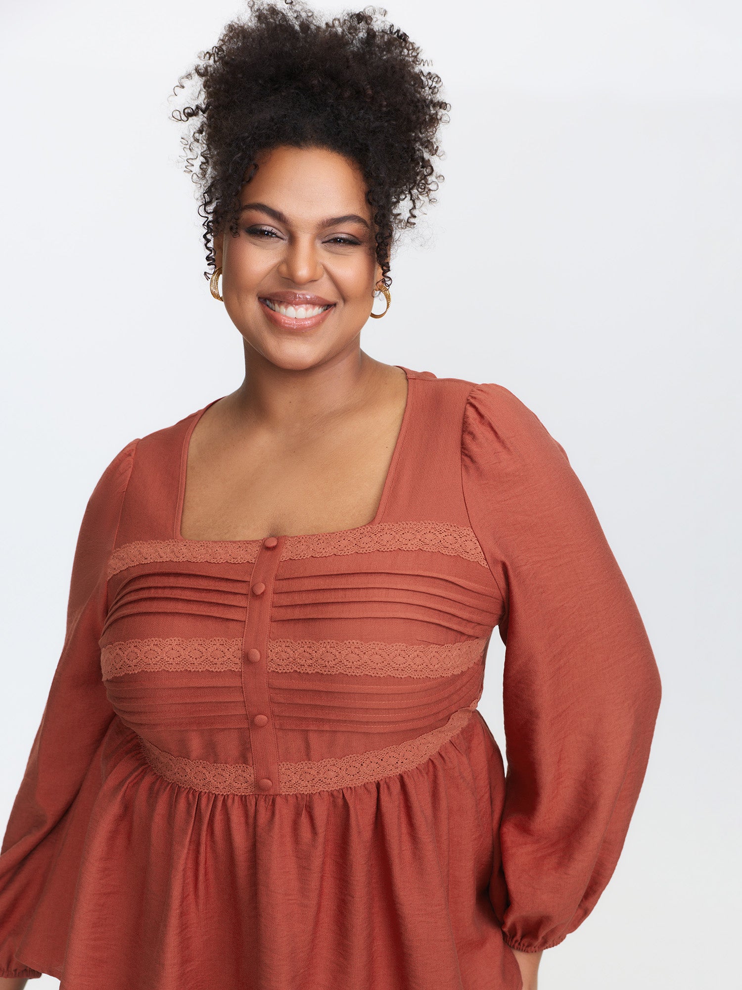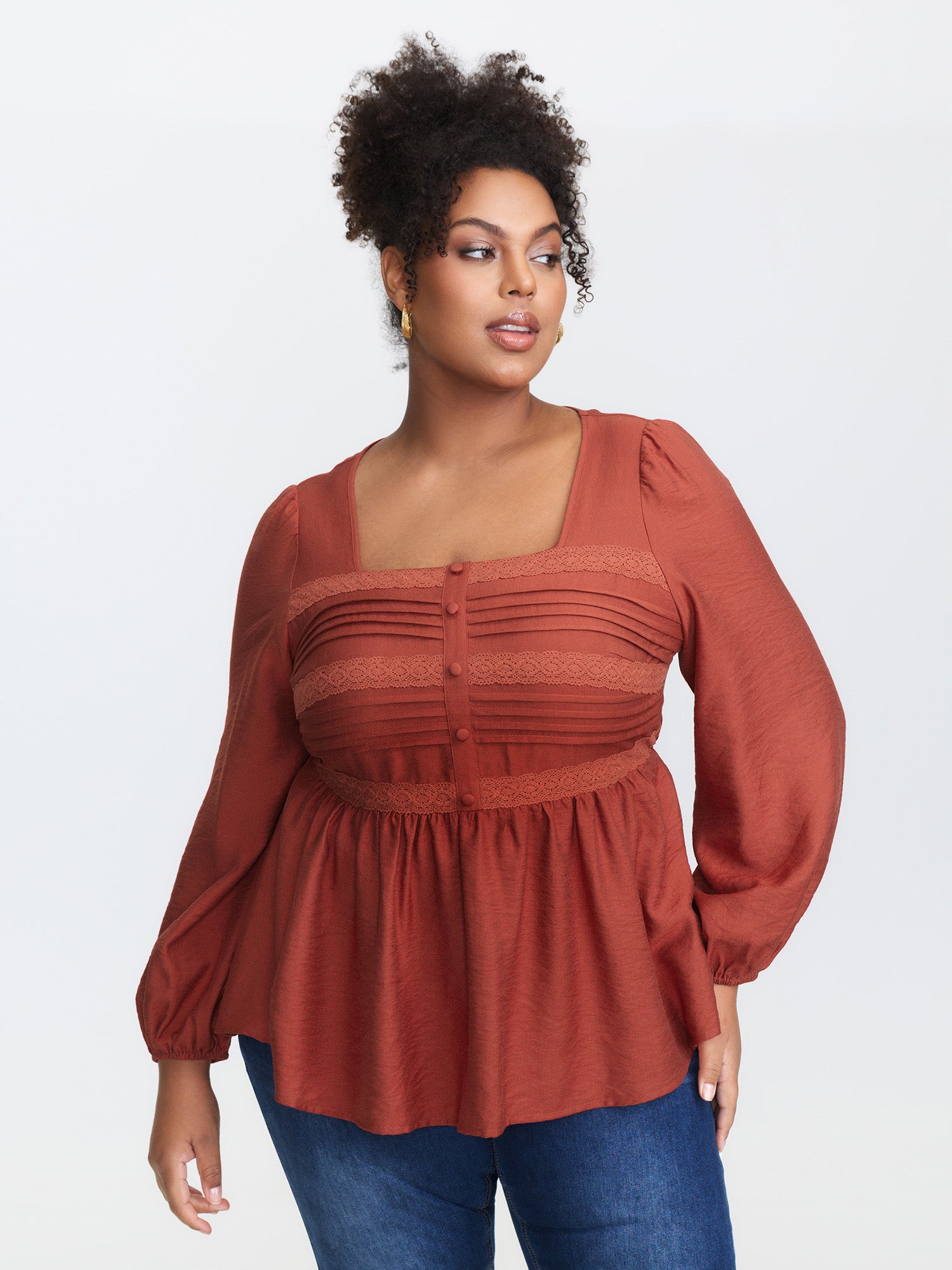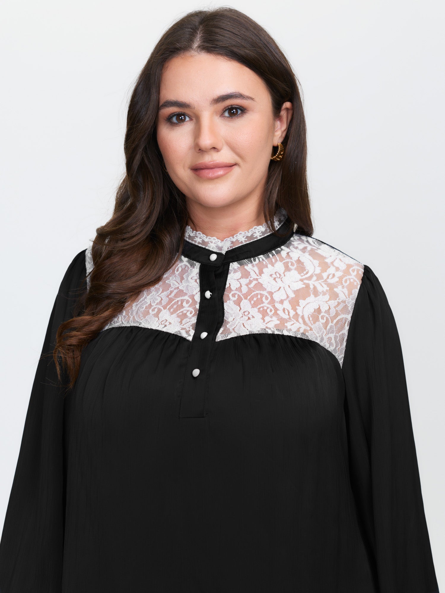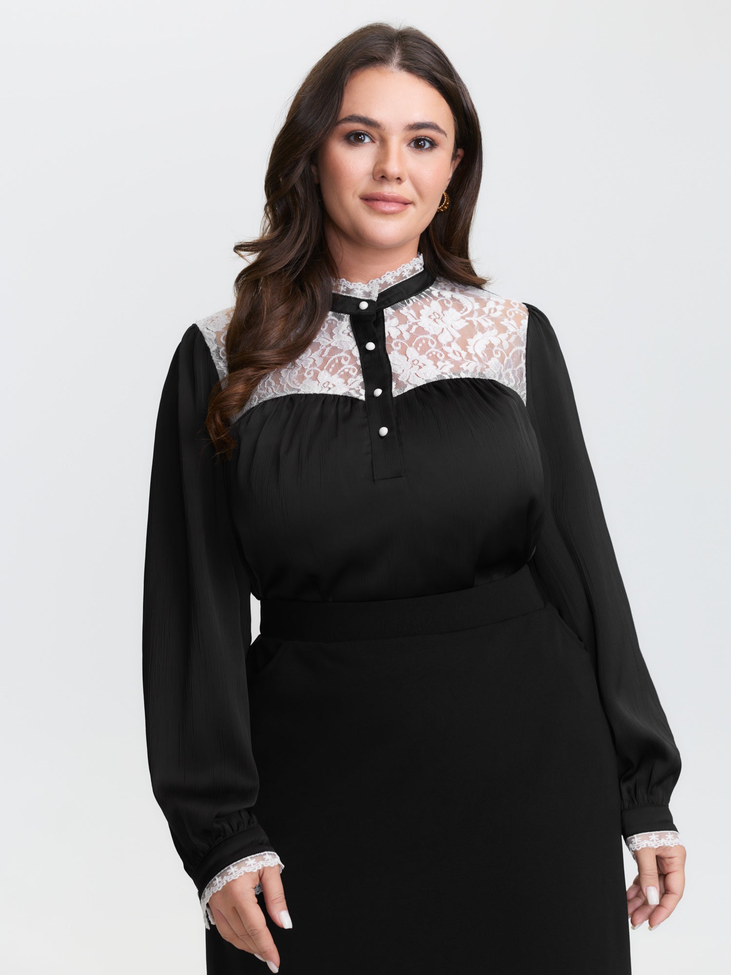 Lace Trim Mock Neck Button Blouse