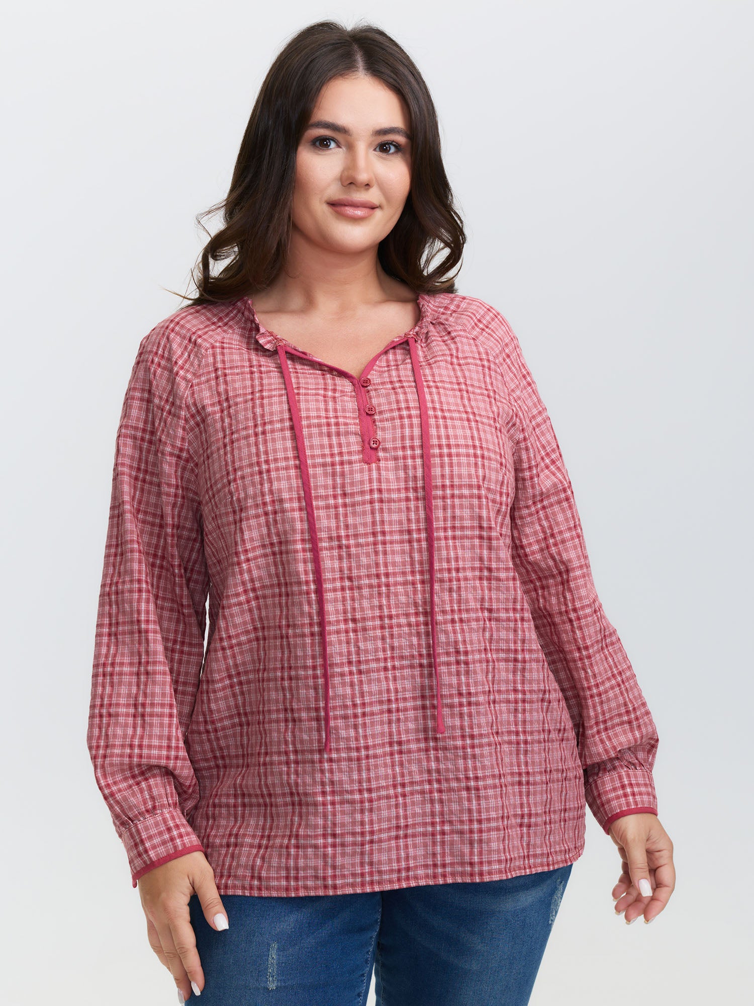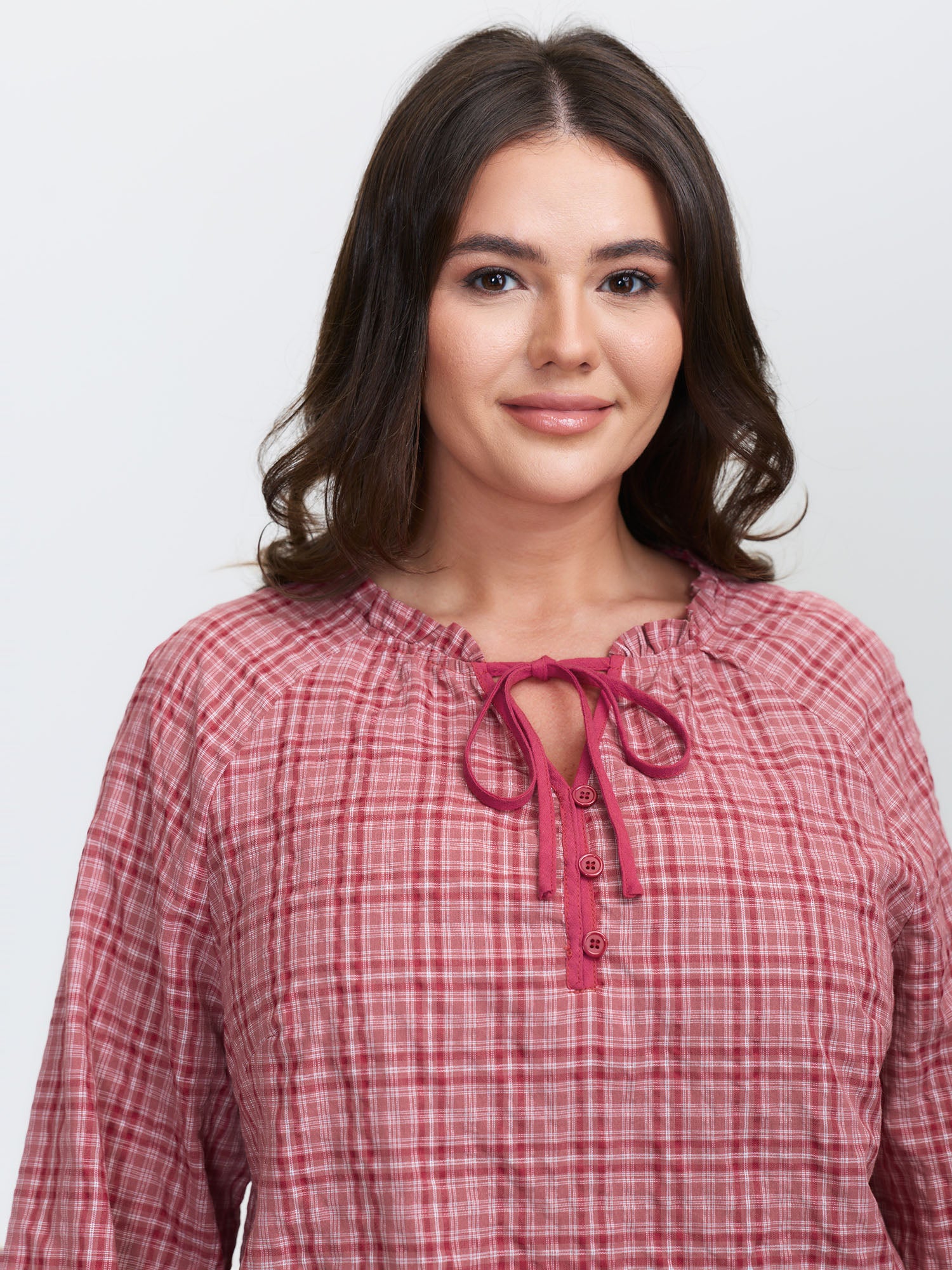Gingham Print Ruffled Neck-Tie Blouse