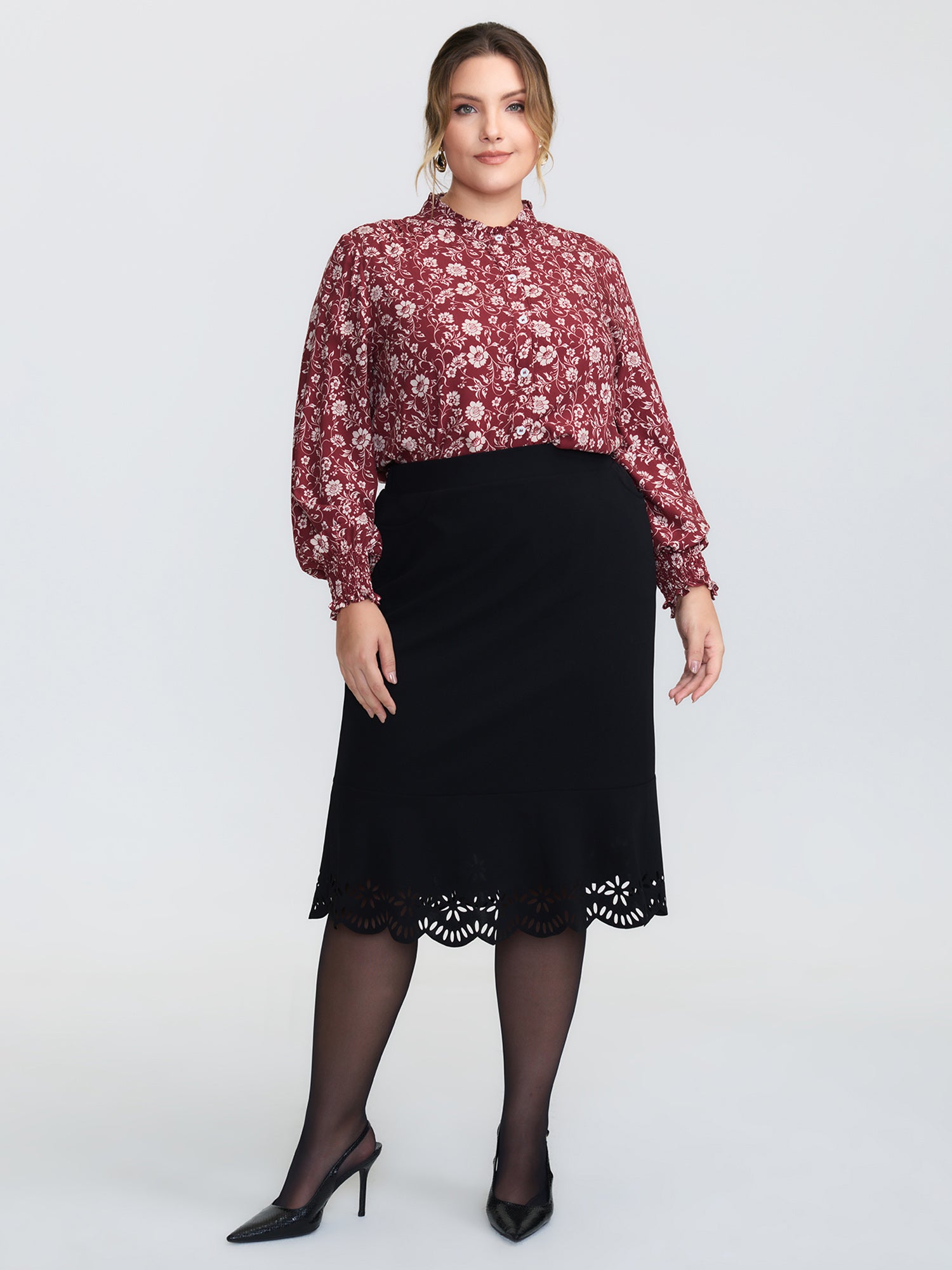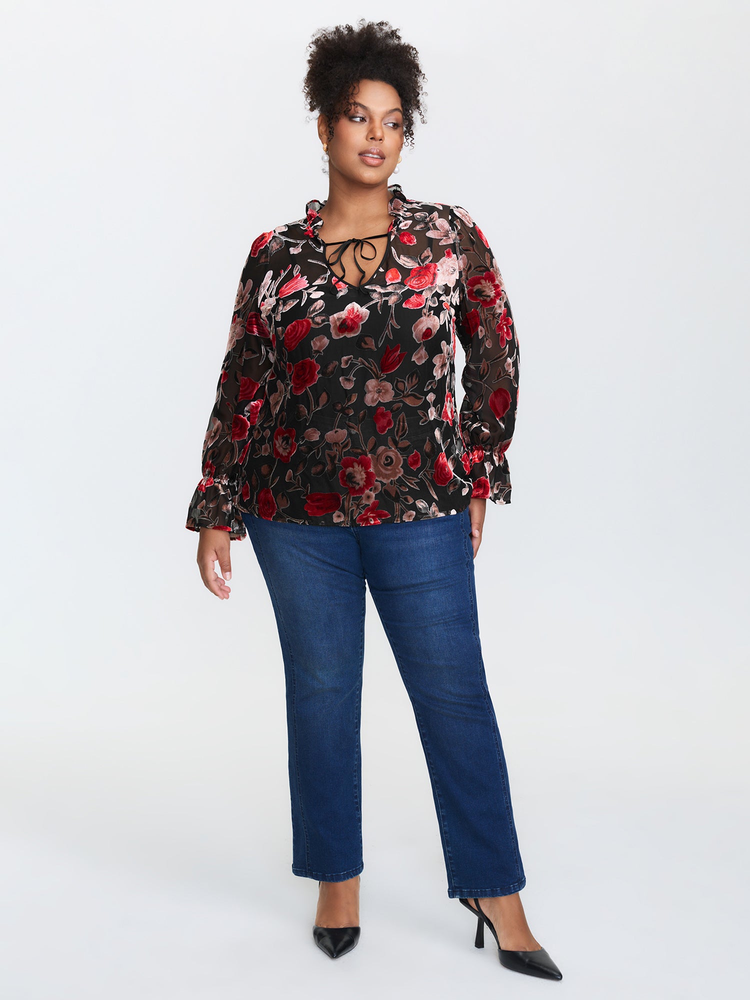 Flock Floral Ruffled Cuff Blouse