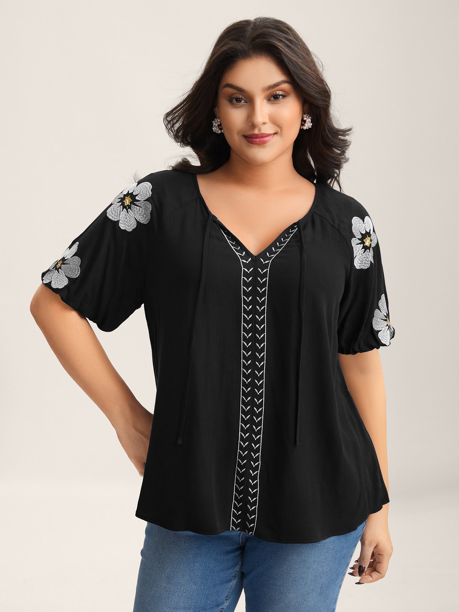 Floral Embroidery Textured Neck Tie Blouse
