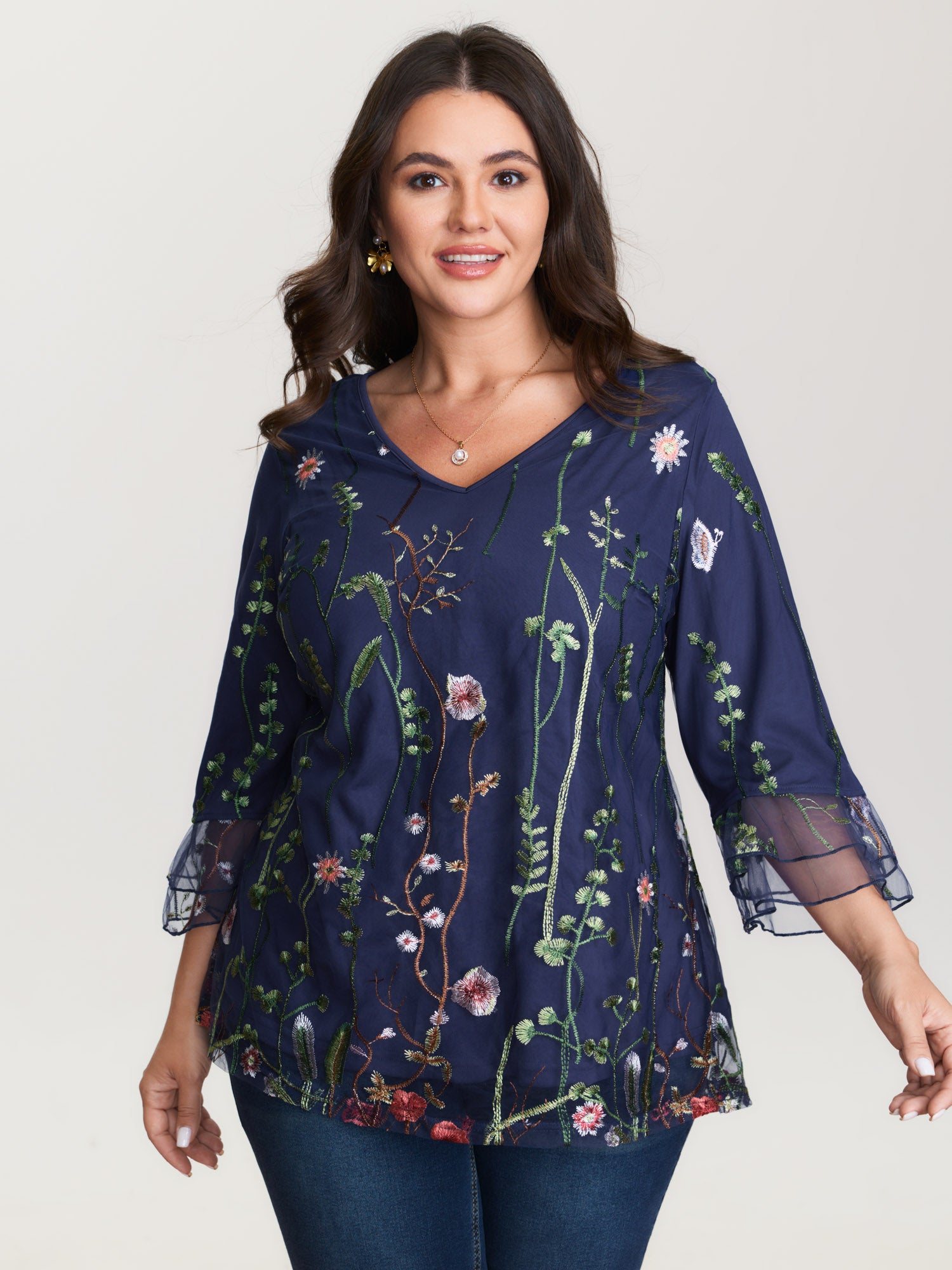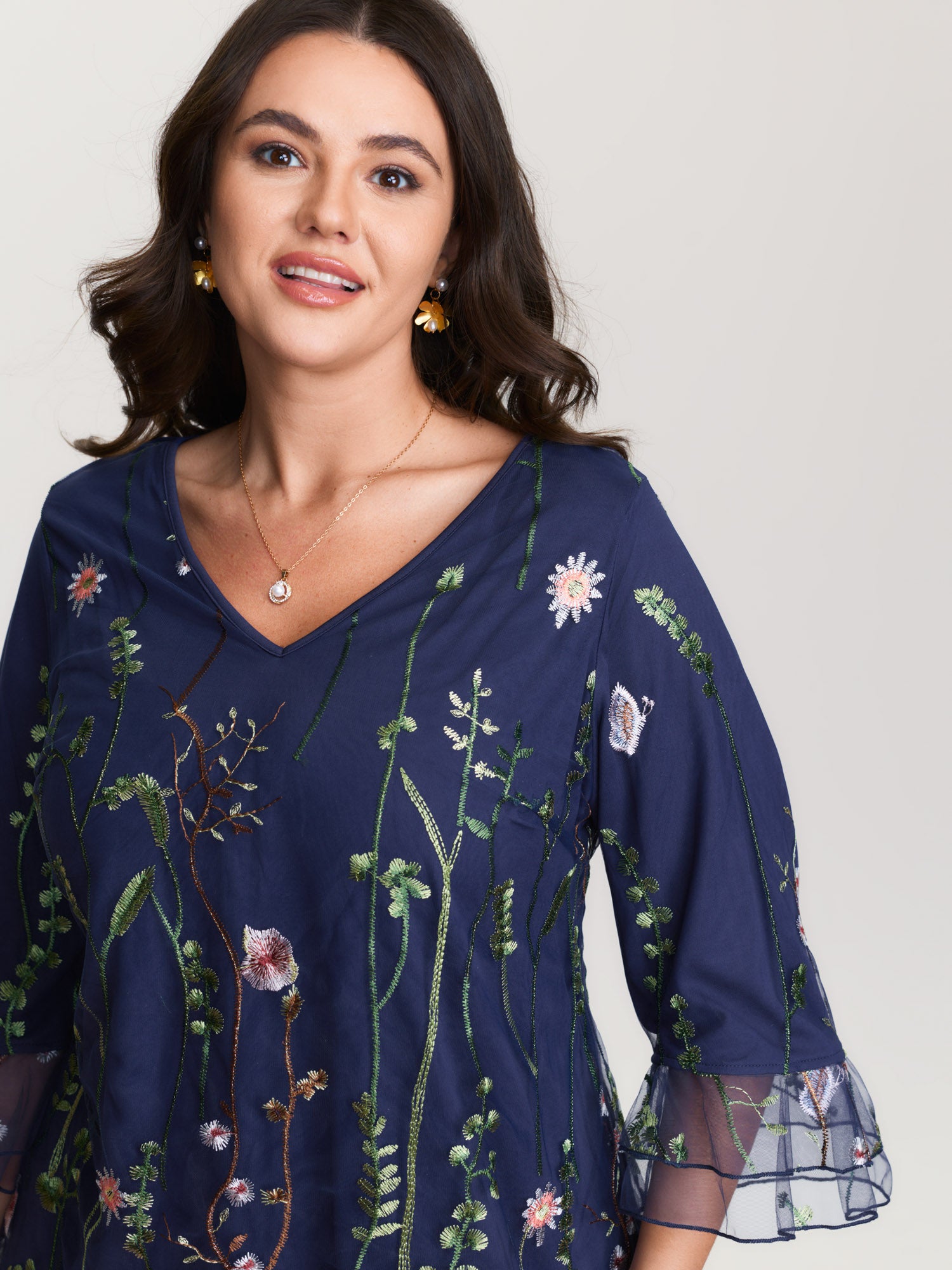 Embroidered Mesh Lotus Leaf Sleeve Blouse