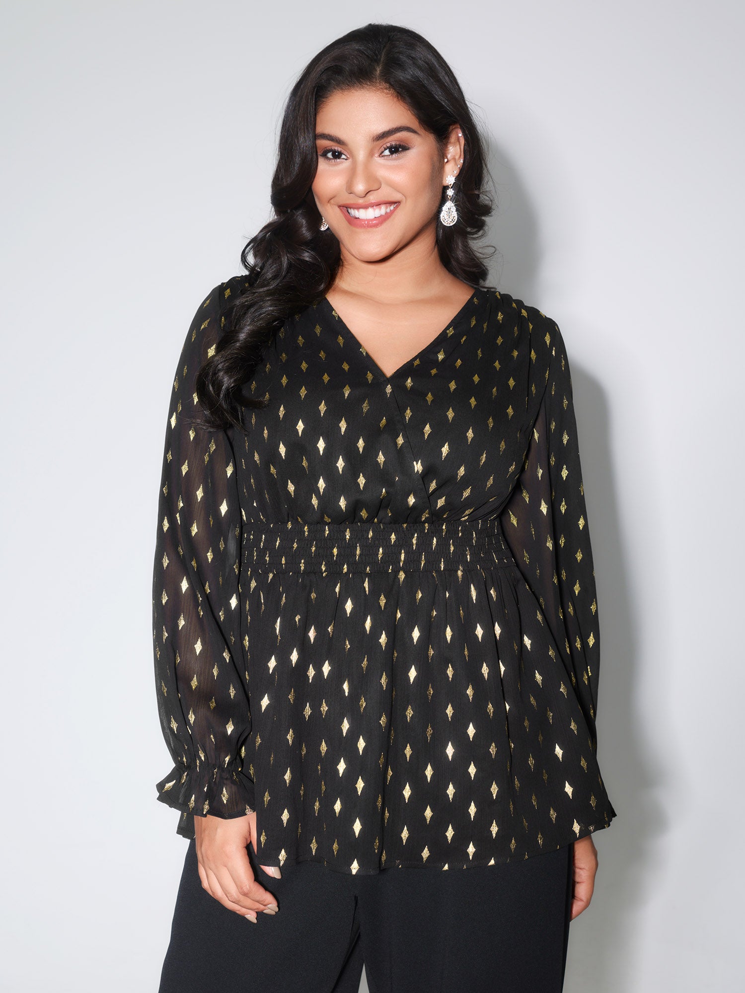 Chiffon Gold Stamp Shirred Waist Blouse
