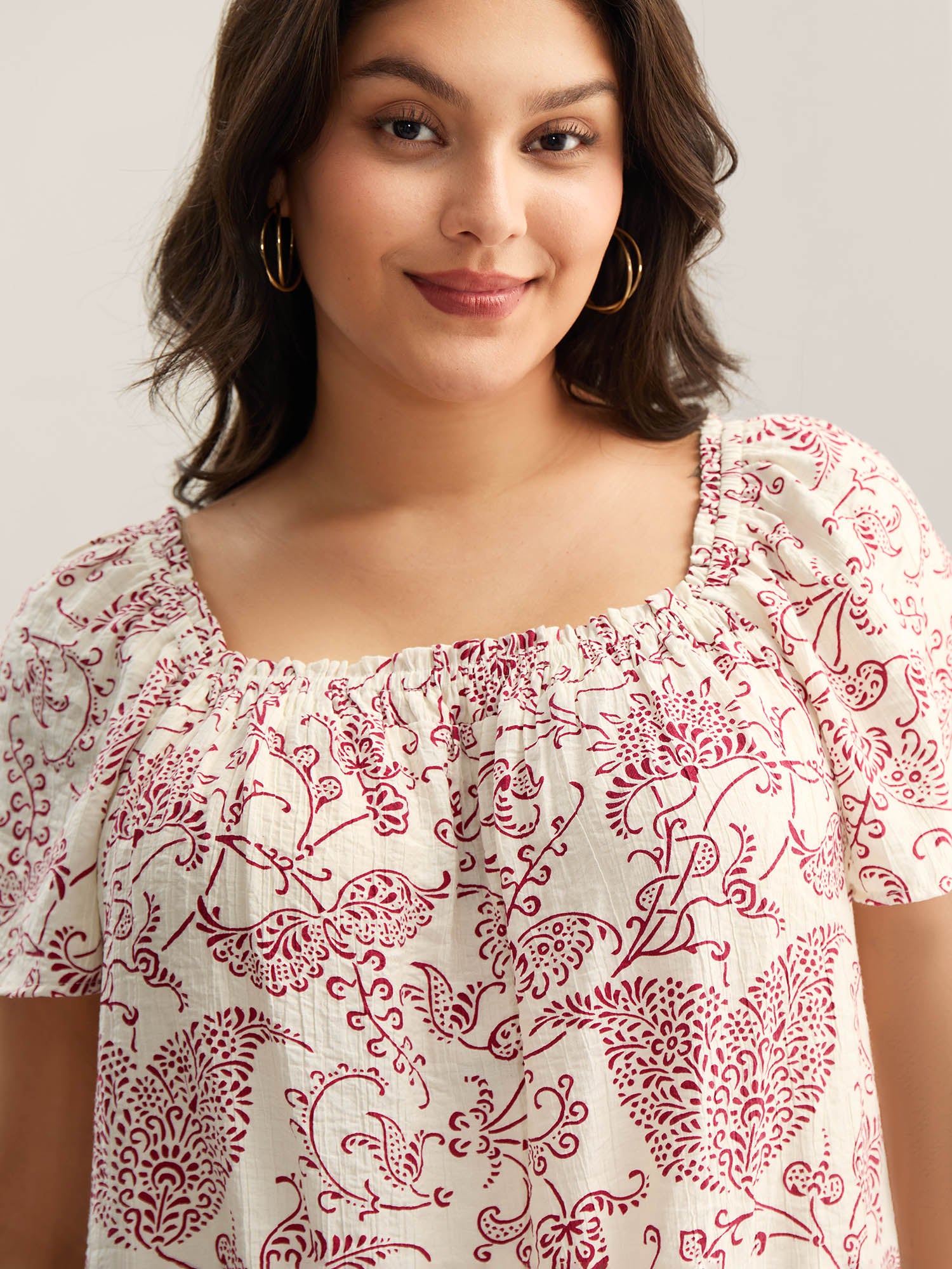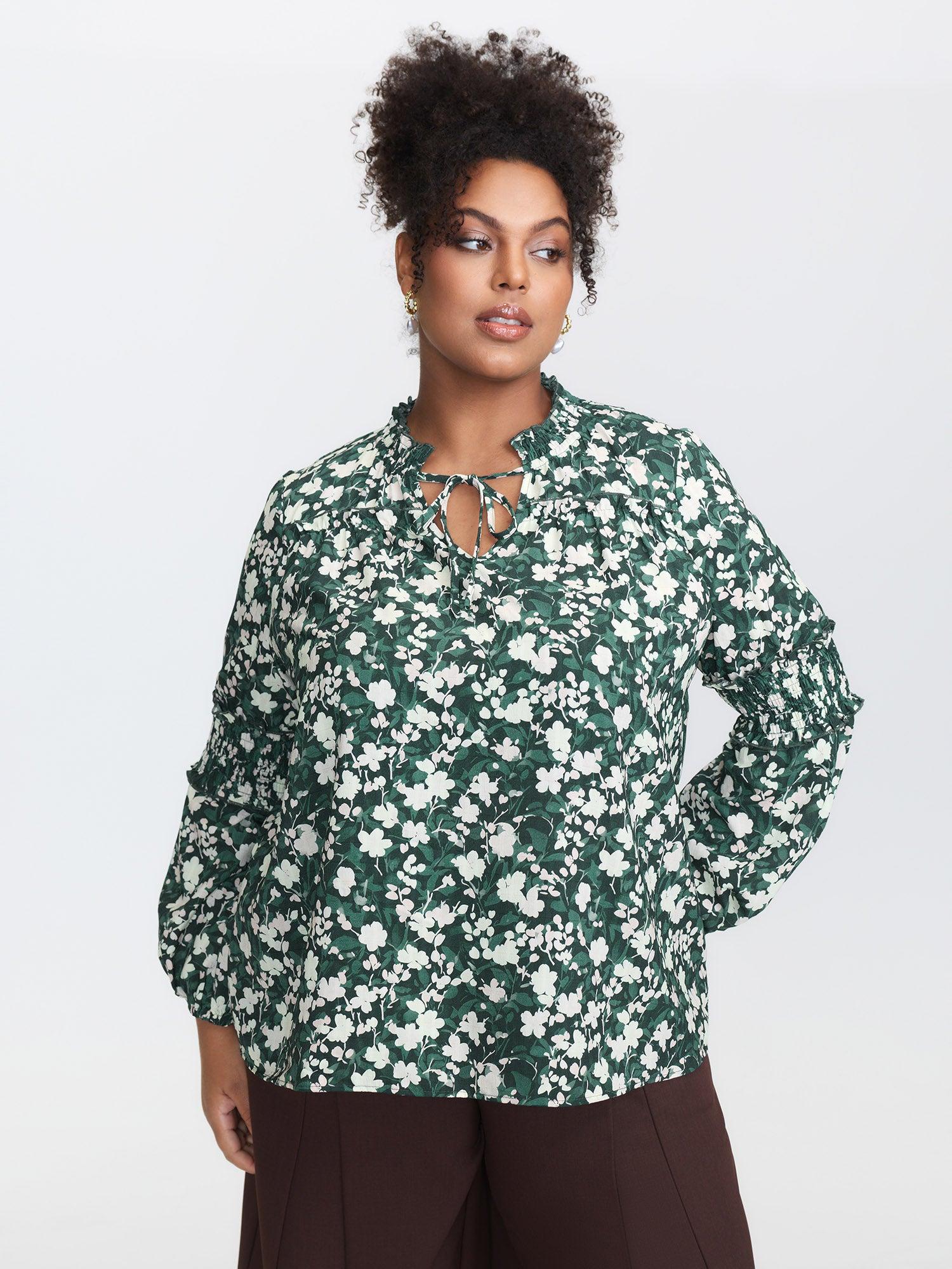 Floral Print Shirred Neck Flowy Blouse