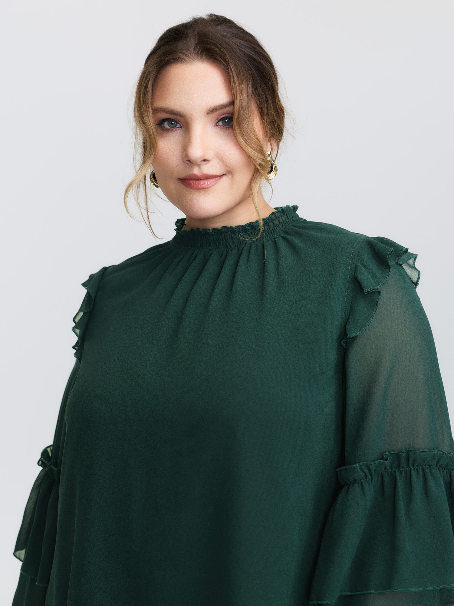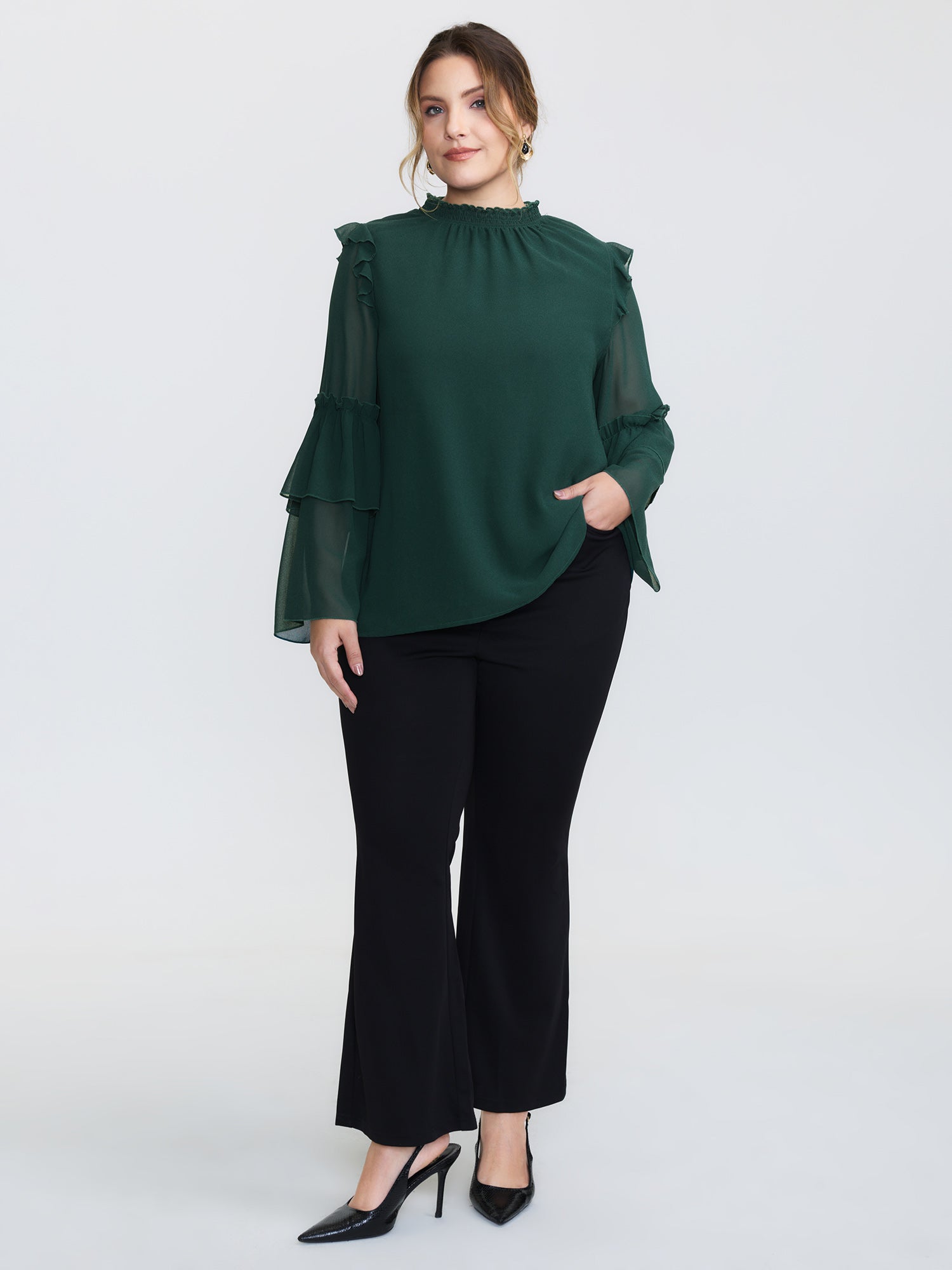 Shirred Layered Ruffled Sheer Sleeve Blouse