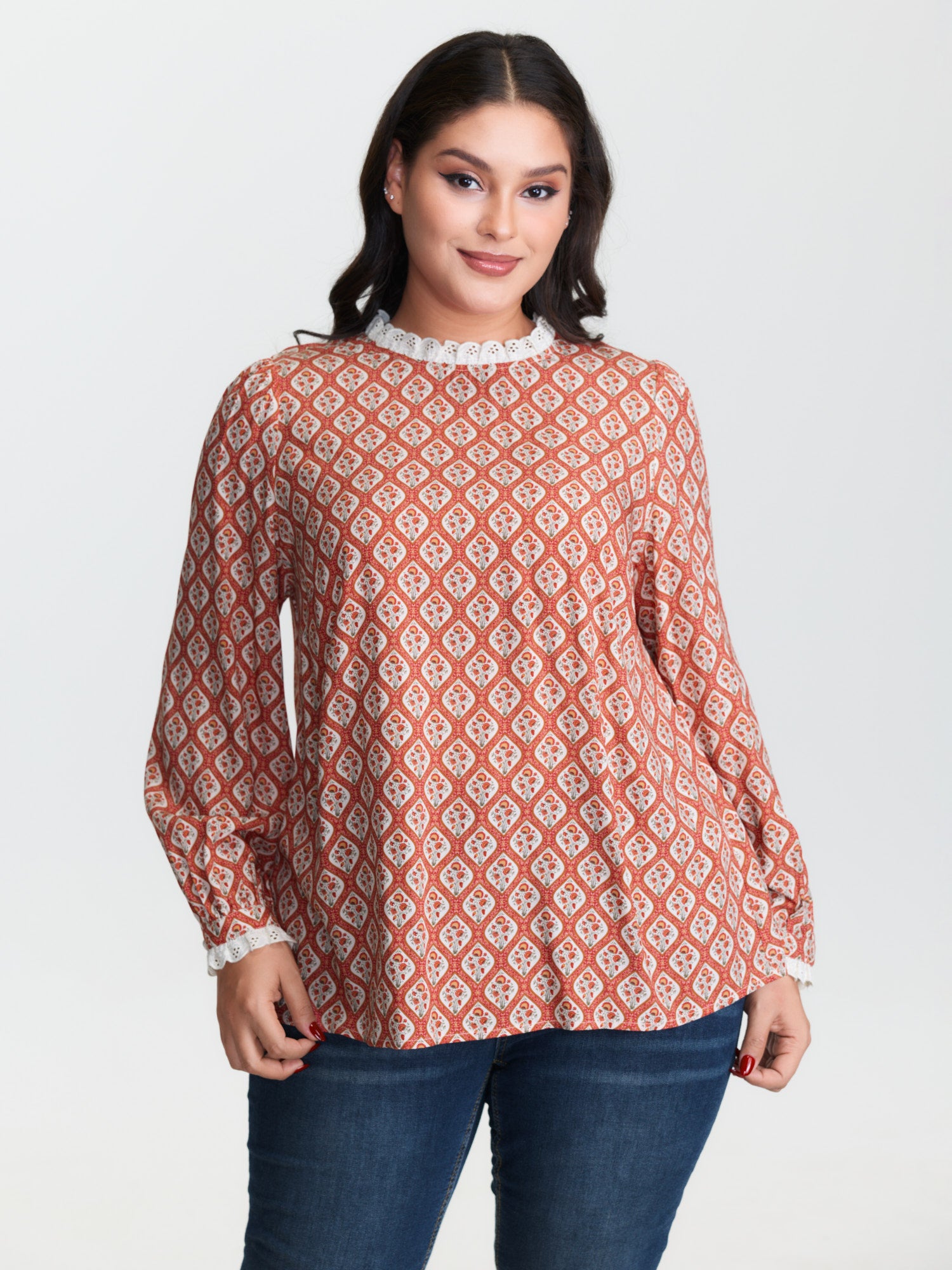 Floral Button Front Lace Relaxed Fit Blouse