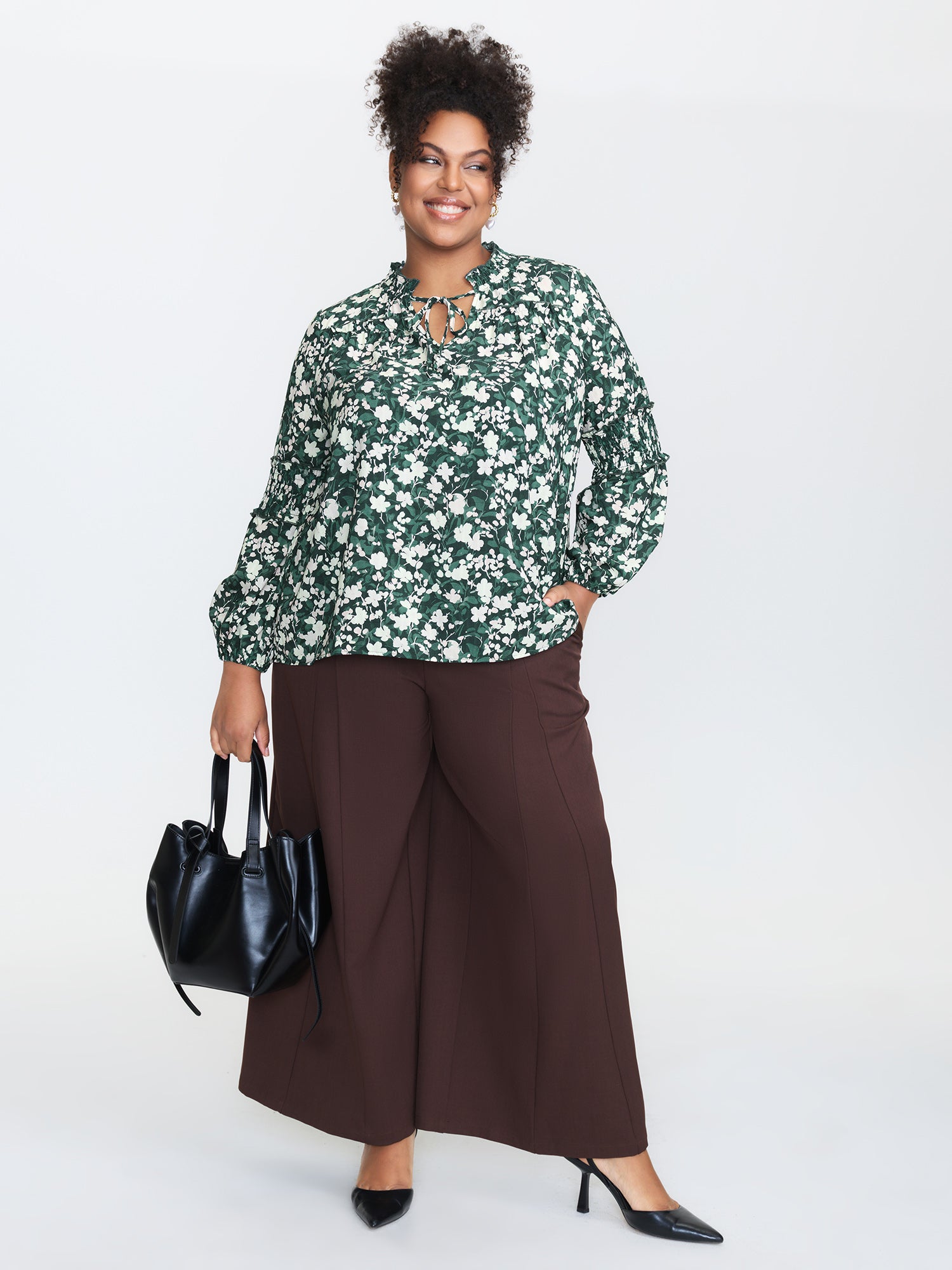 Crisp Leaf Print Shirred Waist Blouse