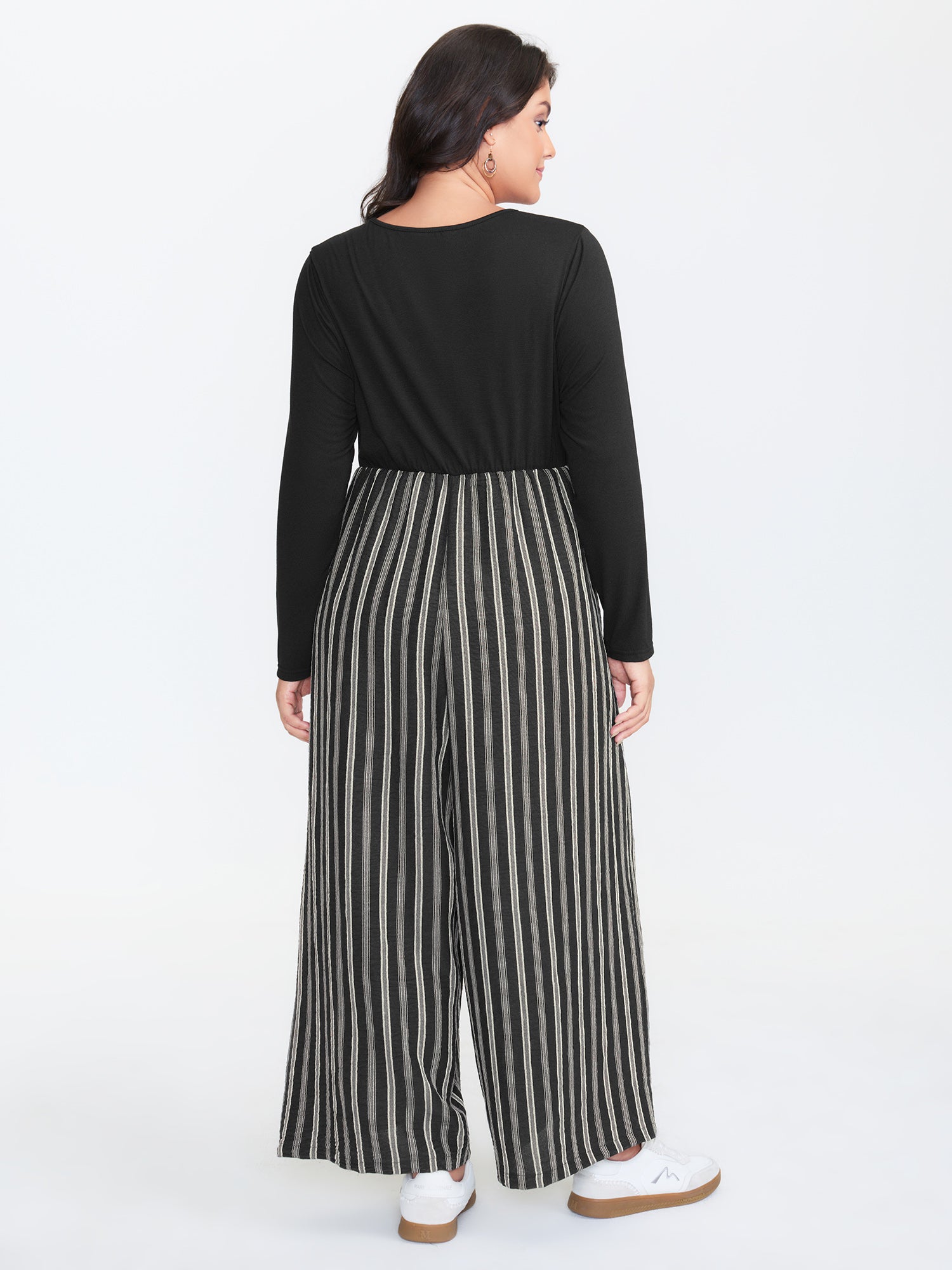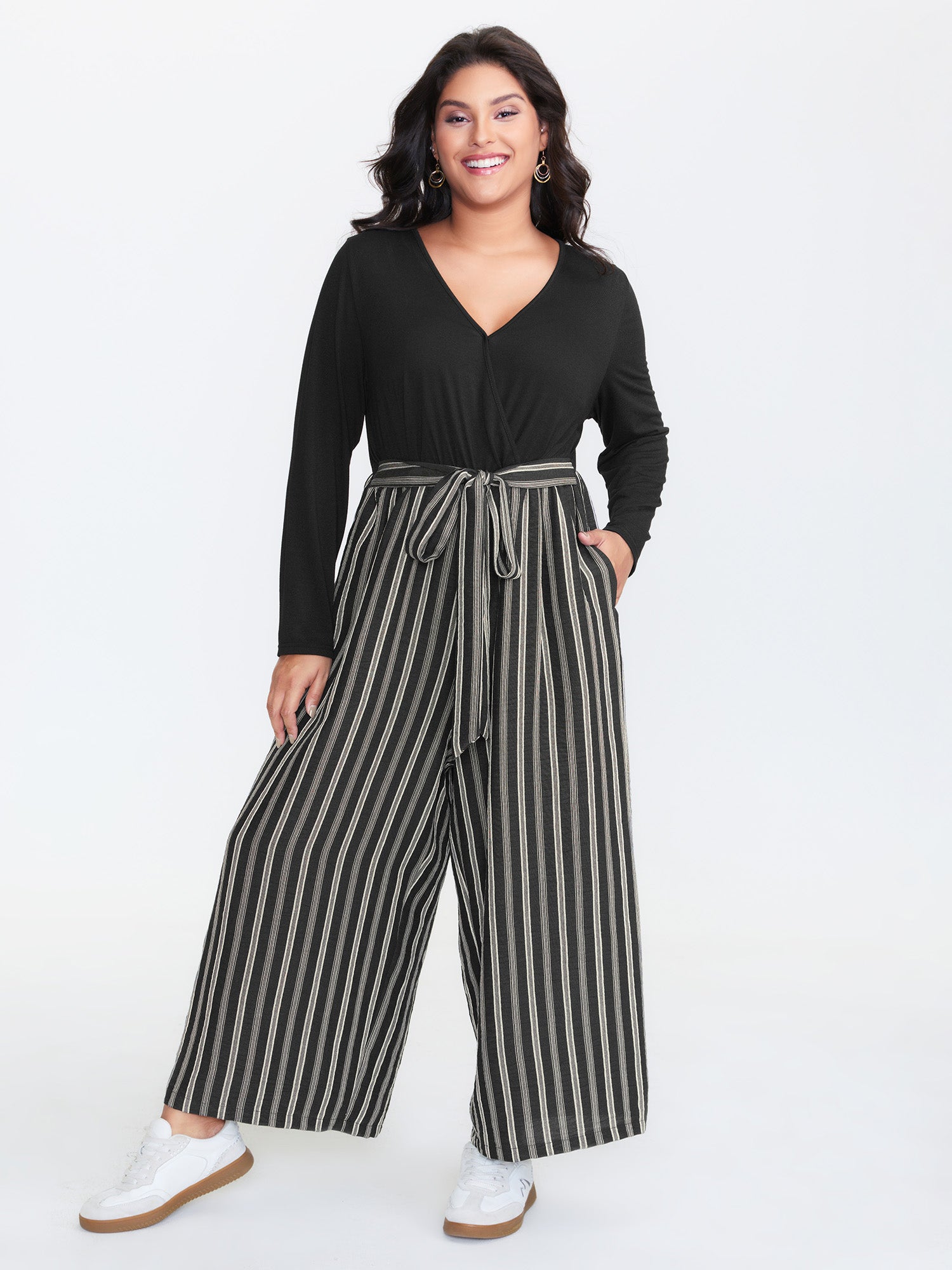 Shop Stripes Color Contrast Jumpsuit now and redefine your style with confidence at BloomChic. Tailored for mid and plus-size women. This trendy Jumpsuits Women, sizes 10-30. Color:Black;Style:Leisure;Neckline:Overlap Collar;Sleeve Type:Regular Sleeve;Prints:Stripes;Details:Tie knot, Contrast, Overlapping;Pocket:Side seam pocket;Belt:No-belt;Closure Type:Button