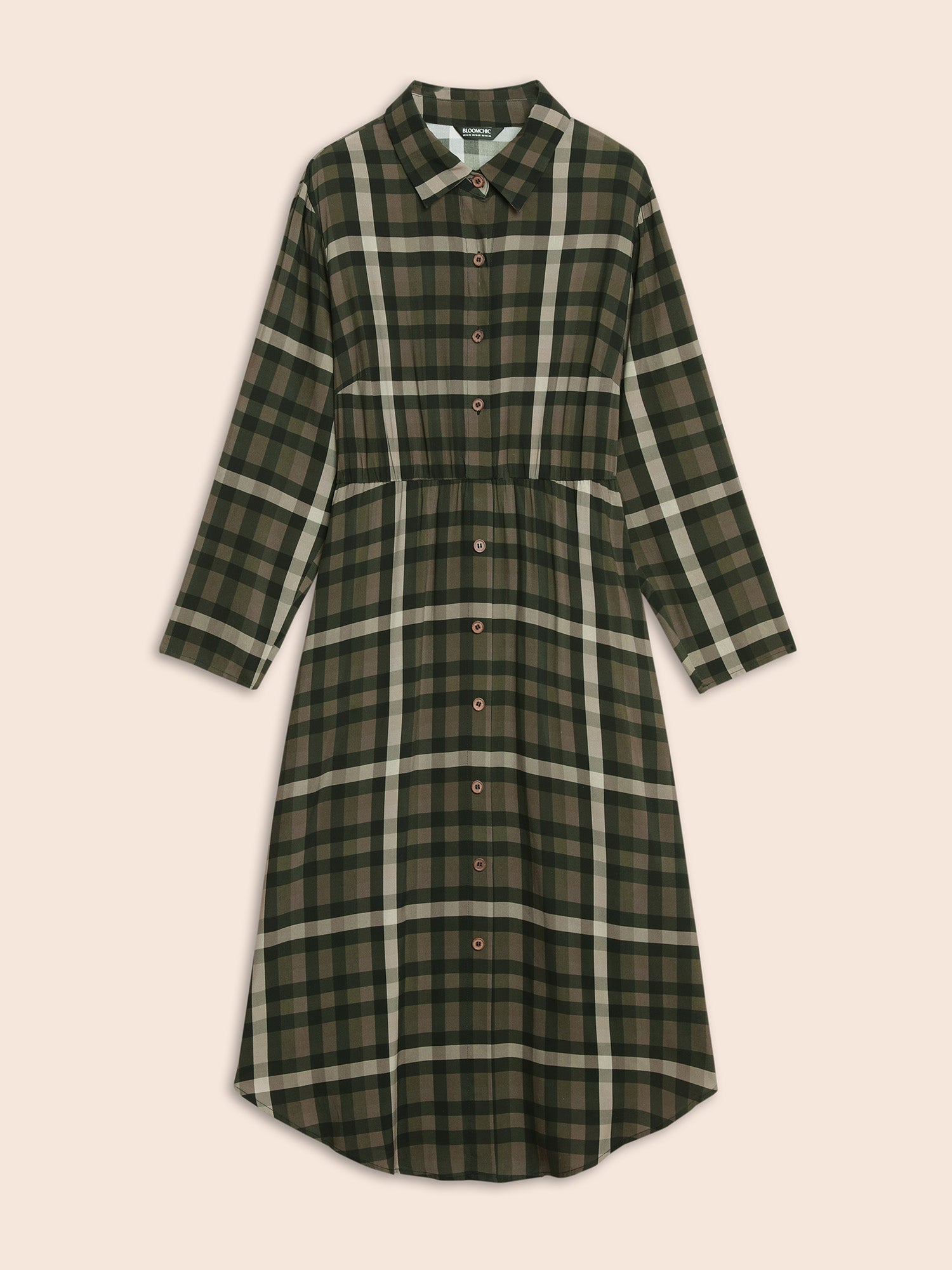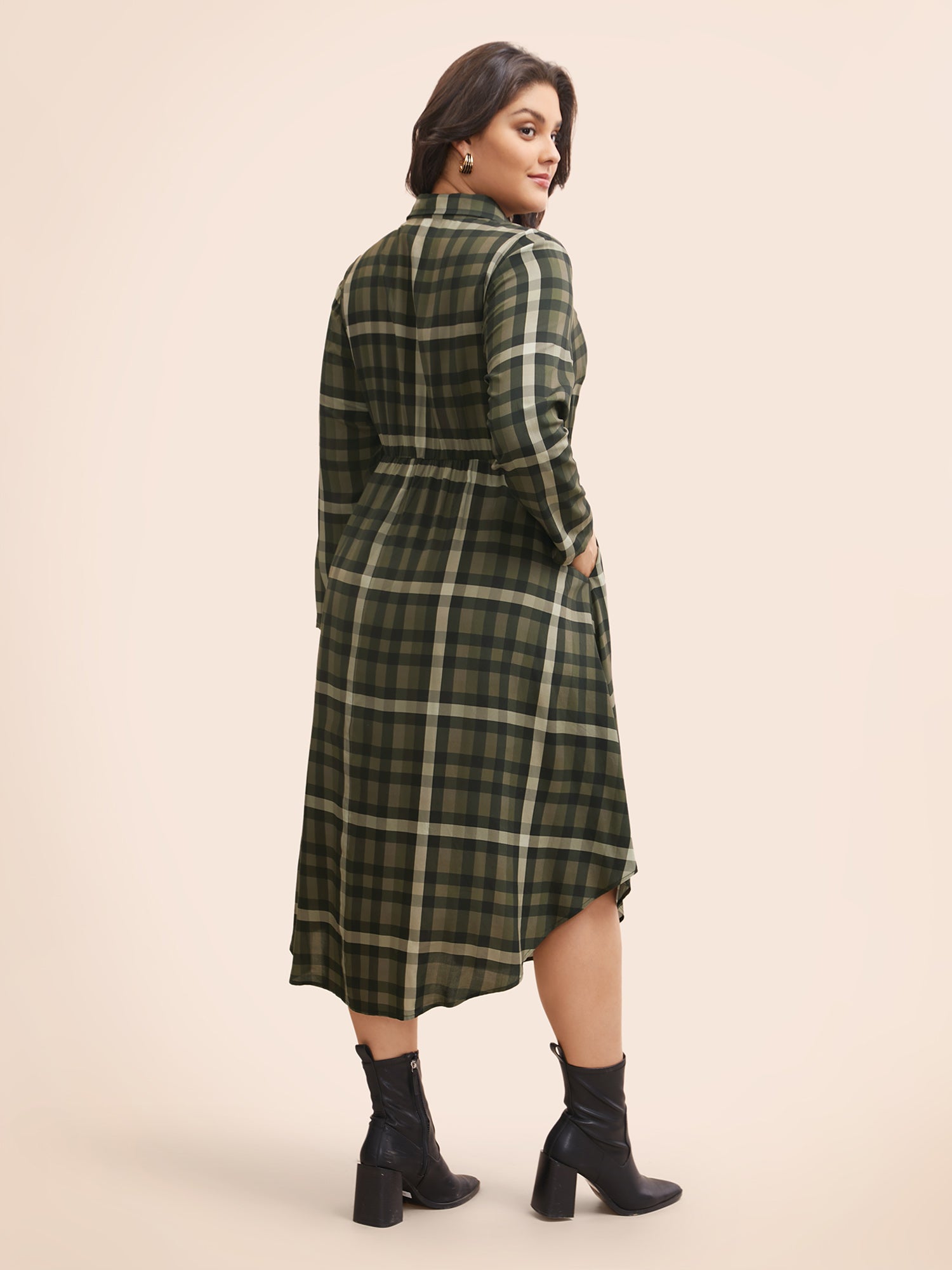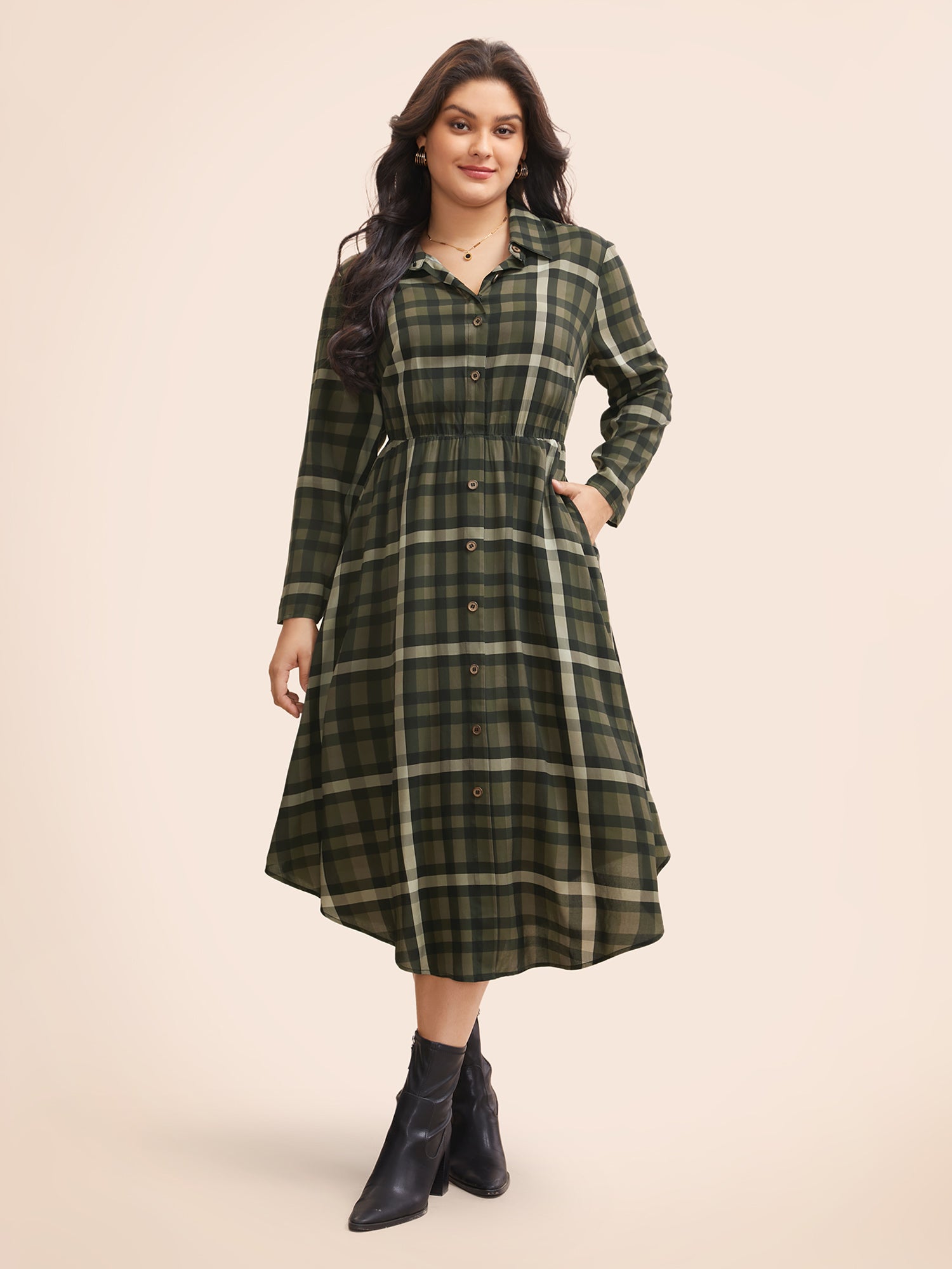 Shop Plaid Shirt Collar Curved Hem Dress now and redefine your style with confidence at BloomChic. Tailored for mid and plus-size women. This trendy Dress, sizes 10-30. You can never go wrong with BloomChic Dresses. Season:Winter;Color:Yellowishbrown;Style:Elegant;Neckline:Shirt collar;Sleeve Type:Regular Sleeve;Prints:Plaid;Details:Button;Pocket:Side seam pocket;Belt:No-belt;Closure Type:Non