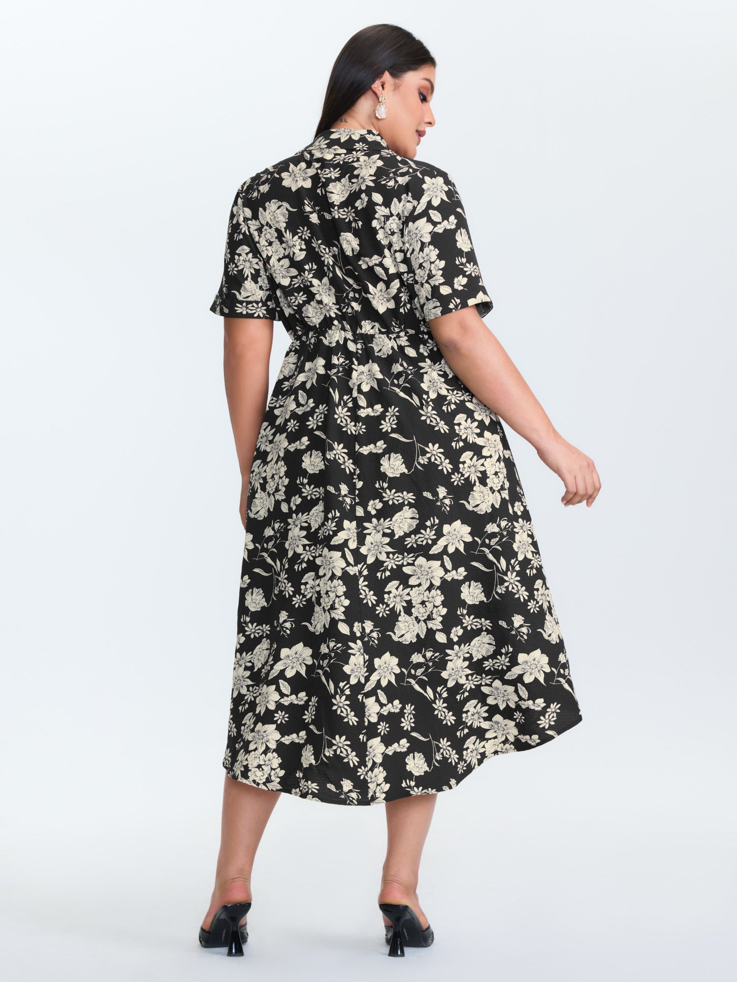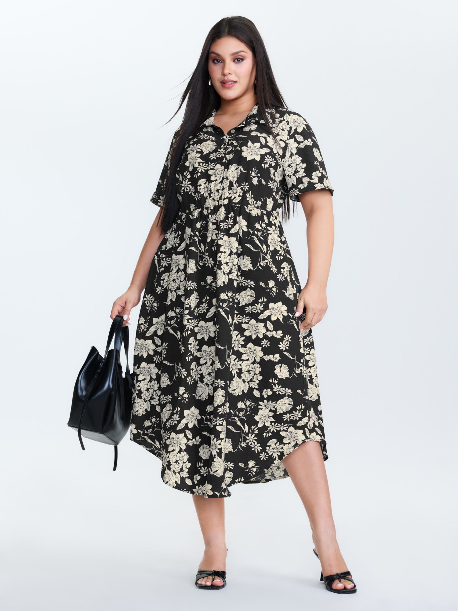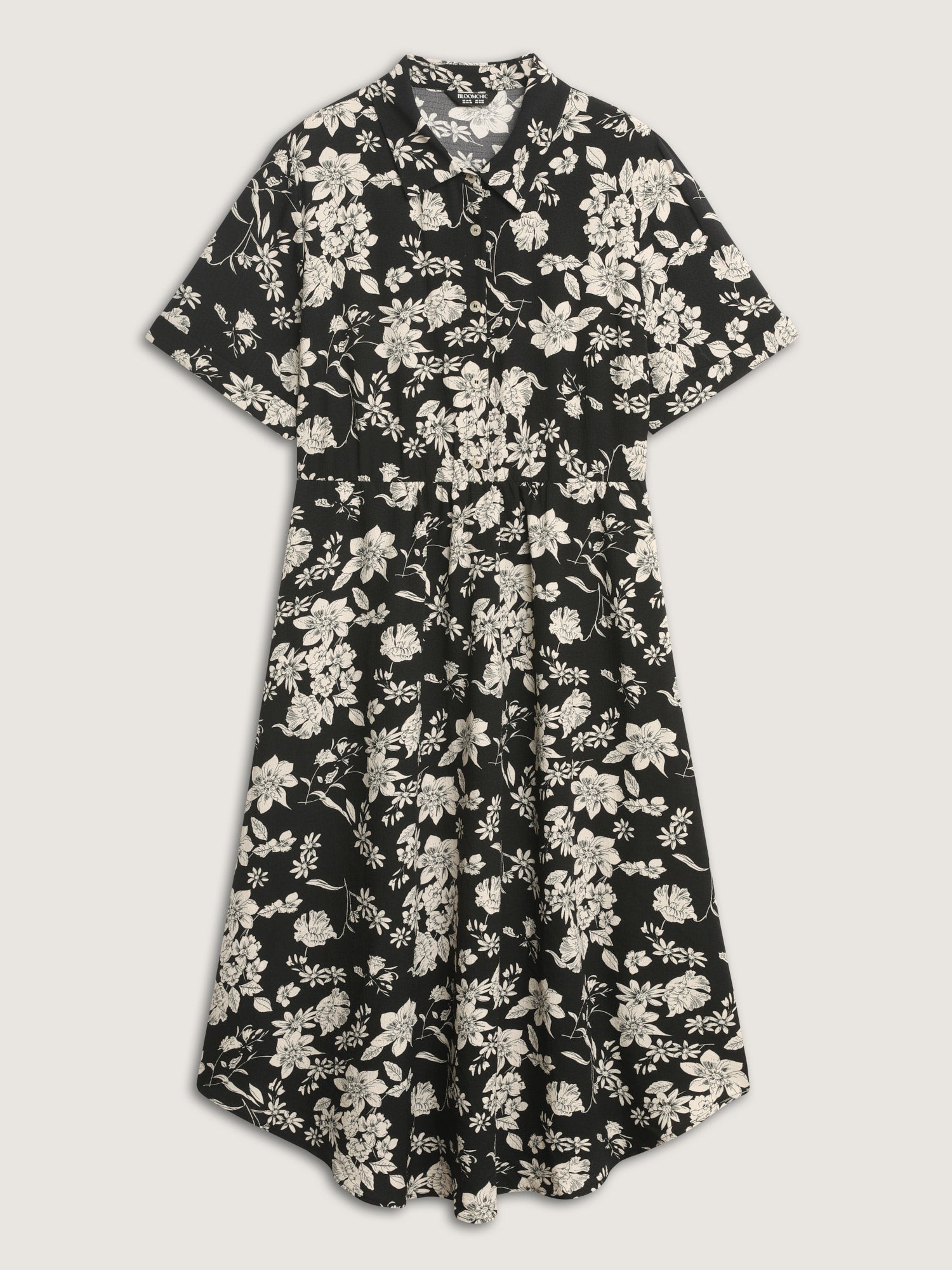Shop Silhouette Flower Print Collar Midi Dress now and redefine your style with confidence at BloomChic. Tailored for mid and plus-size women. This trendy Dress, sizes 10-30. You can never go wrong with BloomChic Dresses. Color:Black;Style:Office;Neckline:Shirt collar;Sleeve Type:Regular Sleeve;Prints:Floral;Pocket:Side seam pocket;Belt:No-belt;Closure Type:Non